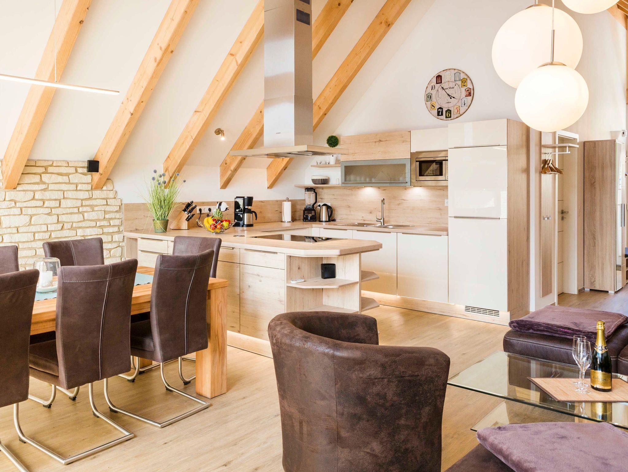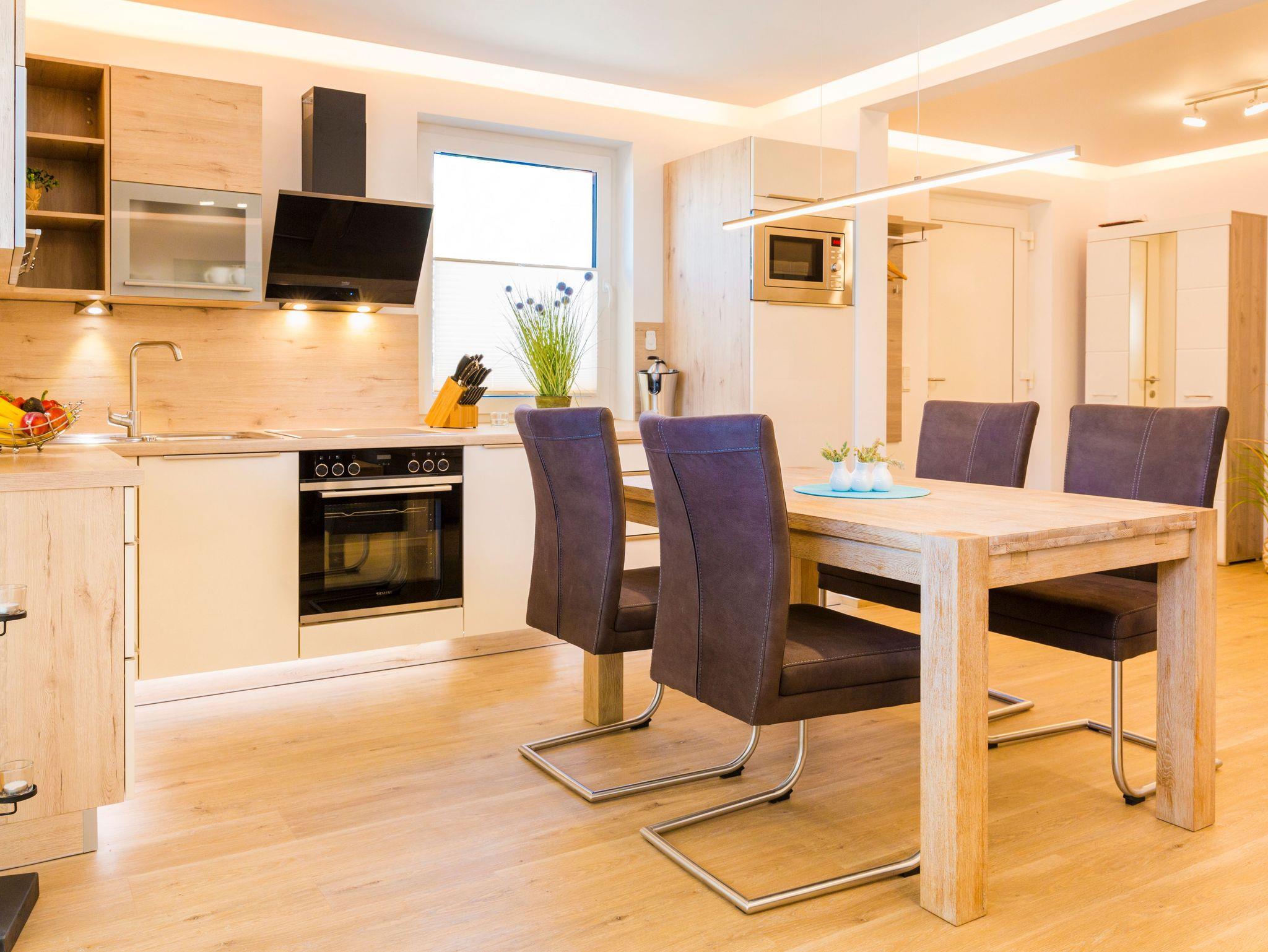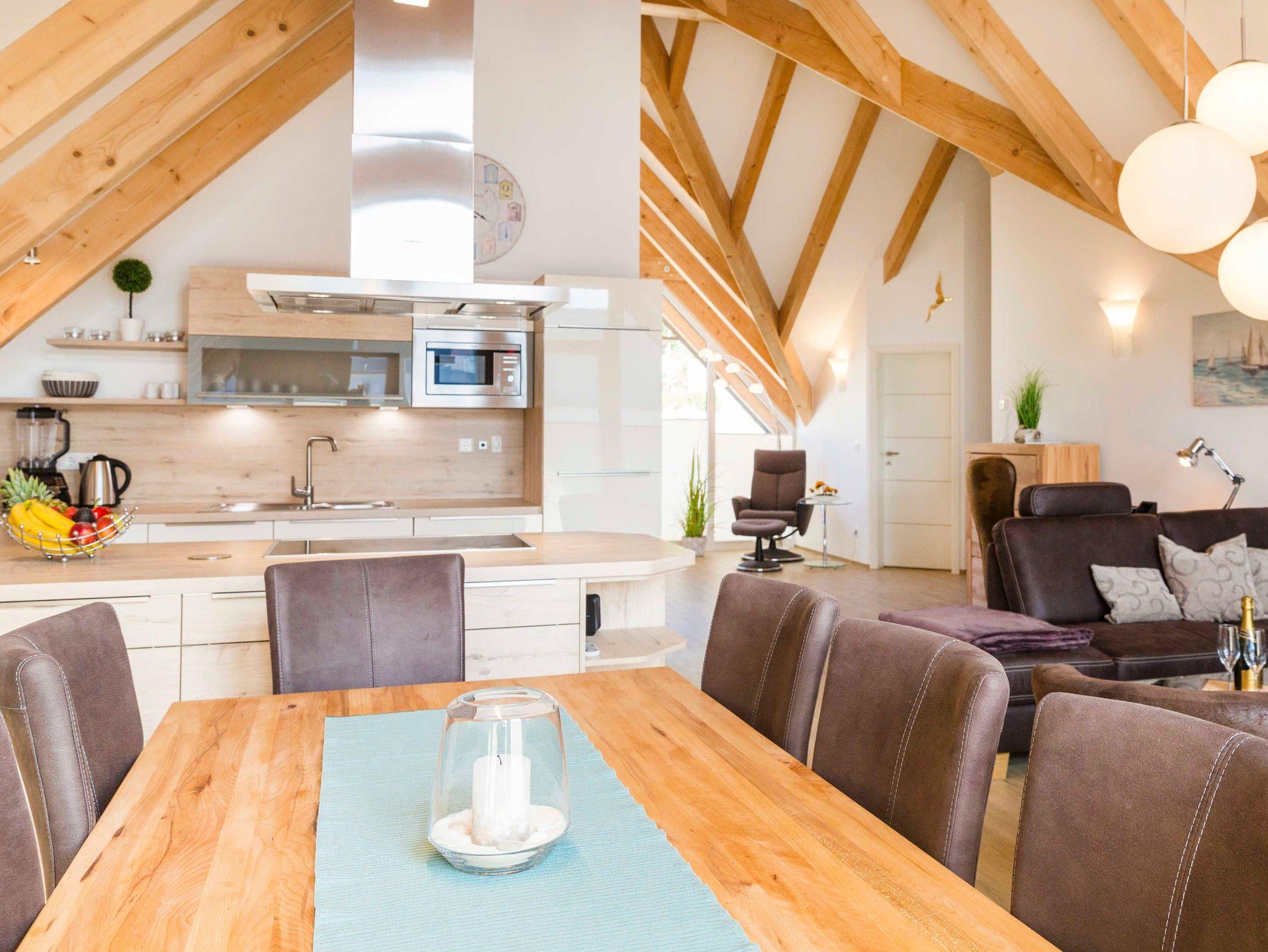 Fühlen Sie sich in dem rund 70 m² Wohn-, Dielen- und Küchenbereich wohl und nehmen Sie auf bequemen Sitzgelegenheiten Platz. Im angrenzenden Essbereich haben bis zu 8 Personen auf bequemen Schwingstühlen ausreichend Platz. Auch ein Hund ist in der großen Ferienwohnung auf dem mitgebrachten Schlafplatz erlaubt.
