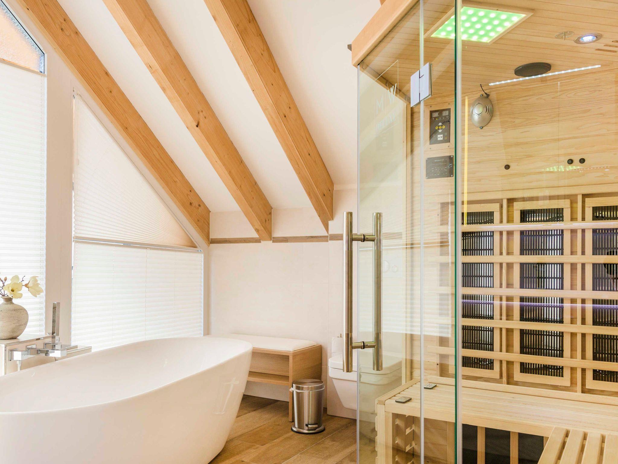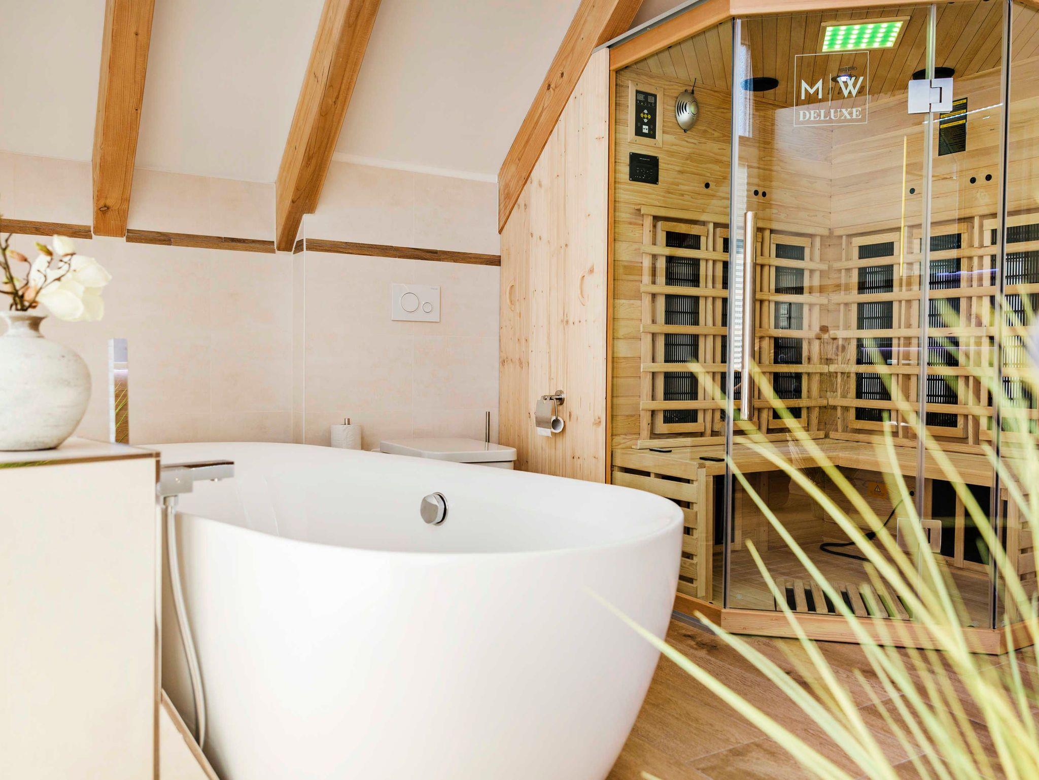 Die Wohnung bietet Ihnen 2 Badezimmer und ein zusätzliches WC. Das große Badezimmer ist mit einer freistehenden Badewanne, einem doppelten Waschtisch mit Spiegelschrank sowie einer Walk-In Dusche mit zusätzlicher Regendusche ausgestattet. Wer etwas länger in der tollen Badewanne zur Ruhe kommen möchte, freut sich sicher auch über den dort vorhandenen 55 Zoll Flachbild-Smart-TV (4K). Ein besonderes Highlight ist die Vollspektrum-Infrarotkabine mit Glasfront.