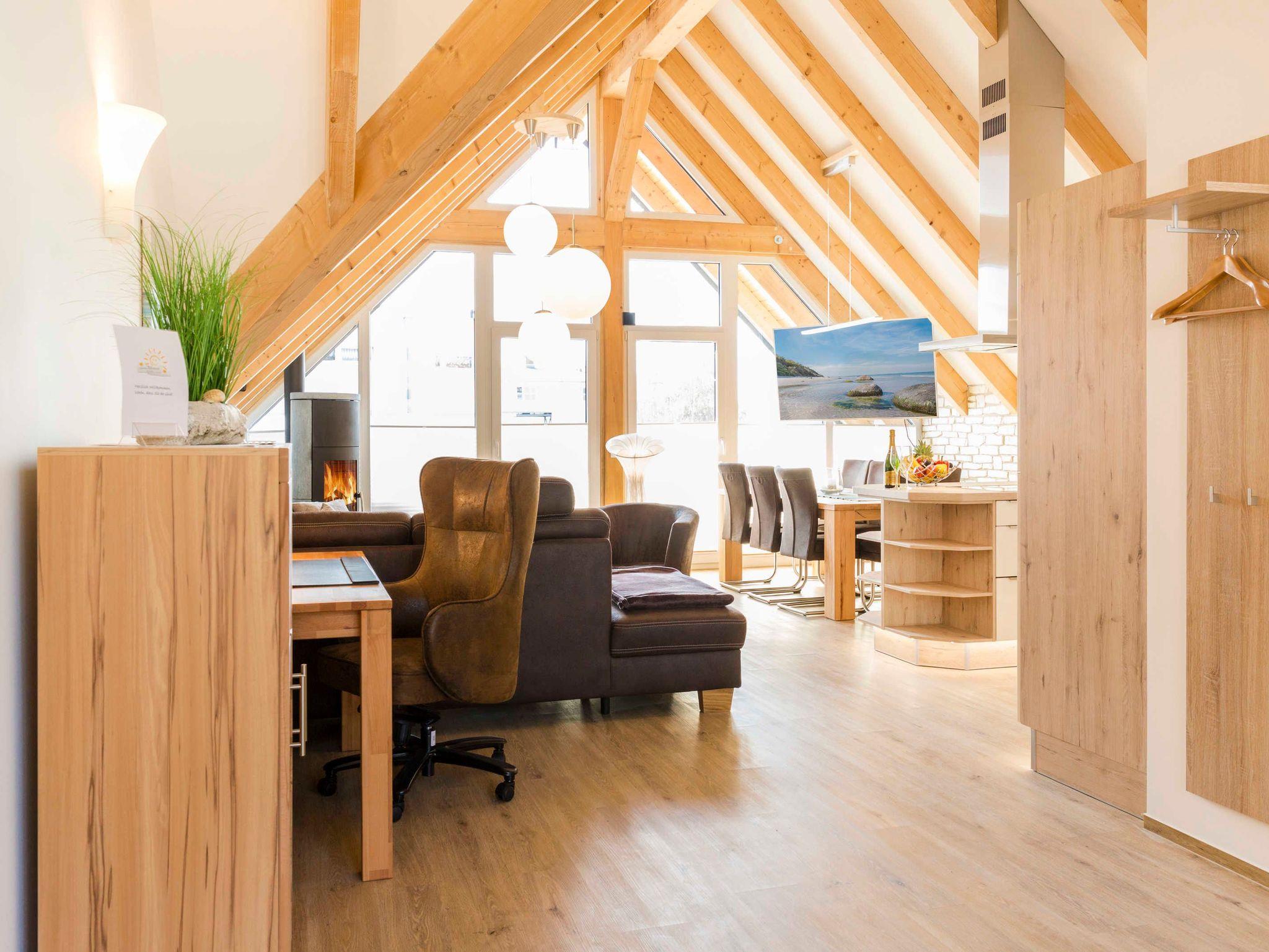 Im Obergeschoss befindet sich die tageslichtdurchflutete, komfortable und hochwertig eingerichtete Ferienwohnung ,,Möwenglück??. Auf 126 m² Wohnfläche mit Fußbodenheizung können Sie hier einen Urlaub der Extraklasse richtig genießen.