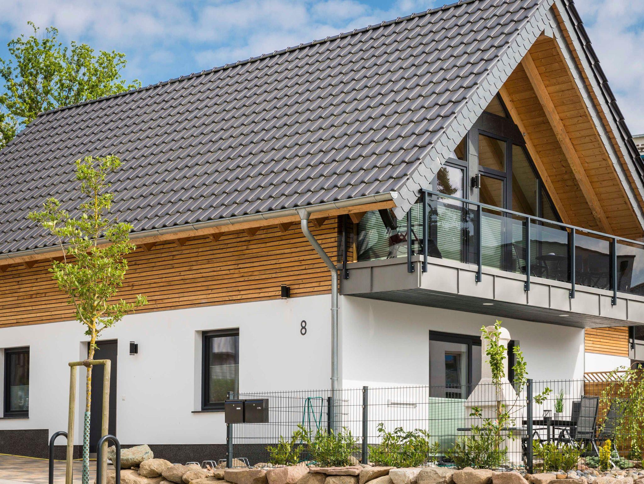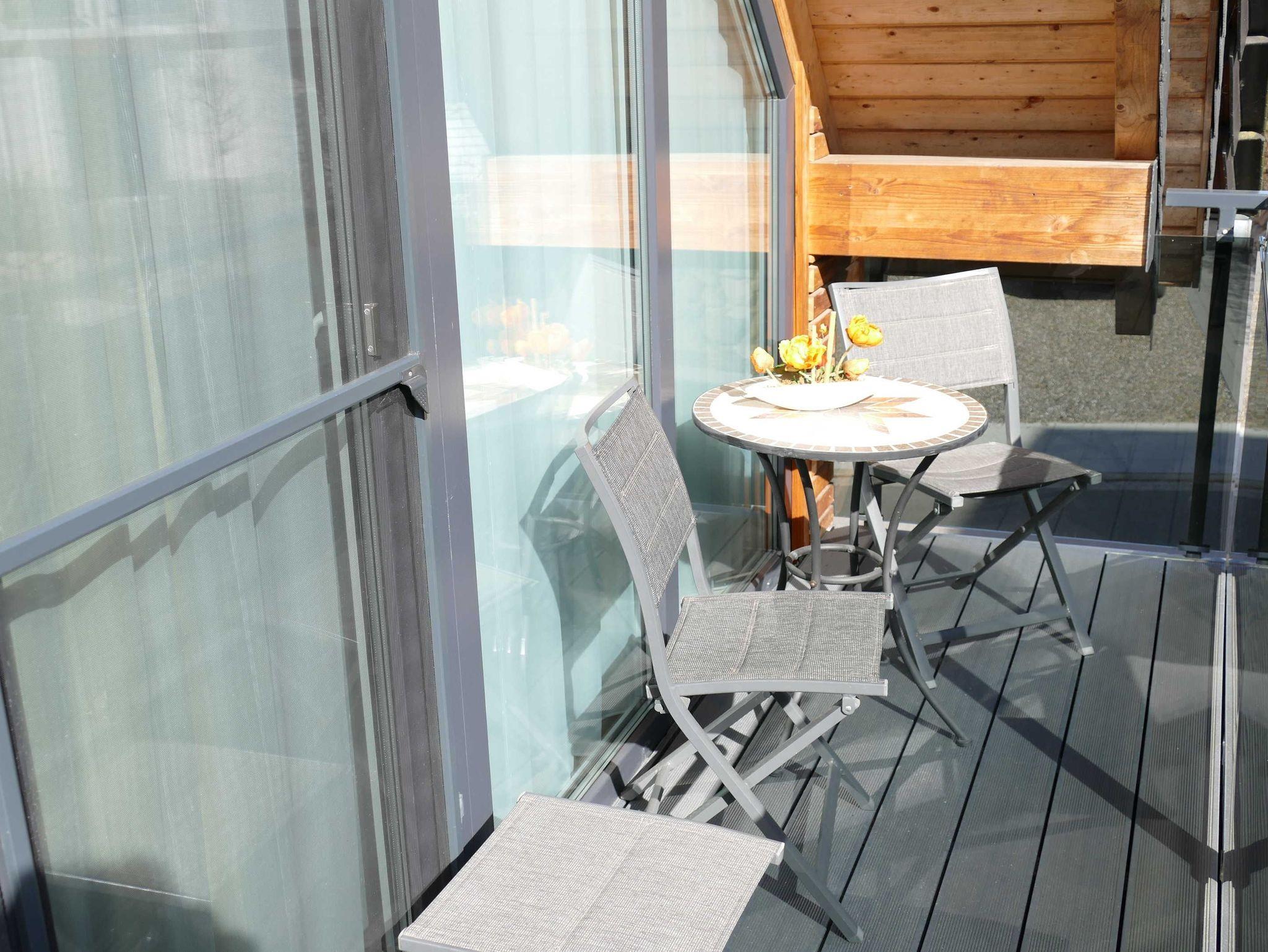 Die Ferienwohnung Möwenglück im Obergeschoss ist durch ihre drei Glasgiebel lichtdurchflutet und beeindruckt durch ihre großzügige, offene Bauweise. Sie ist über eine Außentreppe erreichbar. Die 3 Balkone sind nach Osten, Süden und Westen ausgerichtet.