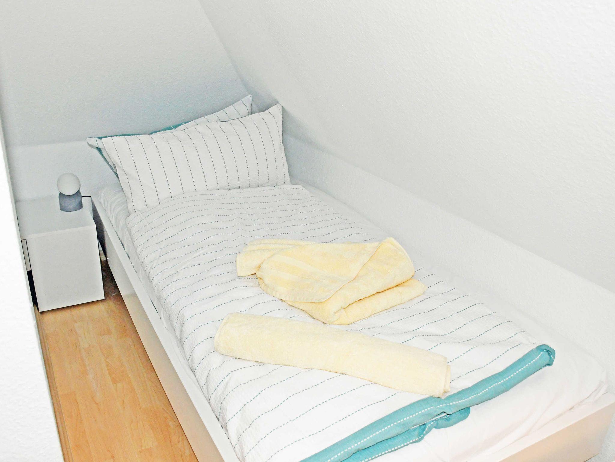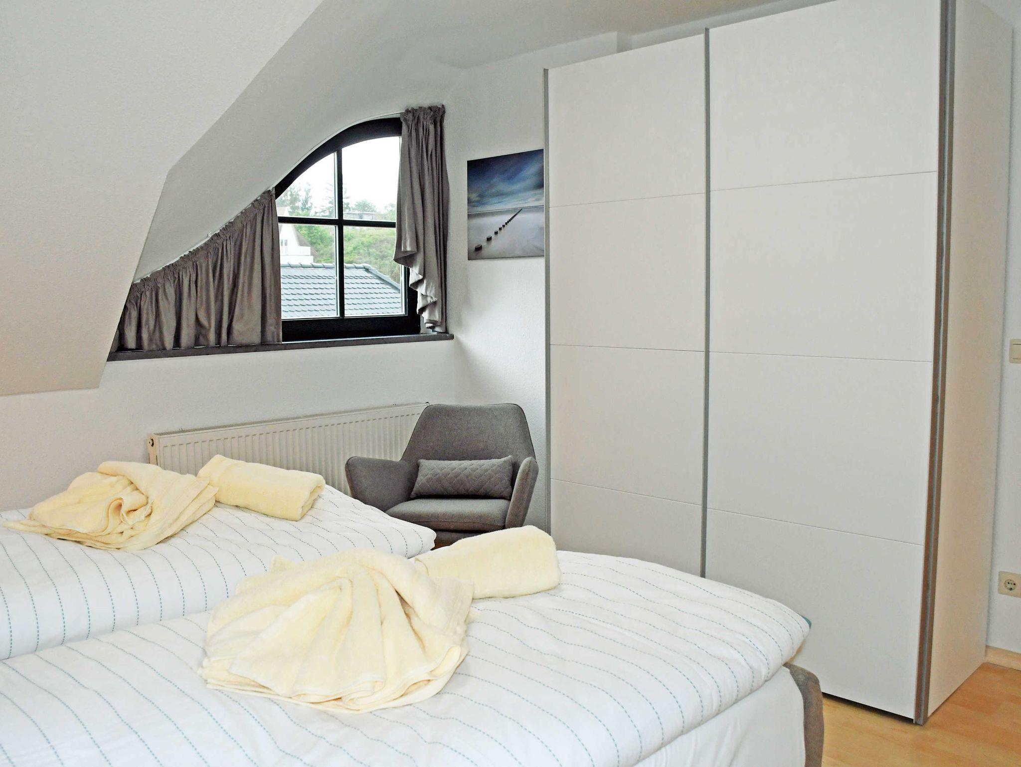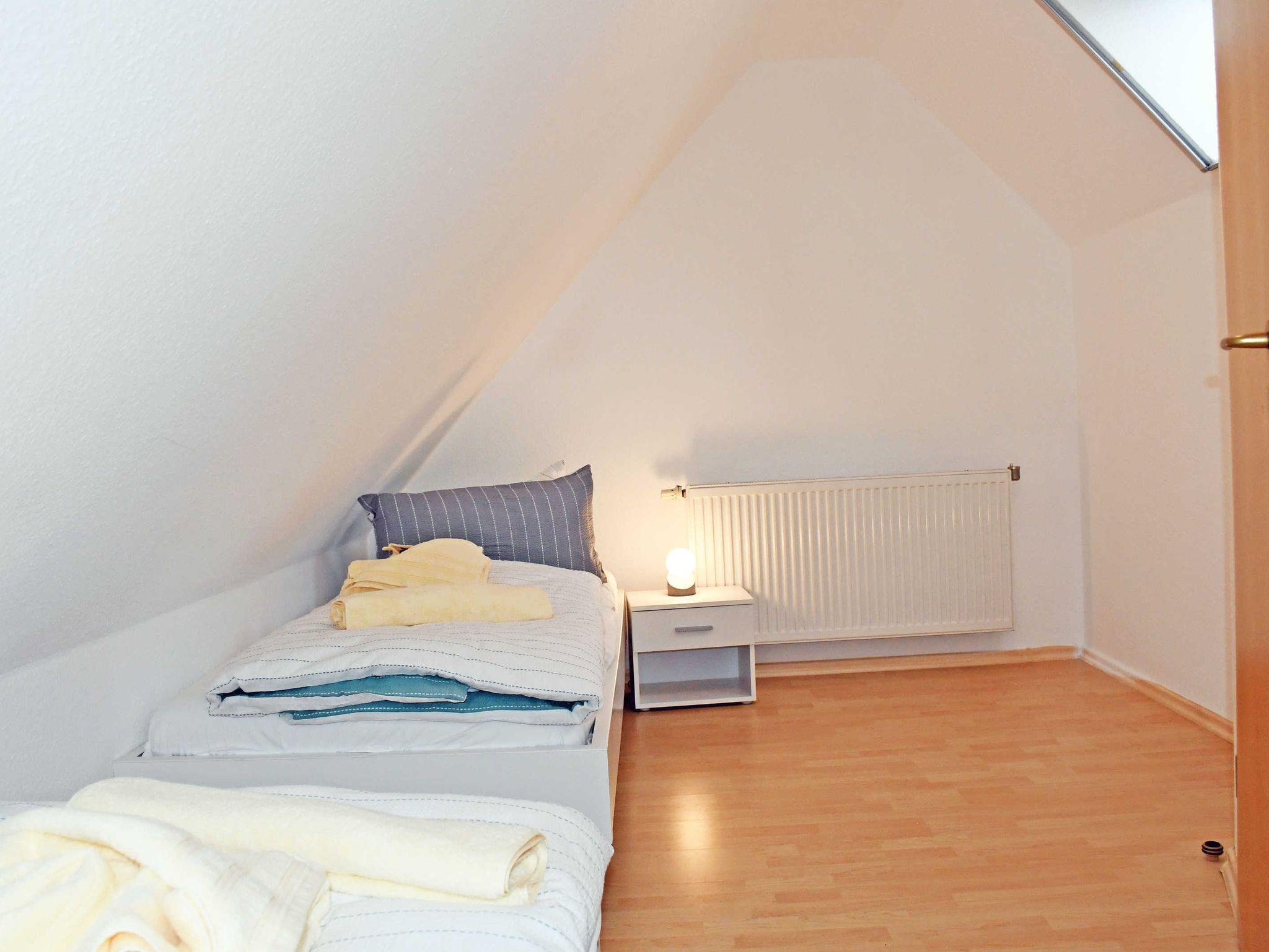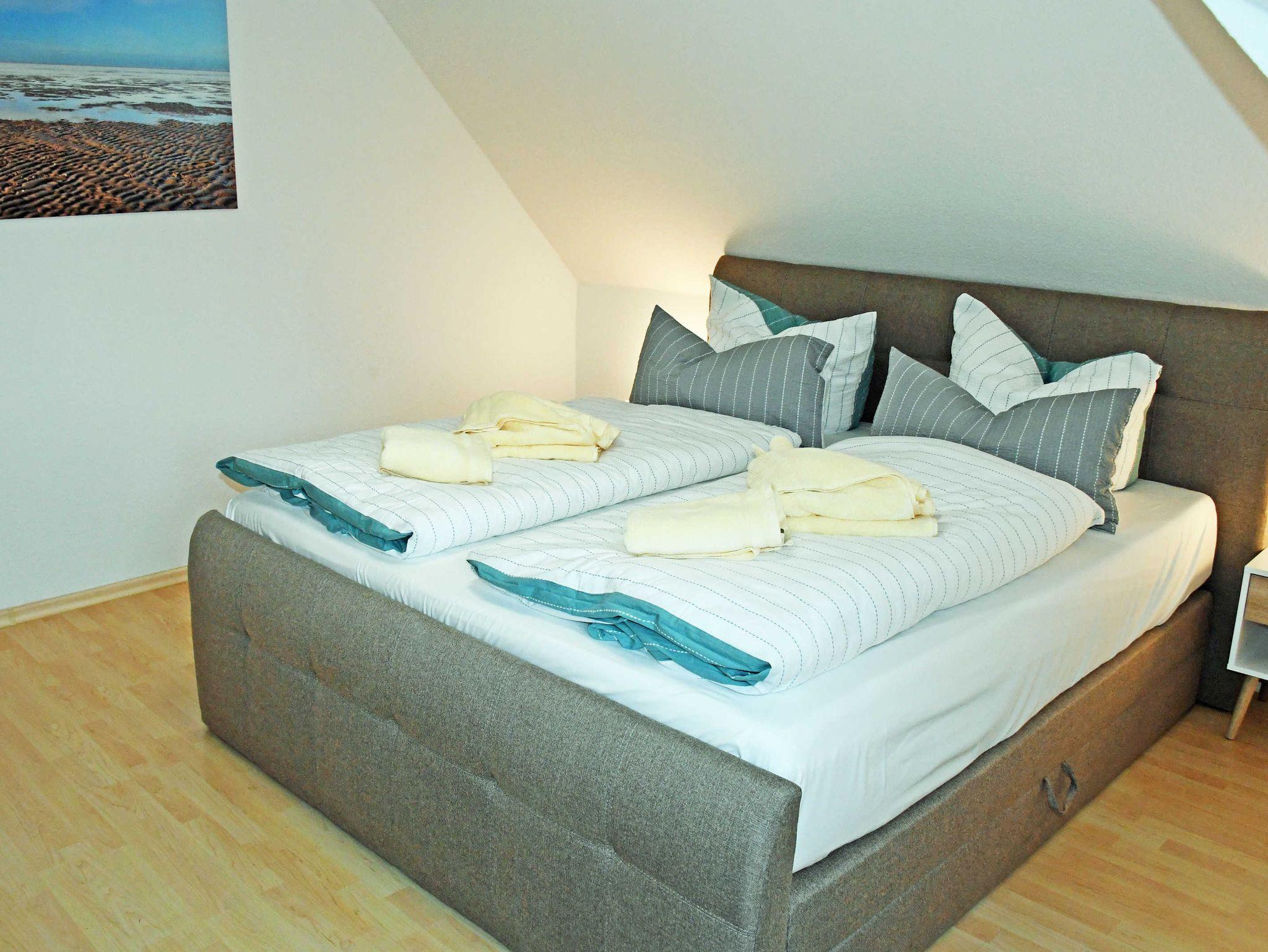 Im 1. Schlafzimmer befinden sich ein bequemes Doppelbett mit Nachttischen und Leselampen sowie einem Kleiderschrank. Auf Wunsch kann hier ein Kinderreisebett und ein Hochstuhl bereit gestellt werden. Das 2. Schlafzimmer befindet sich im Dachgeschoss, hier stehen 3 Einzelbetten.