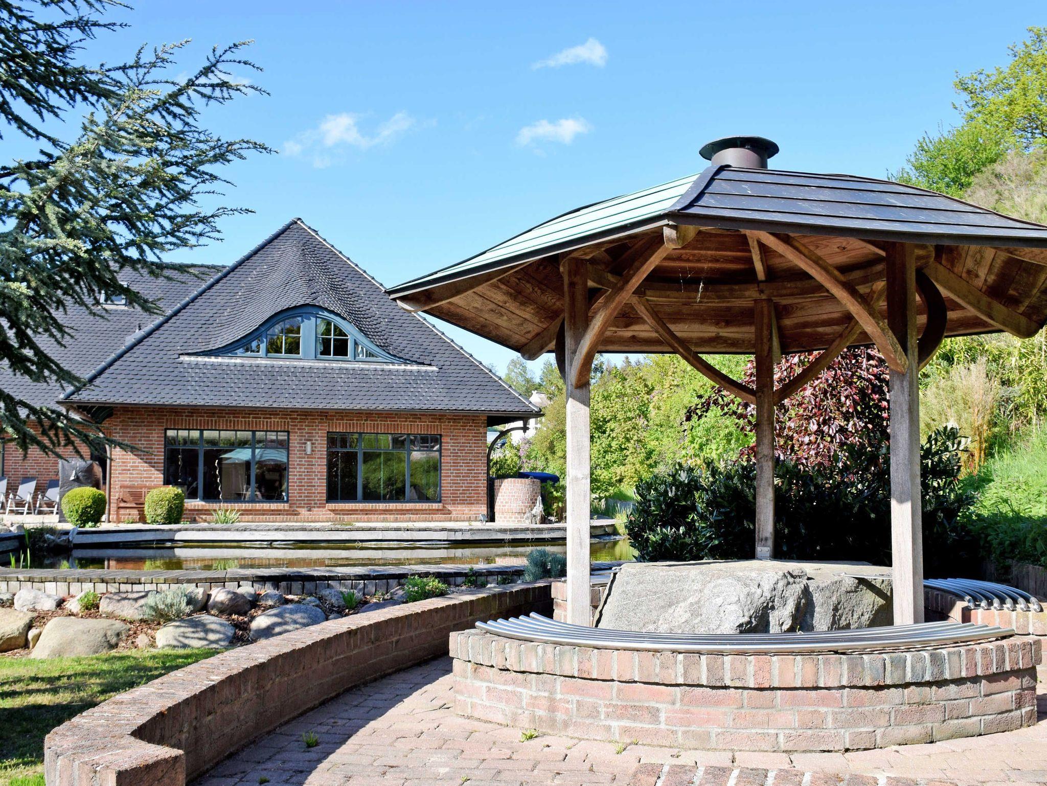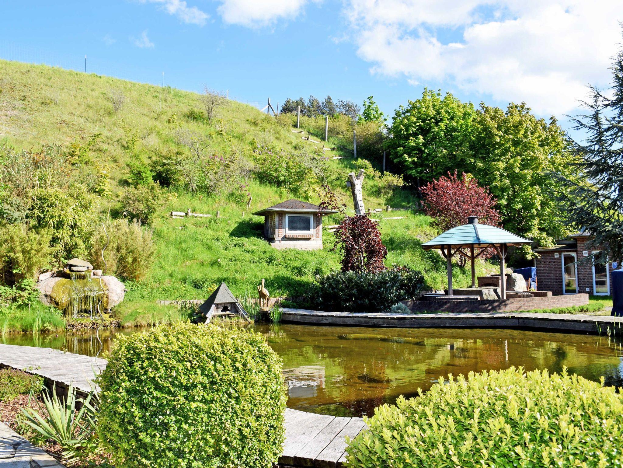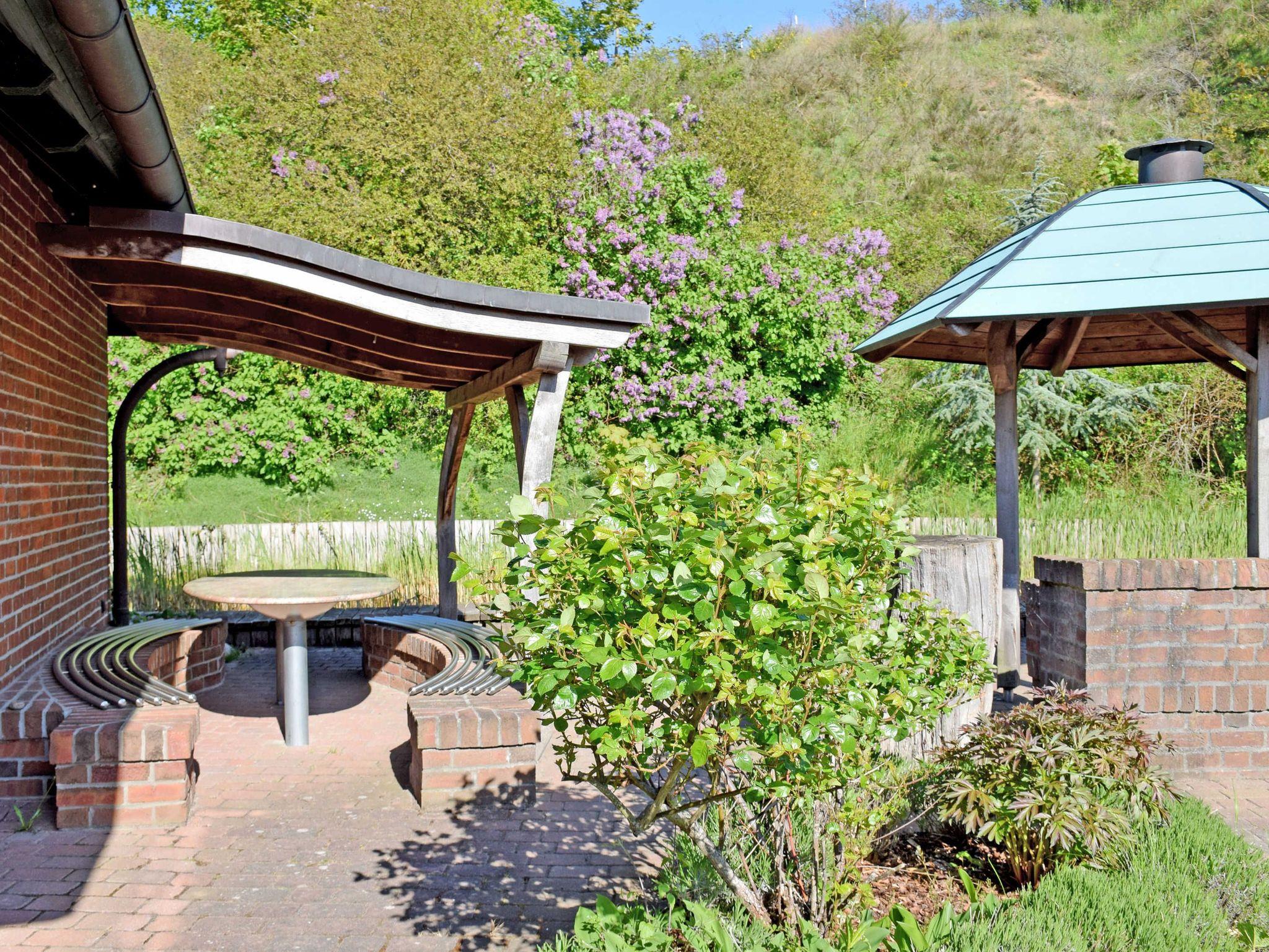Am Haus können Gäste der Ferienwohnung eine Terrasse mit Gartentisch, Strandkorb und Sitzmöbeln nutzen. Ein Grillplatz kann gemeinschaftlich mit anderen Gästen der Ferienanlage genutzt werden.