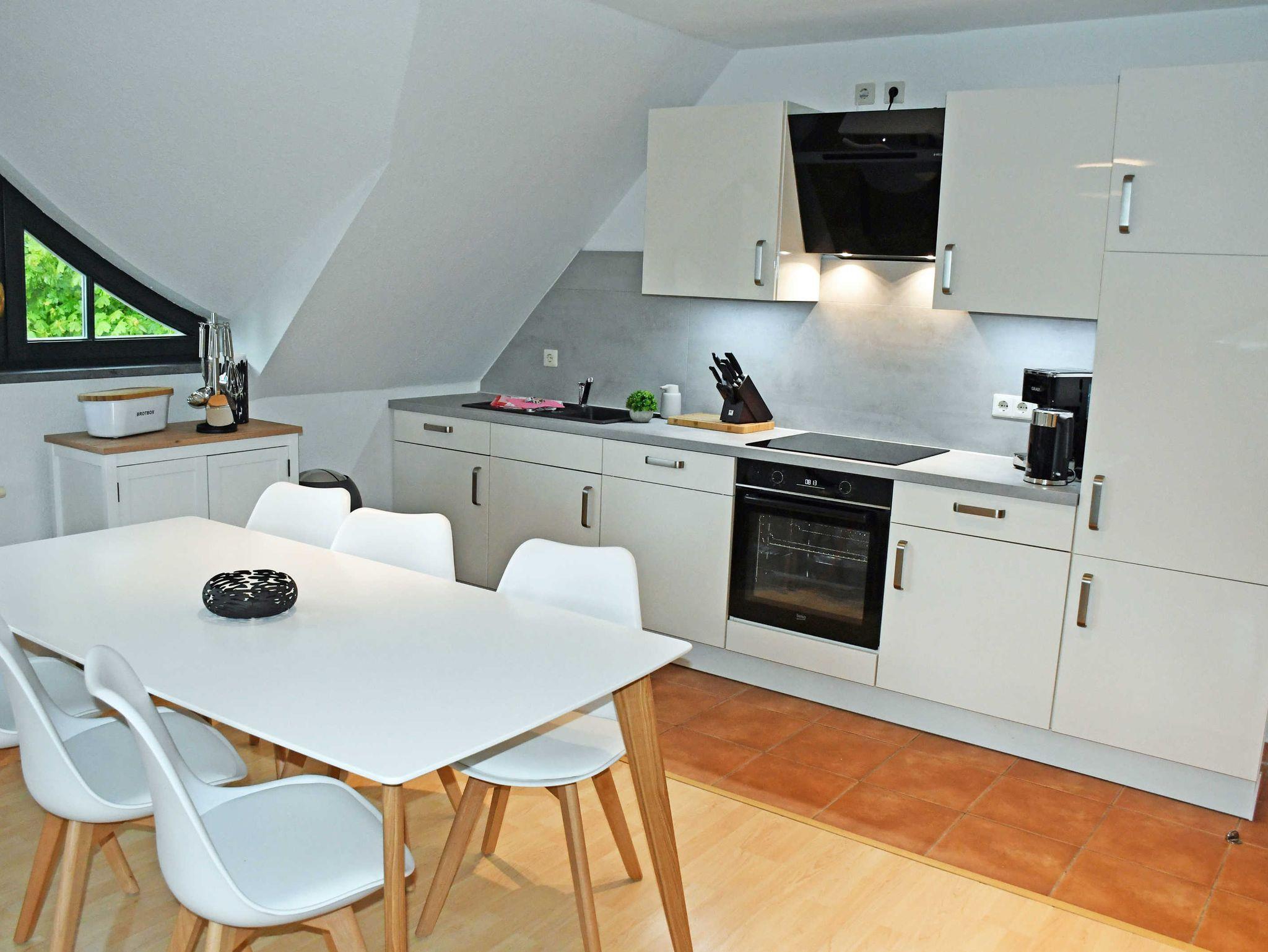 Im Wohnraum (1. OG) stehen eine große Couch, ein Tisch mit Sesseln und ein modernes Flachbild-TV-Gerät. Die Küchenzeile im Wohnbereich, ist mit Elektroherd mit Ceranfeld, Backofen, Kühlschrank mit Gefrierfach, Kaffeemaschine, Wasserkocher, Toaster komplett ausgestattet. Hier steht auch ein großer Esstisch mit Stühlen.