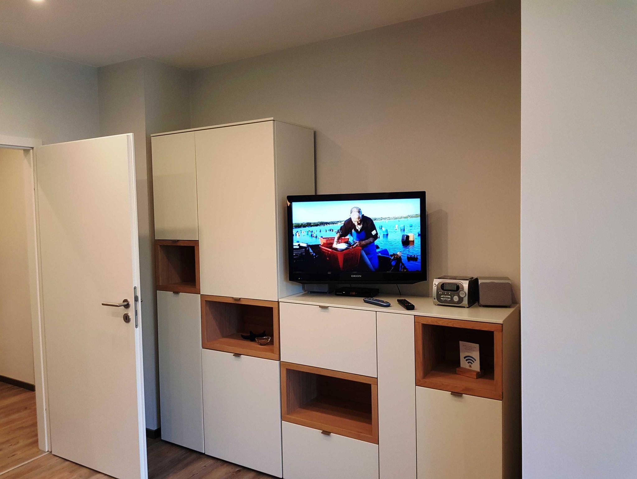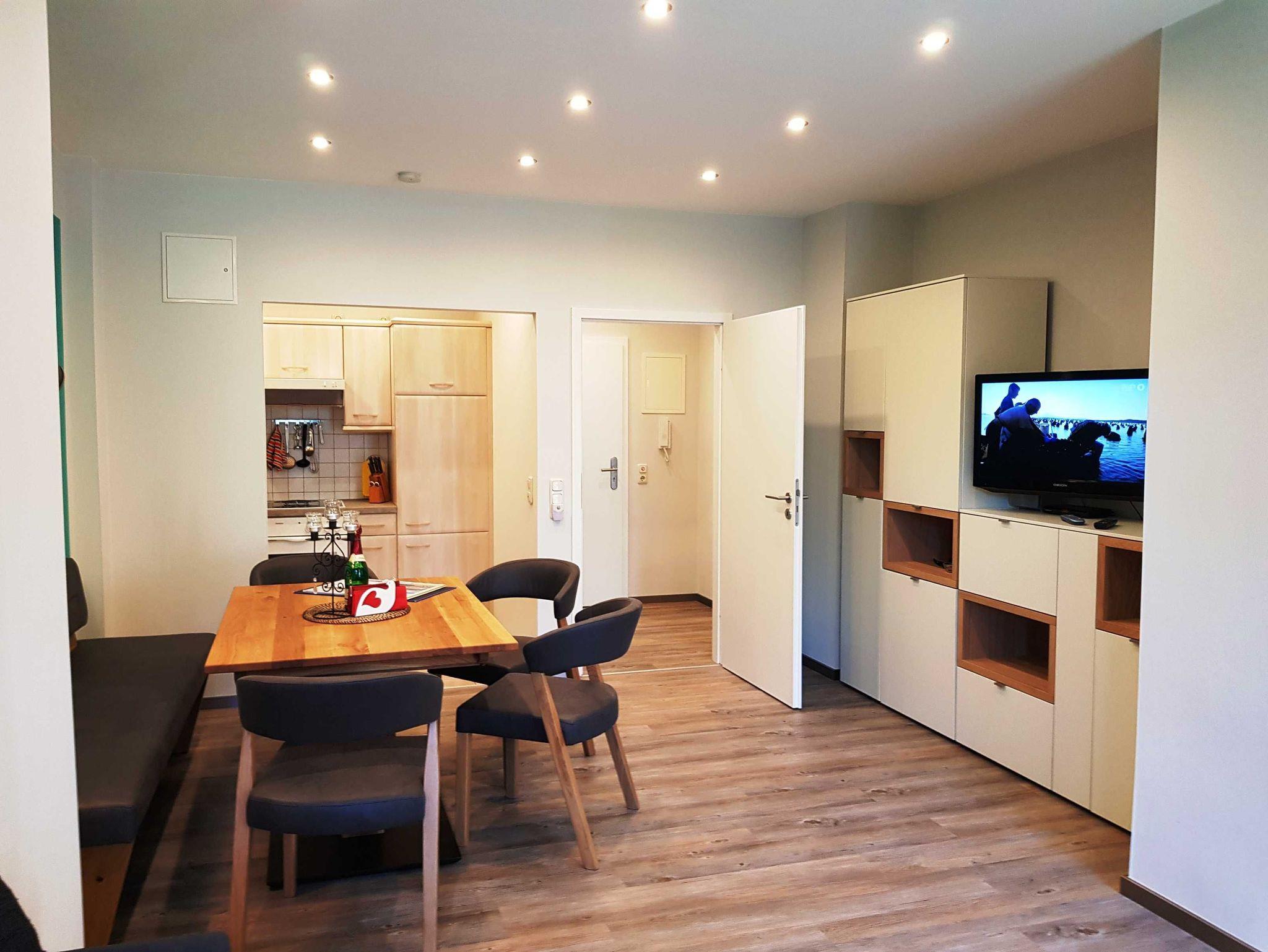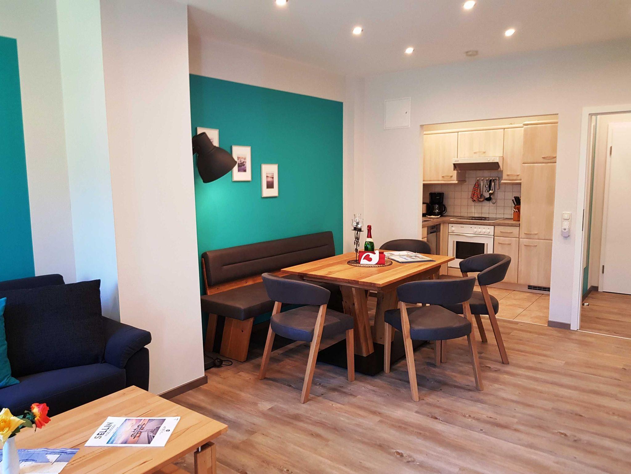 Wohnung mit 2 Schlafzimmern und 2 Boxspringbetten. Großes Wohnzimmer mit Esstisch für 6 Personen.