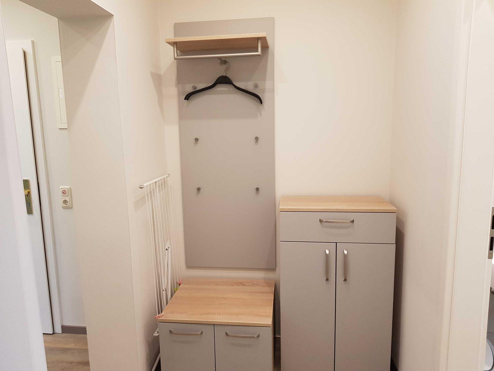 Möblierter Balkon mit Zugang zum Garten und Grill. Große stufenlose Regendusche.