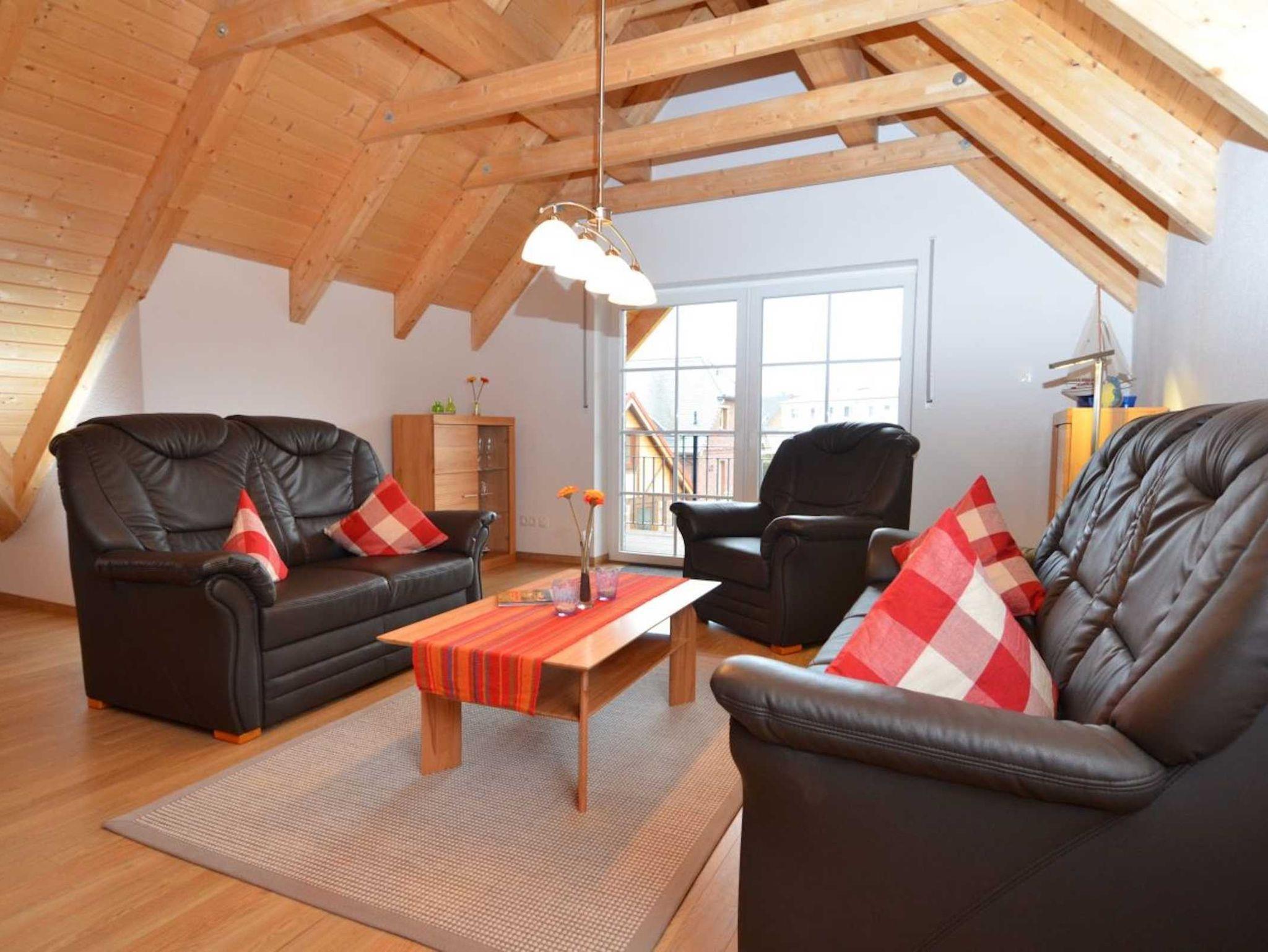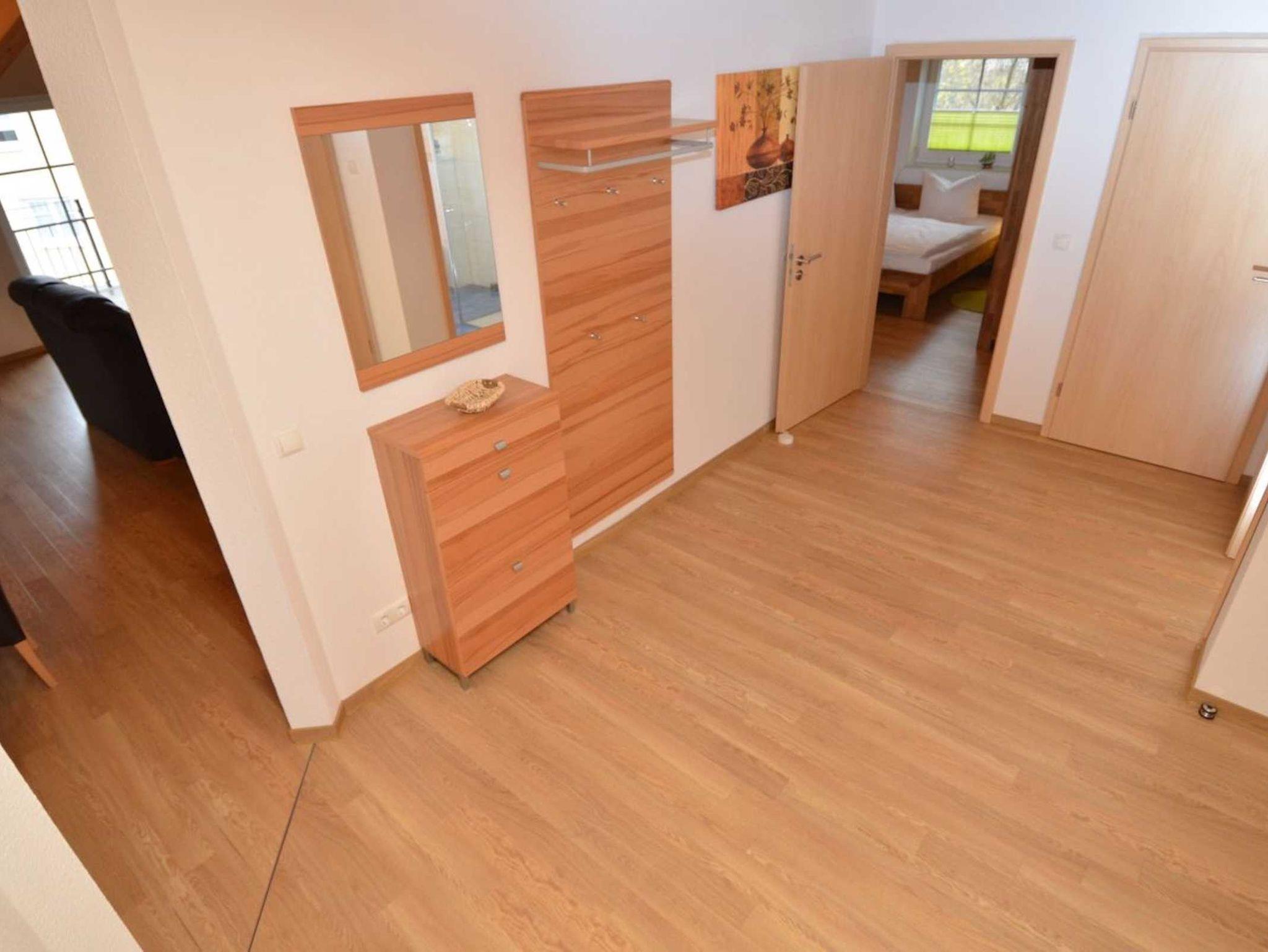 Das 3-Raum-Appartement mit ca. 80 qm Wohnfläche befindet sich im OG des Hauses. Der große, offene Wohn-/Essbereich ist ausgestattet mit einer gemütlichen Couchgarnitur, LCD-TV, Bluray-Player und einer Stereoanlage. Die im Wohnbereich harmonisch integrierte Küchenzeile verfügt über einen Kühl-/Gefrierschrank, Cerankochfeld, Backofen, Spülmaschine, Mikrowelle, Kaffeemaschine, Wasserkocher, Toaster, Handmixer und div. Kleinutensilien. 2 Schlafzimmer mit je 1 Doppelbett bieten ausreichend Stauraum für Ihre Garderobe. Eines der Schlafzimmer verfügt über einen LCD-TV. Alle Räume haben leichte Dachschrägen. Die sichtbaren Holzbalken im Wohn-/Essbereich reichen bis in die Giebelspitze, wo sie für eine besondere, gemütliche Wohnatmosphäre sorgen. Das Bad ist mit einer bodengleichen Dusche ausgestattet. Der bestuhlte, überdachte Balkon ist zur Südseite ausgerichtet. Eine eigene bestuhlte Grillterrasse befindet sich im Garten. Das Nichtraucherappartement ist für 1-4 Personen geeignet.