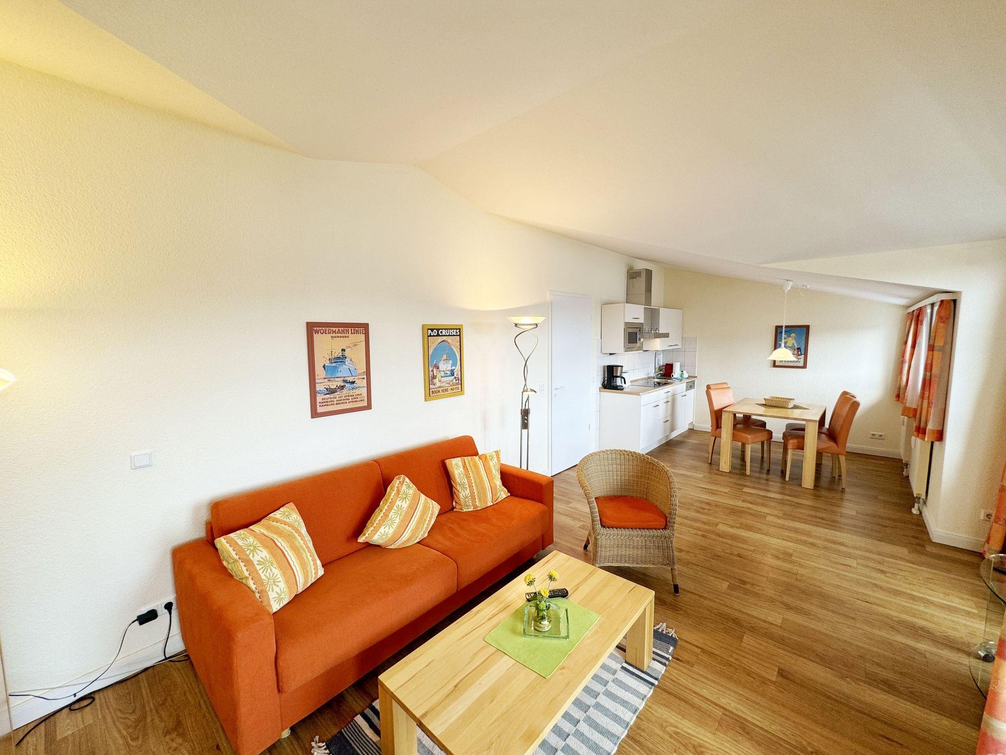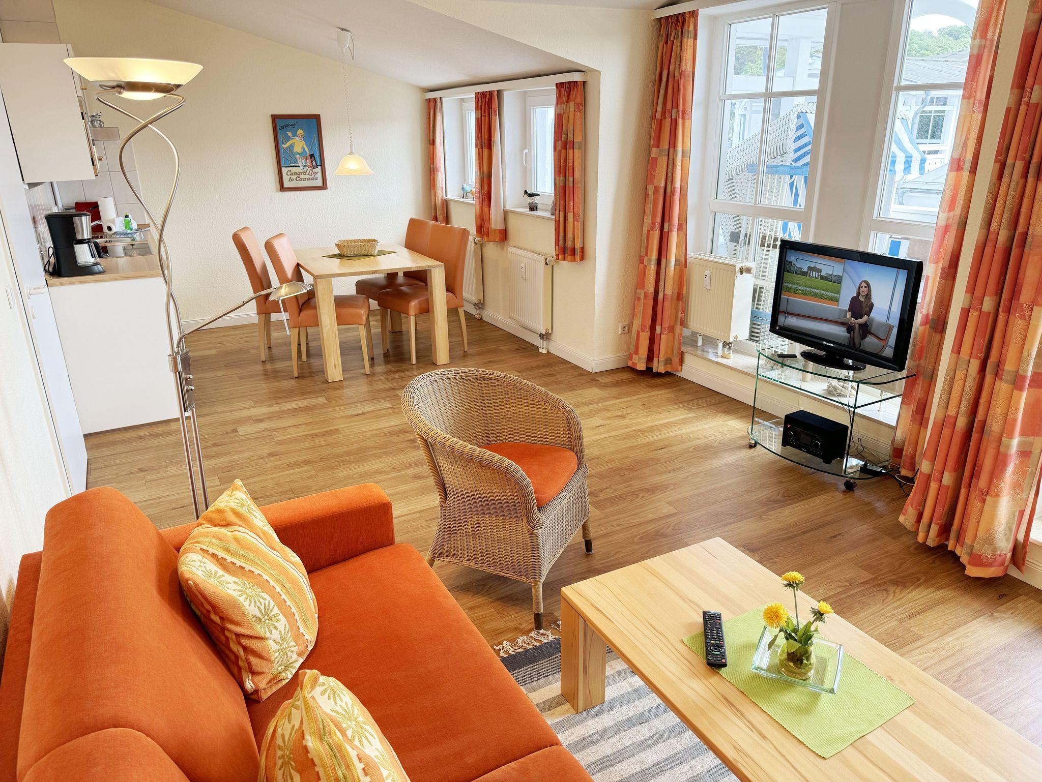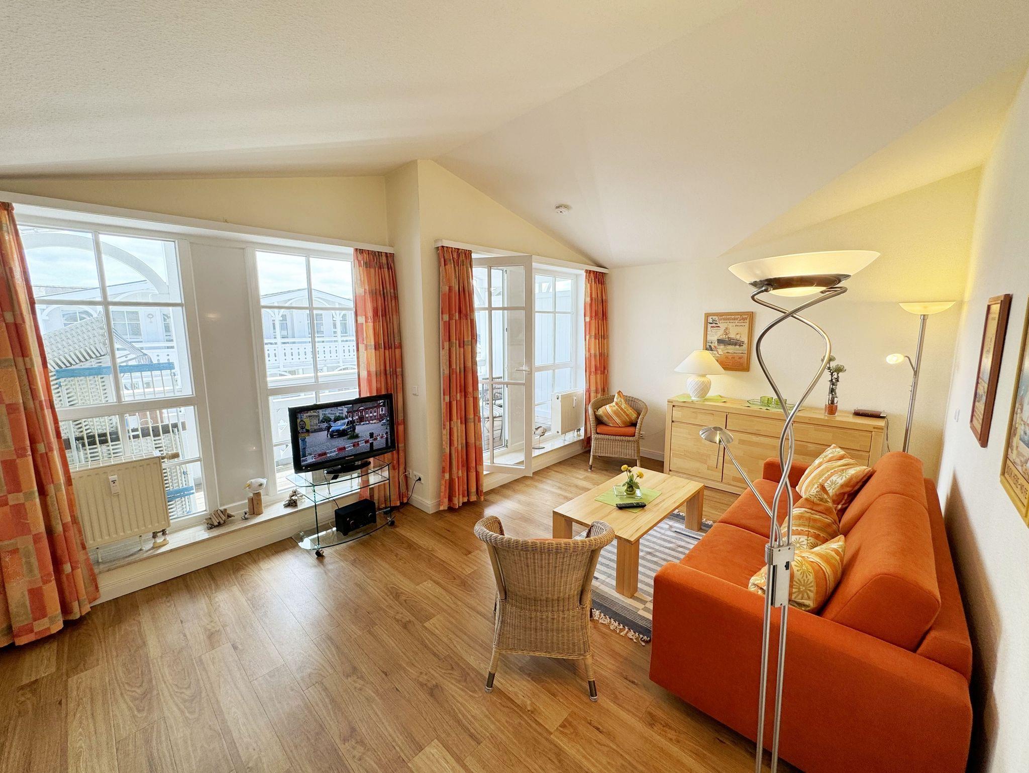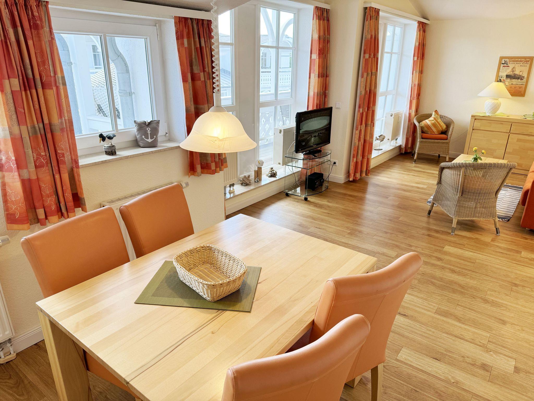 Die Wohnung Deichkieker befindet sich im Dachgeschoss. Der gepflegte Seepark Sellin mit seinen weißen Häusern wurde 1997 in klassischer Bäderarchitektur erbaut. Die in der Anlage beginnende Seeparkpromenade führt Sie bequem zum Ortskern über die anschließende Wilhelmstraße direkt zum Strand und der berühmten Seebrücke. Der Südstrand ist ca. 750 m entfernt. Nutzen Sie die Bäderbahn als Shuttle zu den beiden Stränden. Der Seepark bietet zu jeder Jahreszeit einen abwechslungsreichen und erholsamen Aufenthalt. Nebenan befindet sich das ganzjährig geöffnete Erlebnisbad Ahoi! mit Wasserattraktionen sowie Sauna- und Wellnessangeboten. Restaurants, Einkaufsmöglichkeiten und die Haltestellen der Schmalspurbahn Rasender Roland, der Linienbusse und der Bäderbahn (mit Kurkarte kostenlos) befinden sich in der Anlage. Spielen sie gerne Mini-Golf? Kein Problem, sie können die Schläger und Bälle im Seepark mieten. Zieht es sie eher an das Wasser? Von der Selliner Seebrücke können Sie z.B. direkt nach Sassnitz, Binz oder Göhren zum Kaffeeplausch und Flanieren übersetzen oder Sie entscheiden sich für eine Rundfahrt und kreuzen Richtung Kap Arkona zur legendären Kreideküste mit seinem spektakulären Königsstuhl. Noch schneller am Wasser sind Sie am Selliner See. Die Abendsonne taucht die Zickerschen Berge und den Selliner See in eine wunderschöne Lichtstimmung. Vielleicht reicht das schon, um die Seele baumeln zu lassen, wenn nicht wären die leckeren Fischbrötchen beim Räucherschiff Roland -direkt am See- ein Geheimtipp.