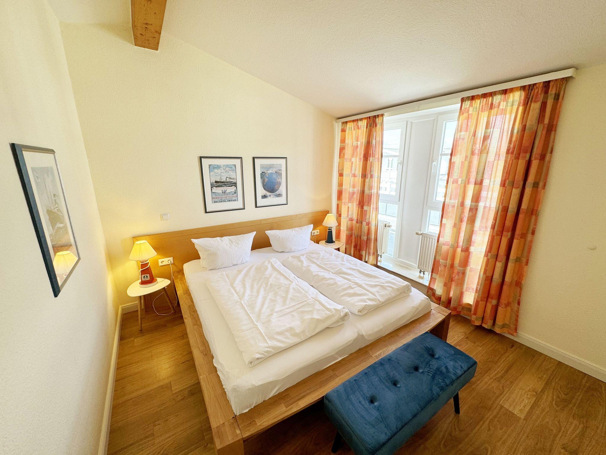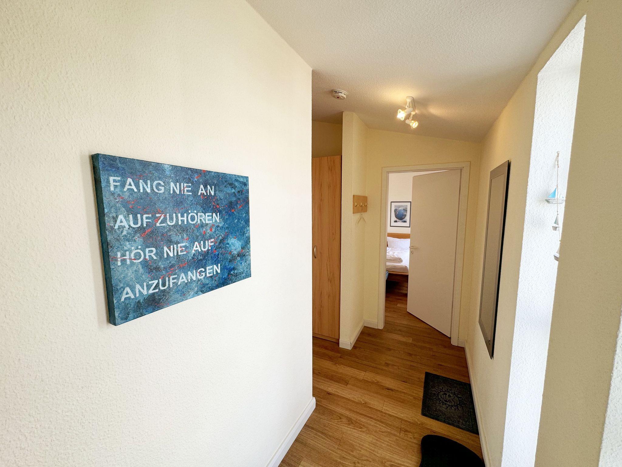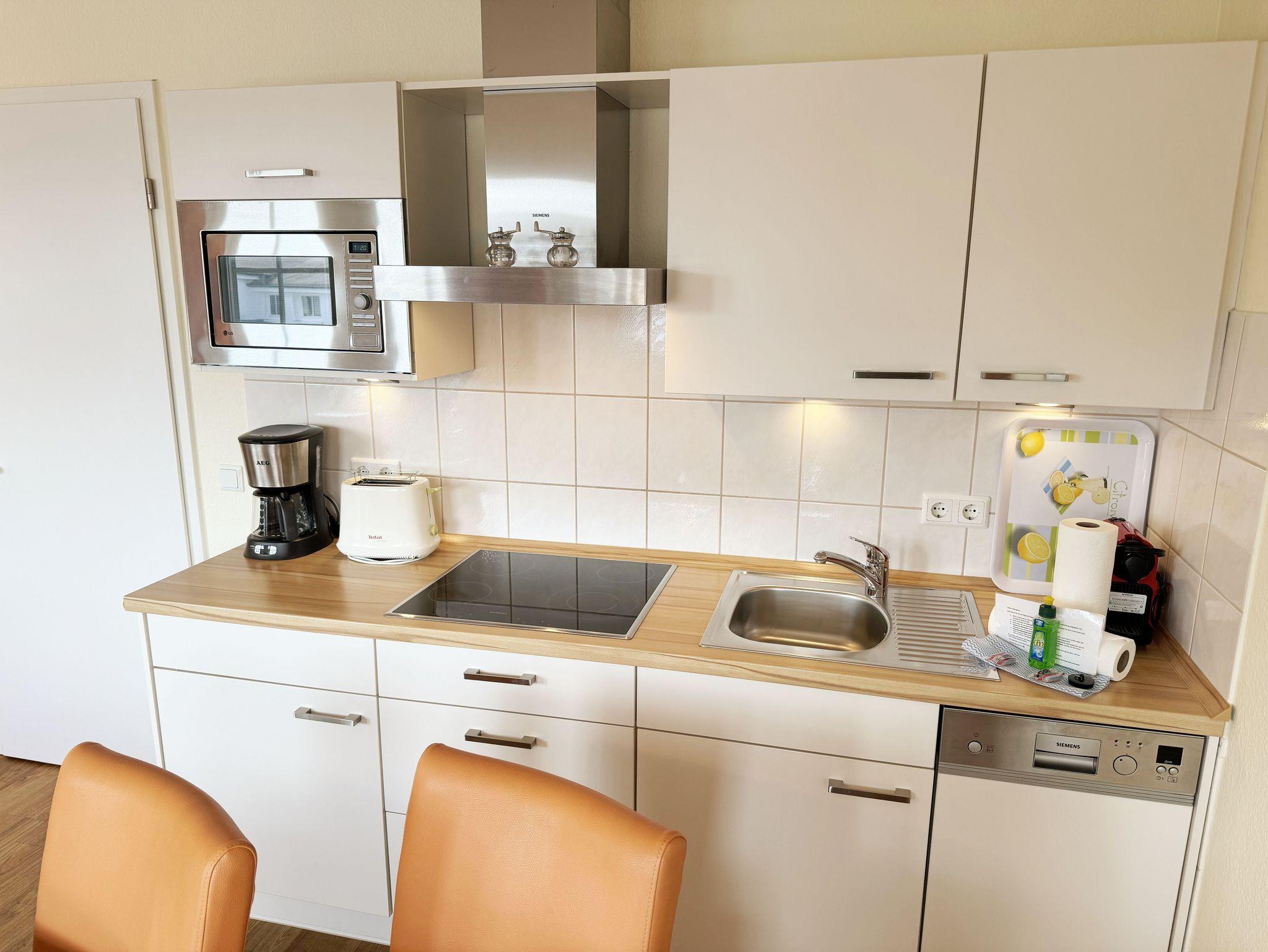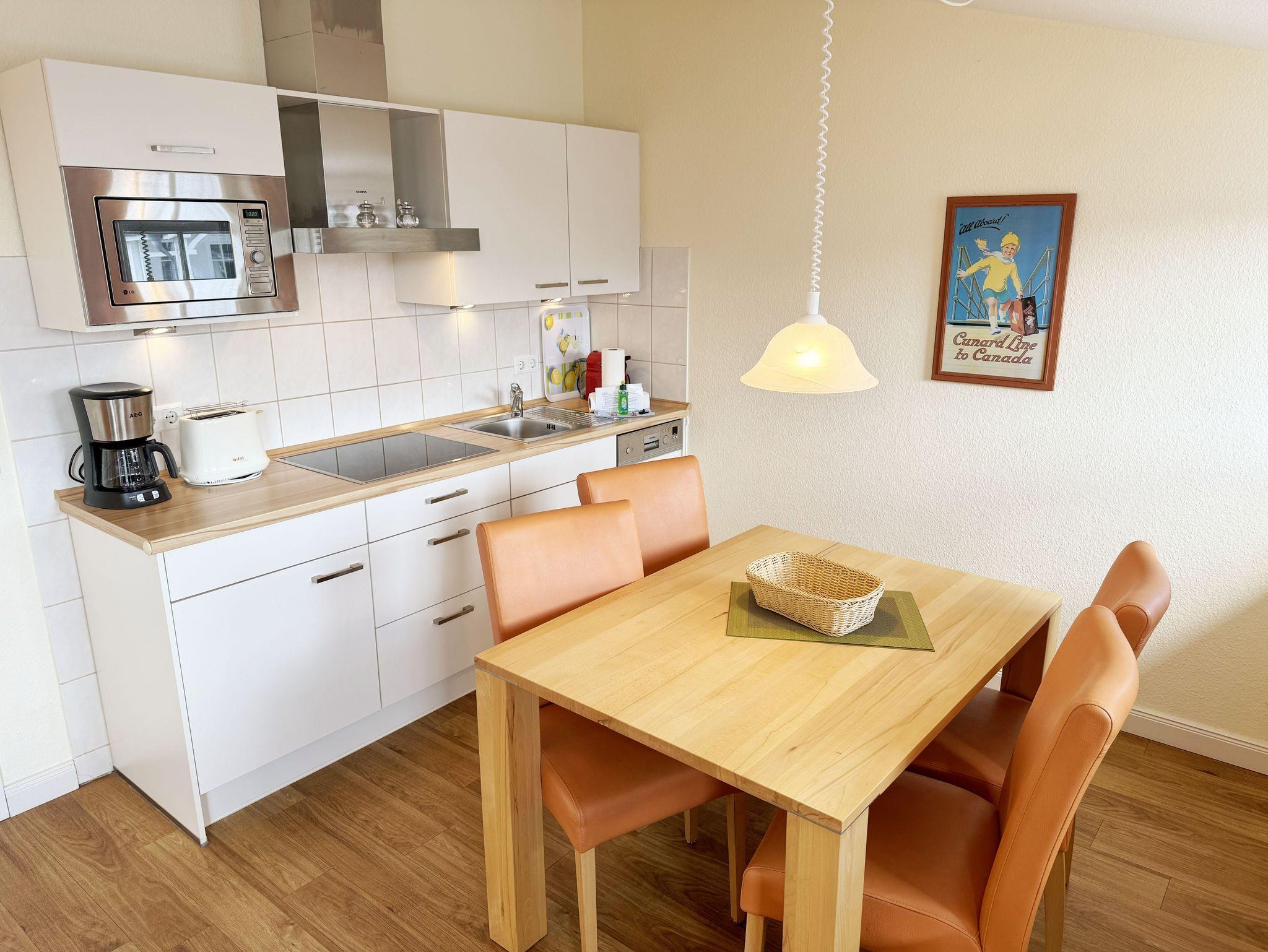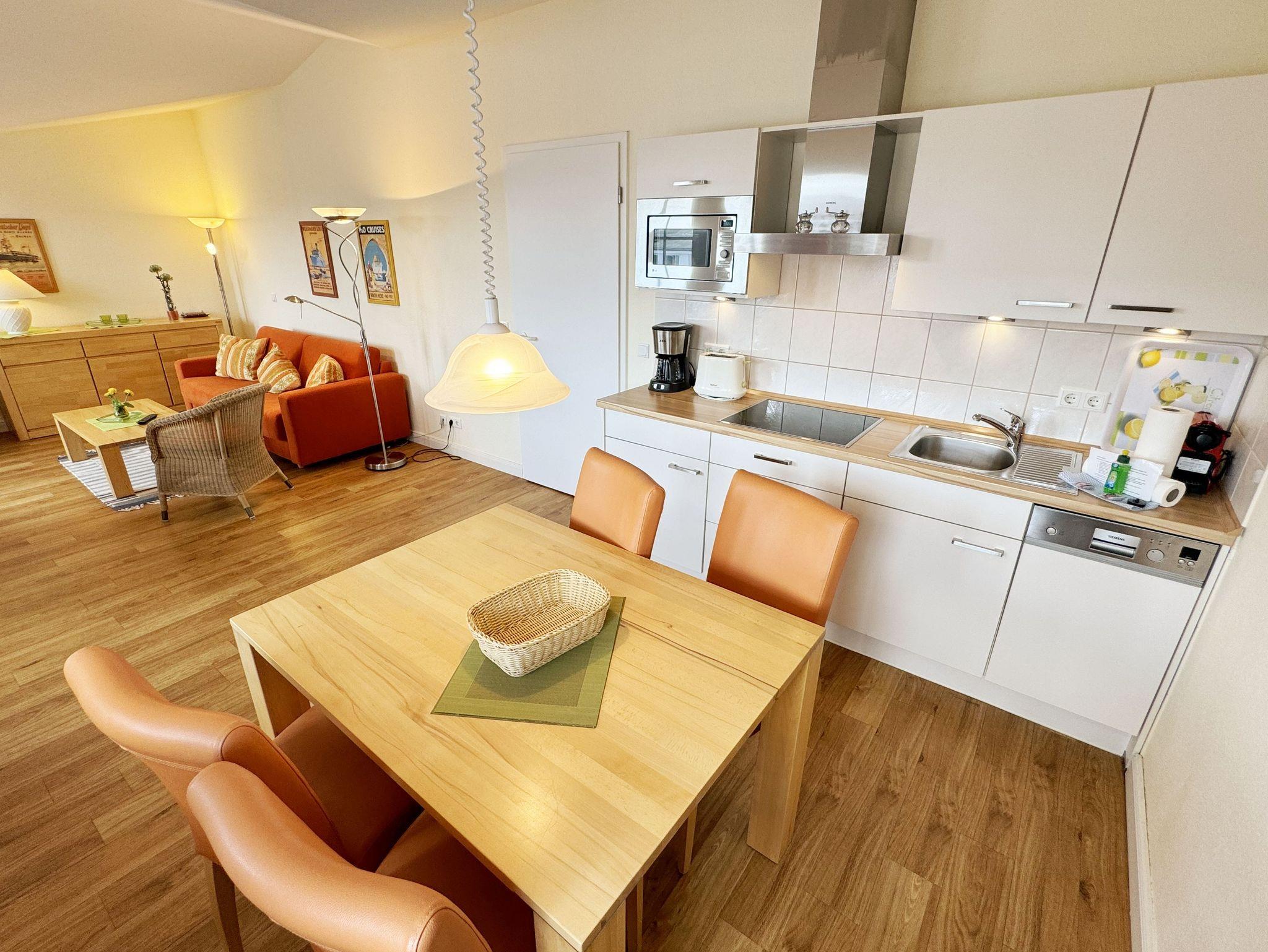 Die lichtdurchflutete Penthouse Ferienwohnung ?Deichkieker? (Nr. 523) ist eine Nichtraucherwohnung. Sie befindet sich in der 3. Etage (Dachgeschoss) des Hauses. Sie ist mit ca. 57 m² komfortabel und geräumig und bietet Platz für max. 2 Erwachsene + 1 Kleinkind bis 3 Jahre im Kinderreisebett. In der Wohnung finden Sie einen kombinierten Wohn-/Koch- und Essbereich. Die integrierte, moderne Küchenzeile lässt mit einer eingebauten Mikrowelle mit Grillfunktion, 4 Zonen-Cerankochfeld, Geschirrspüler, Kühlschrank mit Eisfach, Kaffeemaschine, Nespresso Kapselmaschine, Toaster, Wasserkocher und anderen praktischen Helfern keine kulinarischen Wünsche offen. Der Essplatz rundet diesen Bereich ab. Der angrenzende Wohnbereich ist mit Massivholzmöbeln, einer Stehlampe, einem Couchtisch und einer Couch eingerichtet. Abgerundet wird der Wohnbereich mit einem Teufel-Radio sowie einem Smart-TV. Erfreuen Sie sich an einer kleinen Bücherauswahl und einigen Gesellschaftsspielen. Auch auf einen Internetanschluss (W-LAN) müssen Sie im Urlaub nicht verzichten. Dieser ist inklusive. Der bestuhlte Balkon, Richtung Ost/Südost, verfügt zusätzlich über einen Strandkorb mit Blick auf den Selliner See. Begehbar ist der Balkon vom Wohnbereich aus. Das Schlafzimmer ist mit einem Doppelbett (1,80 m x 2,00 m), Nachtischablagen und einer Kommode ausgestattet. Ein geräumiger Kleiderschrank befindet sich im Flur, direkt vor dem Schlafzimmer. Das innenliegende Bad ist mit einer geräumigen und ebenen Dusche, WC, Waschtisch und Fön ausgestattet. In der Wohnung befinden sich ein Staubsauger, weitere Reinigungsutensilien, ein Bügeleisen mit Bügelbrett sowie ein Wäscheständer für den Balkon. Ein eigener PKW-Stellplatz (Nr. 117) befindet sich in der Tiefgarage (Einfahrtshöhe 1,80 m) des Hauses. Haustiere sind nicht erlaubt. Die Erstausstattung eines Wäschepaketes (komplette Bettwäsche, 1 Duschhandtuch, 2 kleine Handtücher) können Sie bis 14 Tage vor Anreise gegen einen Aufpreis dazu buchen oder durch eigene ergänzen. Ab 2 gebuchten Paketen erhalten Sie einmalig 1 Geschirrhandtuch und 1 Duschvorleger hinzu.