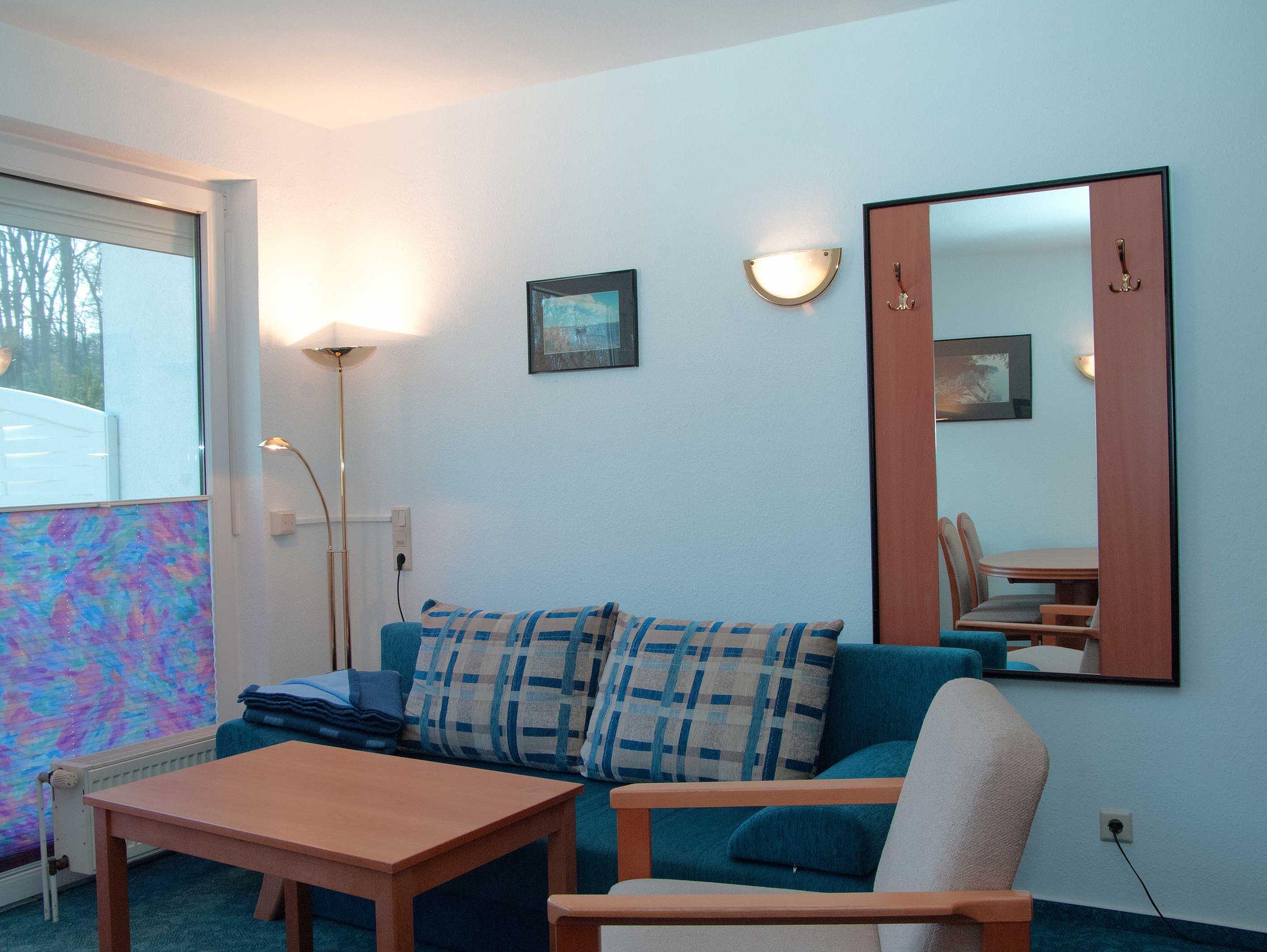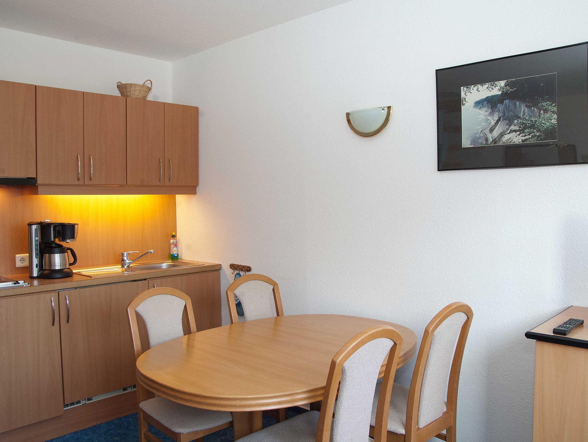 Die Maisonetten Ferienappartement „Sonnenblick“ (ca. 62 m² ) befindet sich am Hochufer von Sellin. Der offene Wohn- und Küchenbereich sowie die Dusche mit WC sind im Erdgeschoss. Die beiden separaten Schlafzimmer im ersten OG bestehen aus einem Schlafzimmer mit Doppelbett und im Zweiten befindet sich ein Etagenbett (90 x 200 m). Ein Babybett kann auf Anfrage aufgestellt werden. Die offene Küche ist mit Kühlschrank (ohne Gefrierfach) und 2-Platten-Ceranfeld (ohne Backofen), ausgestattet. Kochutensilien, Kaffeemaschine, Eierkocher, Wasserkocher, ein Toaster, ausreichend Geschirr und Besteck, sind ebenso vorhanden.