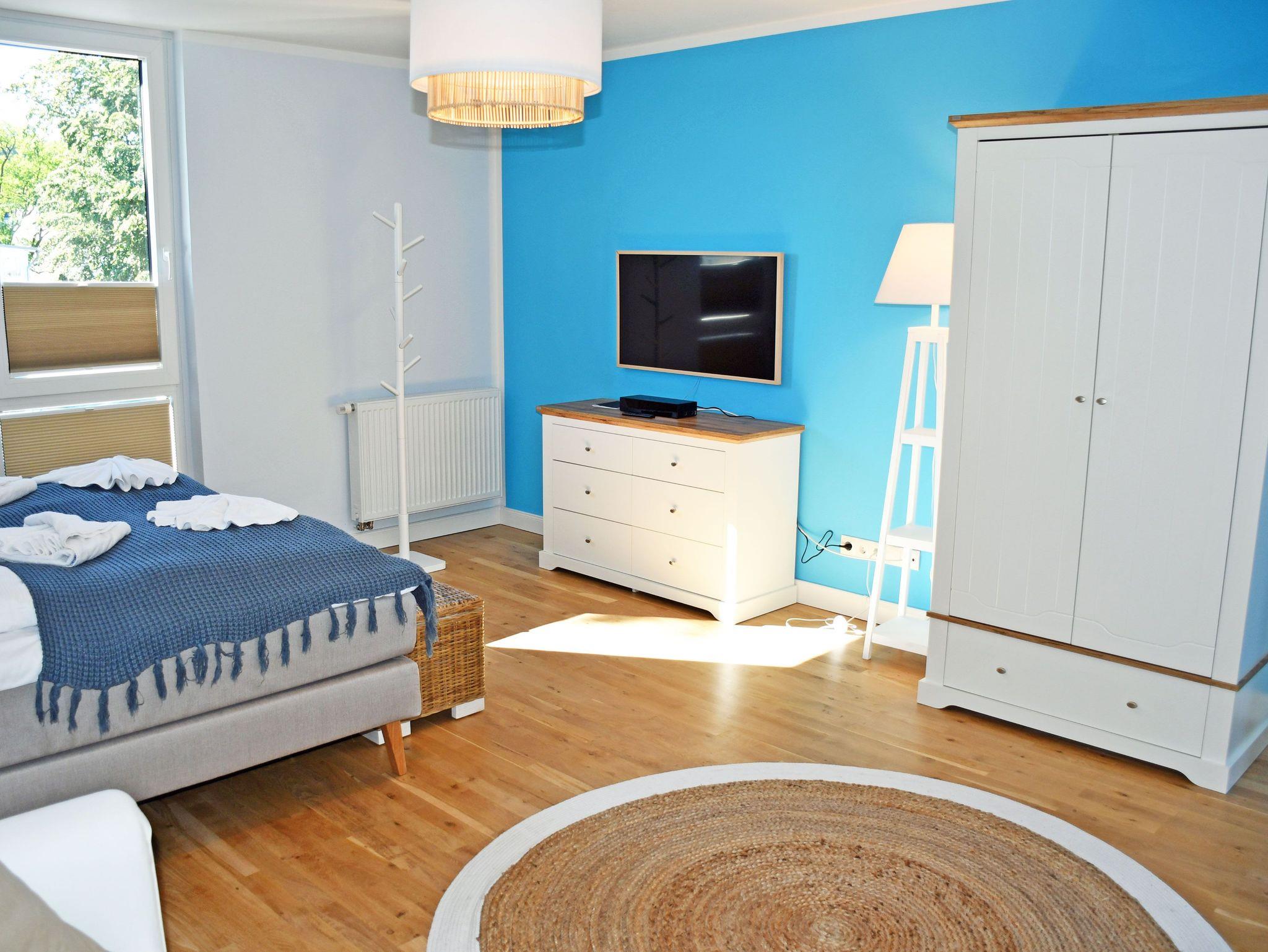 Jede der Wohnungen wird ebenerdig über die Eingangstür betreten. Hier erstreckt sich gleich rechtsseitig ein kleines Duschbad, sowie dem Flur folgend ein großzügiger langgezogener Schlafraum. Ein bequemes Boxspringbett (1,80m) mit Nachttischen und Leselampen sorgt hier für hohen Komfort und erholsamen Schlaf der Gäste und bildet den zentralen Punkt des Raumes. Ein 3- türiger Kleiderschrank und eine Kommode bieten ausreichend Stauraum für Kleider, das Schlafsofa im gradlinigen nordischen Stil bietet die Möglichkeit einer zusätzlichen Aufbettung für einen Gast in dem großen Schlafraum. Der große Bettkasten bietet Stauraum für die zur Aufbettung zusätzlich benötigten Bettdecken. Die Fenster können bei Bedarf zum Schlafen verdunkelt werden.