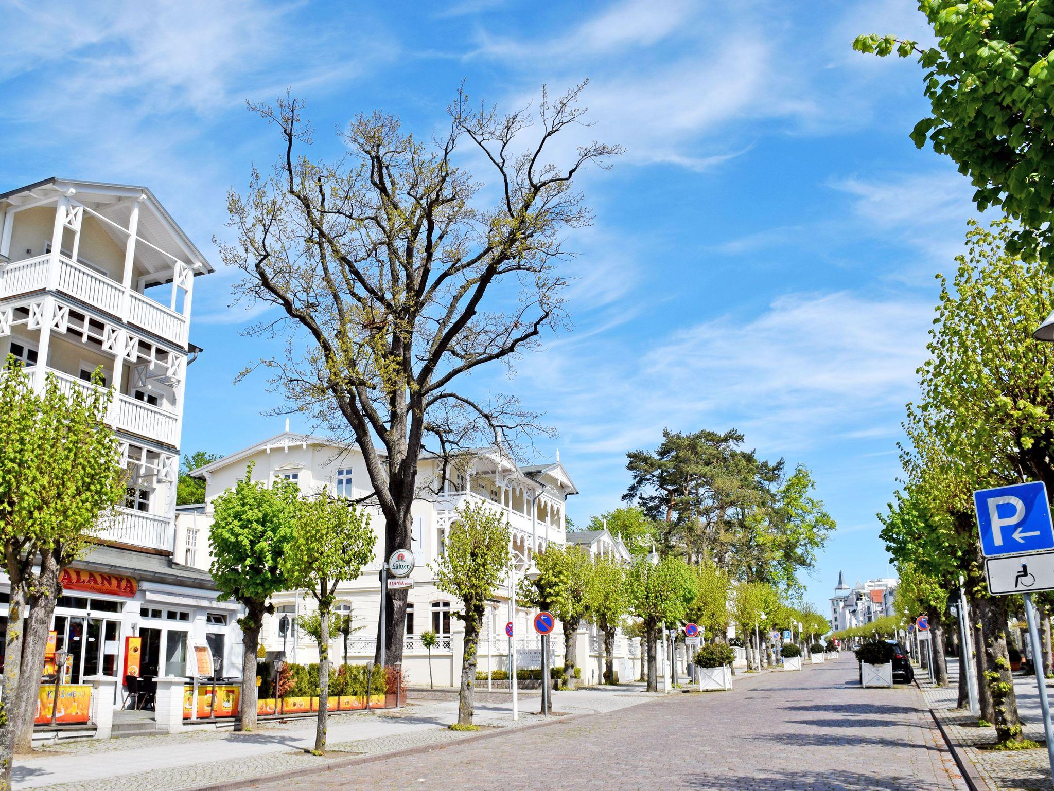 Das Ortzentrum des Ostseebades erreichen Sie in ca. 100 m und der Kleinbahnhof für den „Rasenden Roland“ nach ca. 800 m entfernt. Im Zentrum laden diverse Geschäfte, Läden, viele Restaurants zum Verweilen ein.