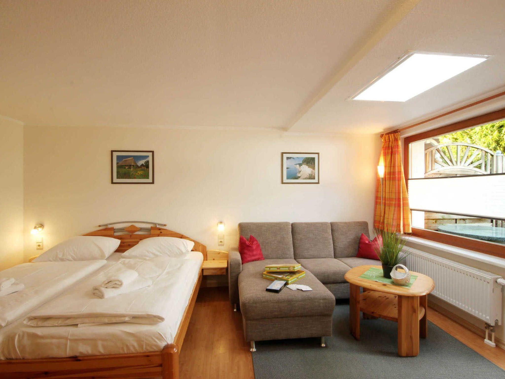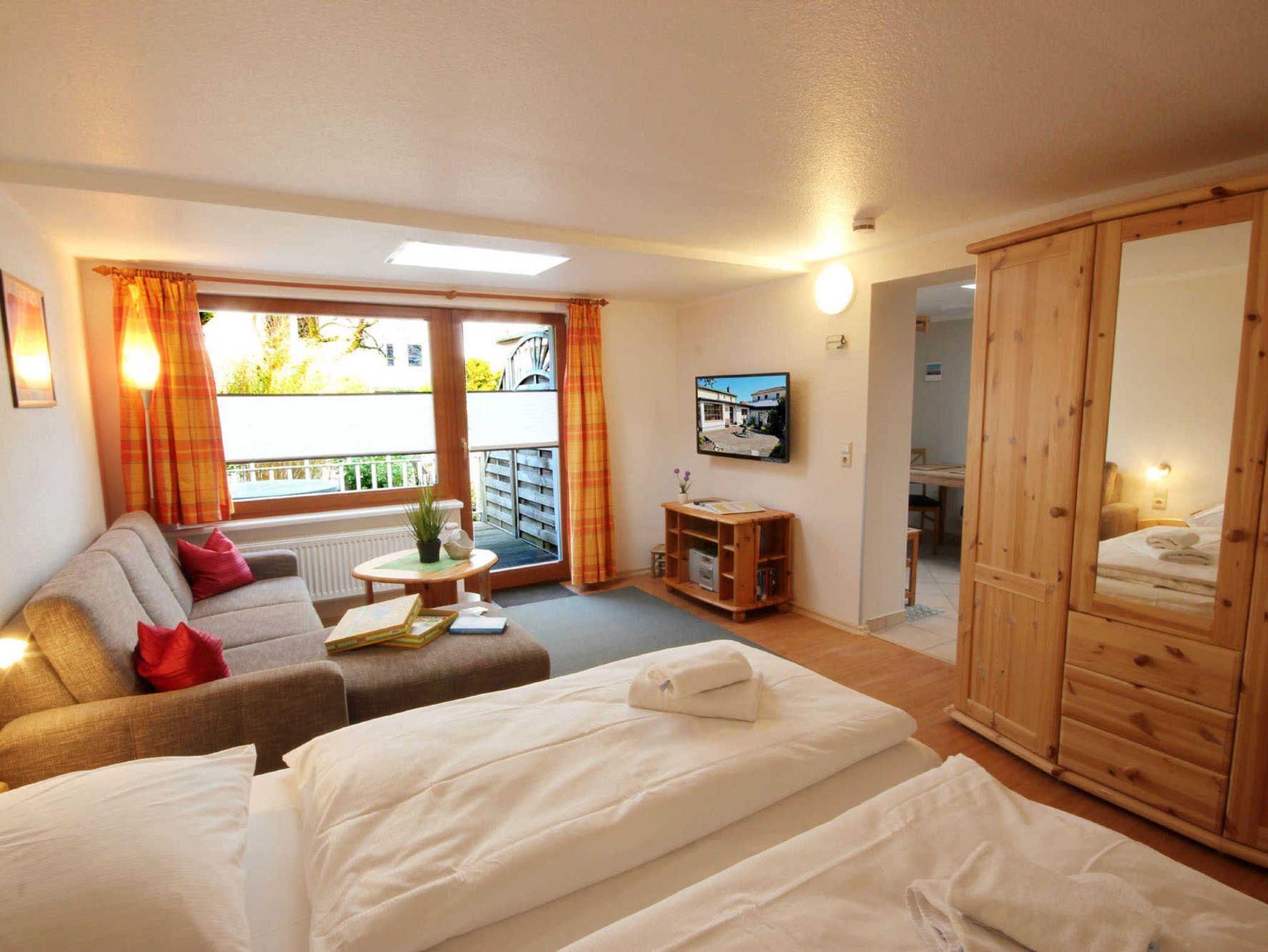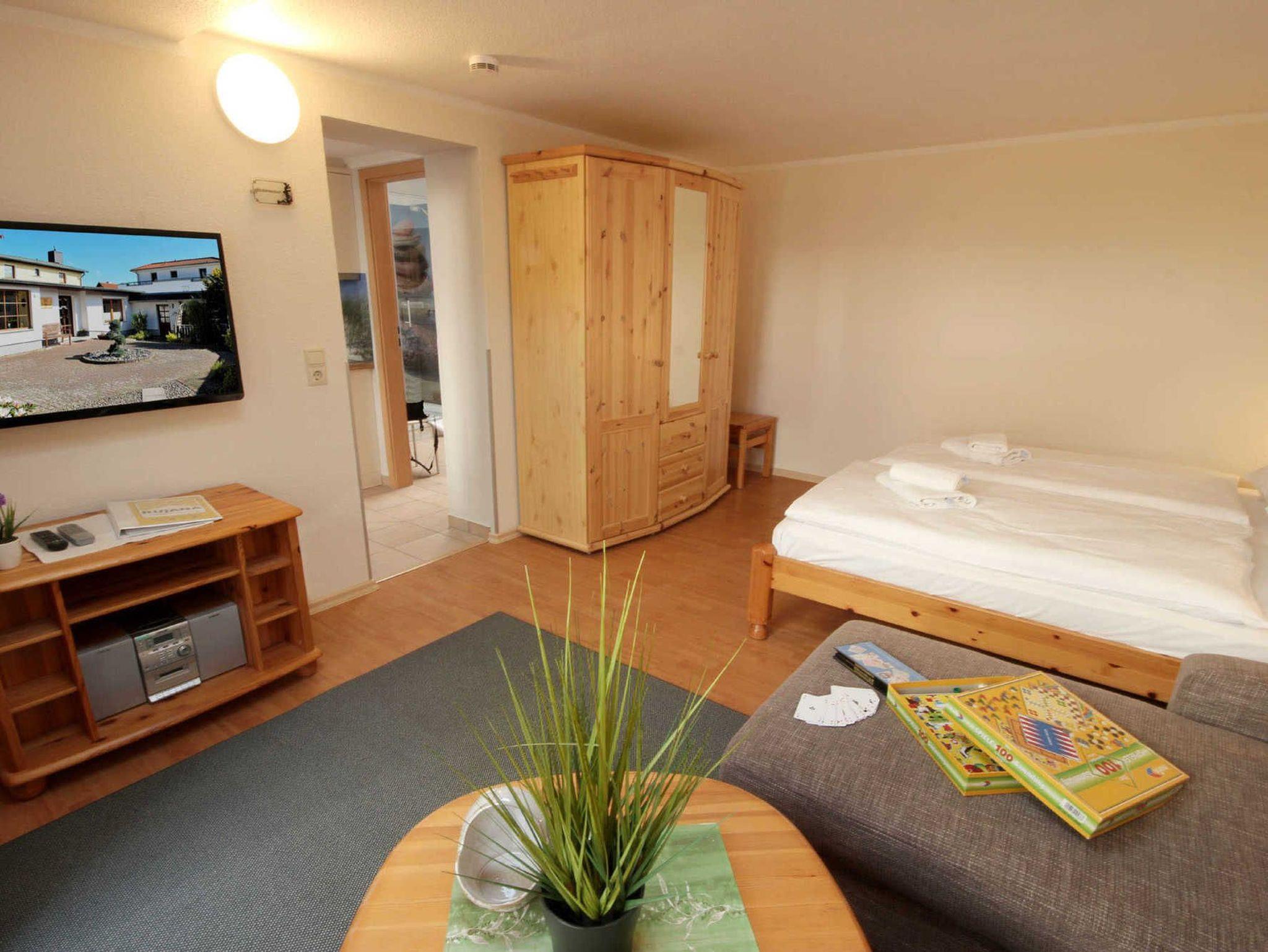Das Appartement verfügt über einen kombinierten Wohn- und Schlafbereich mit Zugang zur Terrasse, eine separate Küche sowie ein Tageslichtbad. Neben dem schönen Wohnraum mit gemütlicher Sitzecke erwartet Sie unter anderem ein Flachbildfernseher, WLAN, Radio mit CD-Player sowie ein Kleiderschrank. Das Doppelbett im Wohnzimmer bietet die Schlafmöglichkeit für 2 Personen.