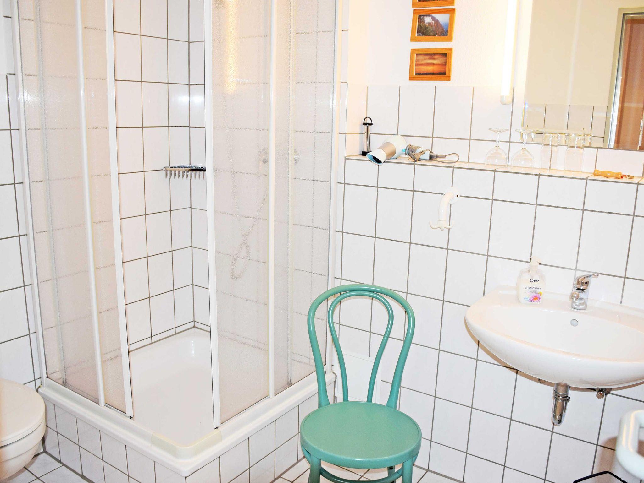 Das moderne und helle Bad verfügt über Dusche, Waschtisch, Handtuchwärmer, Föhn, Kosmetikspiegel & WC.