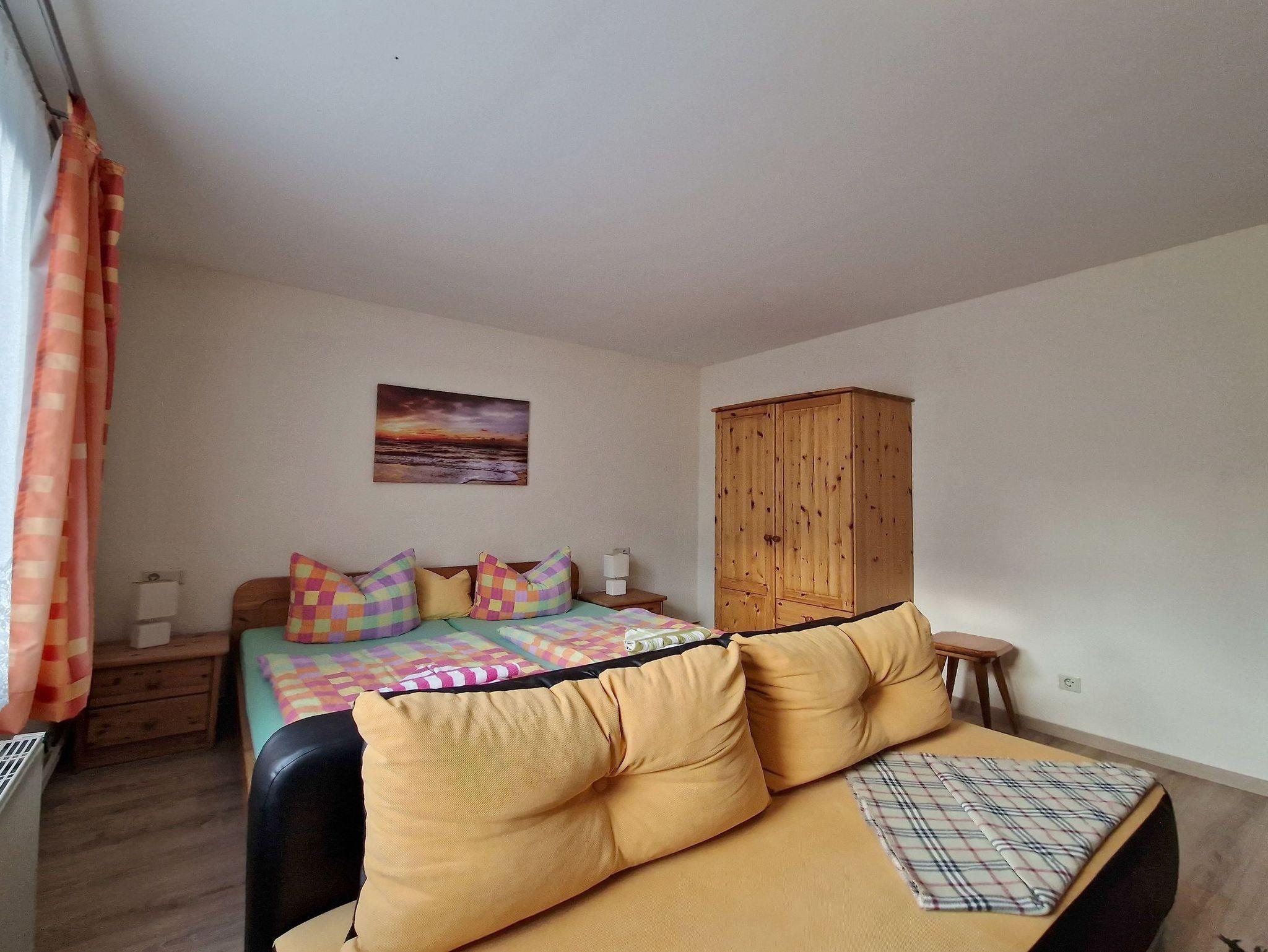 • WOHNEN/SCHLAFEN: Wohnraum mit Couch, Doppelbett und Flachbild-TV