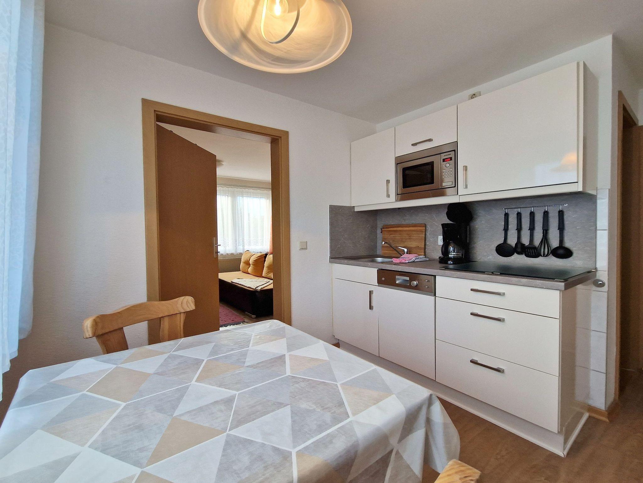 • KÜCHE: Separate Küche, 4-Felder Ceranherd, Kühlschrank, Spülmaschine, Mikrowelle, Wasserkocher, Kaffeemaschine, reichlich Besteck, Geschirr und Küchenutensilien