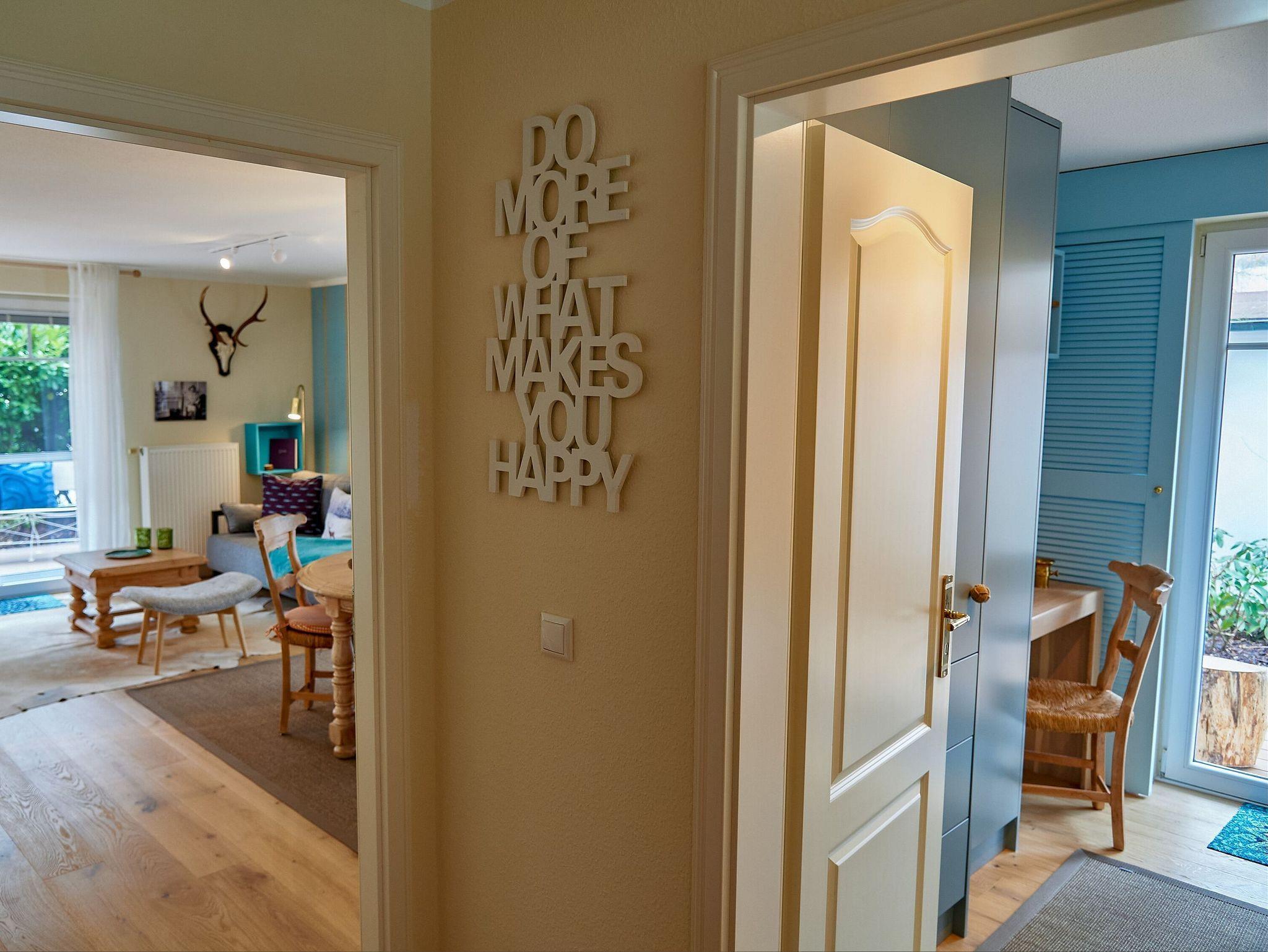 Im geräumigen Wohnzimmer mit seinen Landhausdielen und liebevoll ausgewählten Dekorationselementen stehen Ihnen eine gemütliche Couch, ein großer Esstisch, ein SMART-TV sowie eine Musikanlage und kostenfreies W-LAN zur Verfügung.
