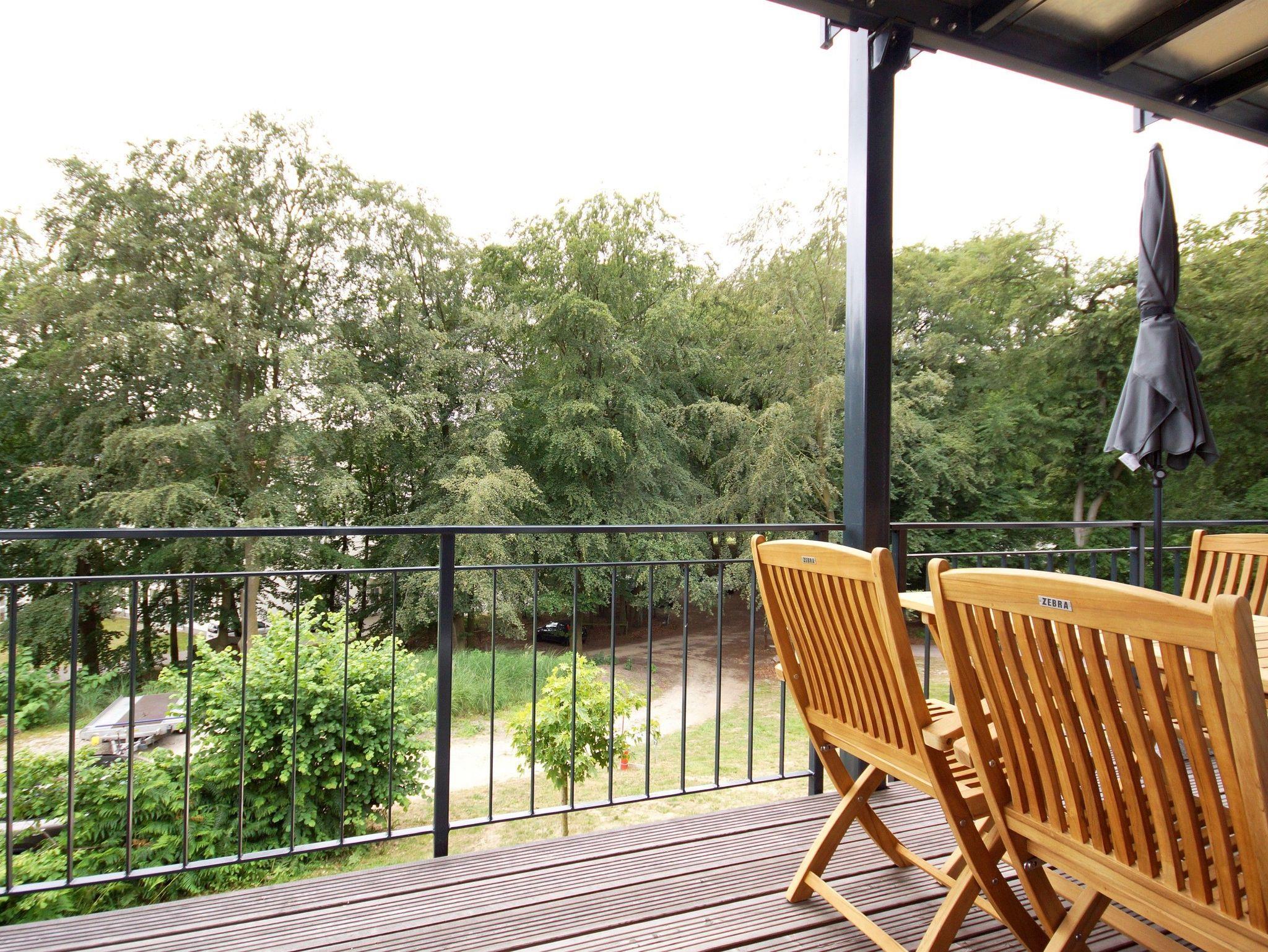 Auf dem weitläufigen Süd-Balkon genießen Sie auf ausgewählten Gartenmöbeln sonnige Stunden mit Blick ins Grüne.