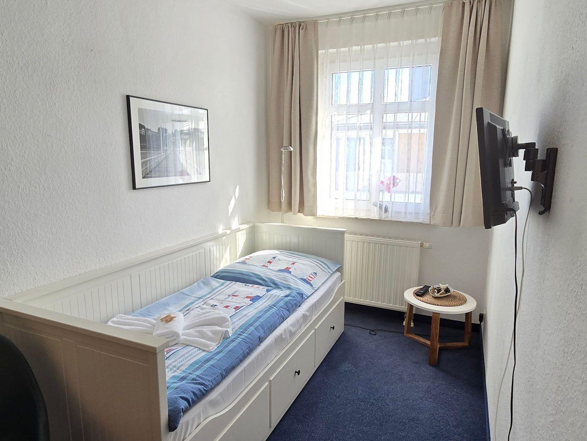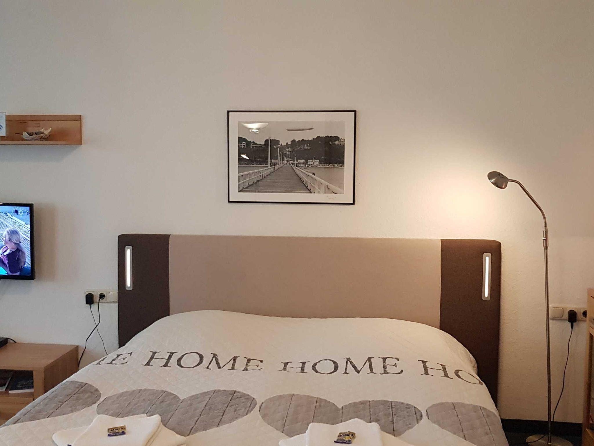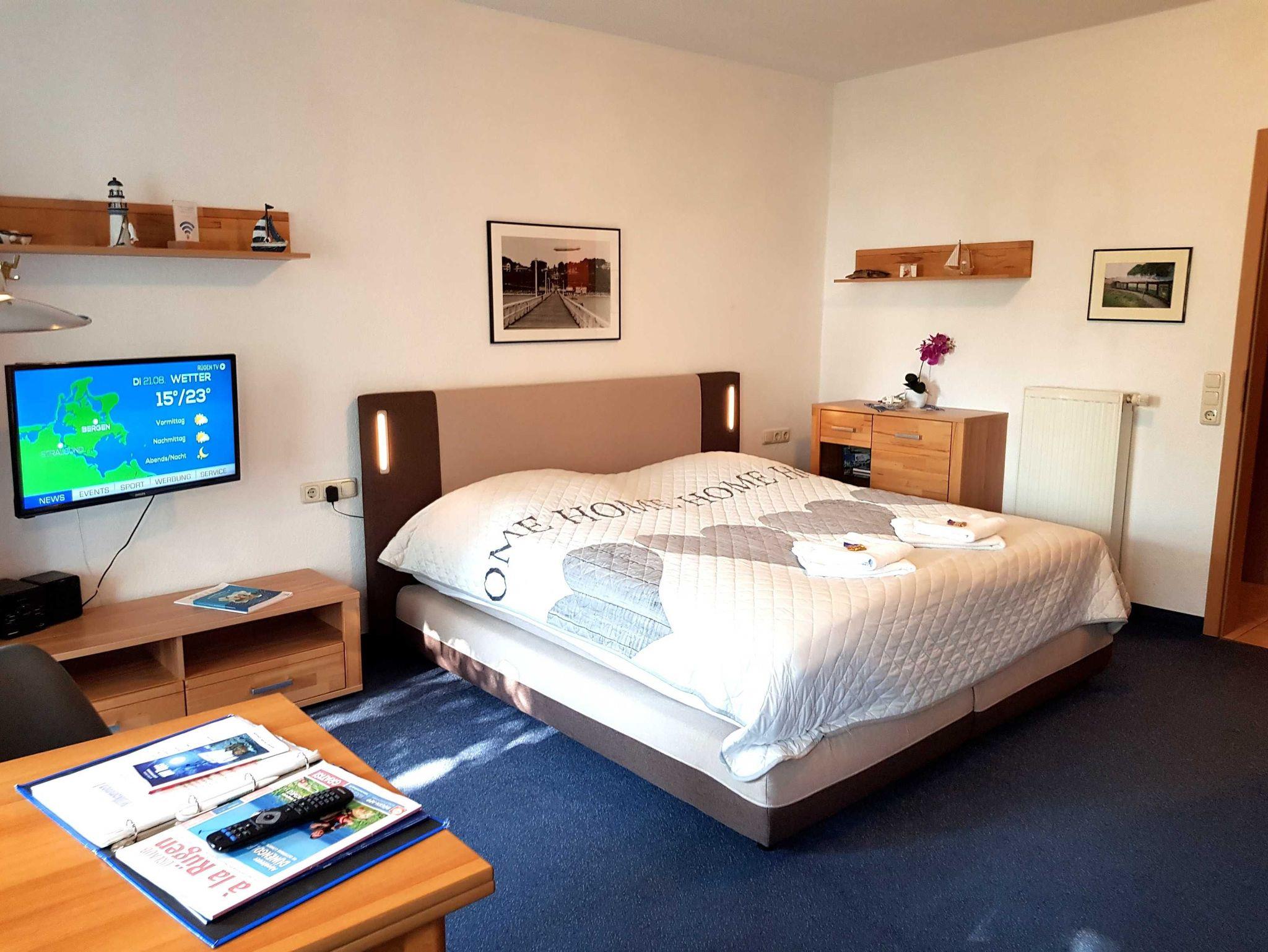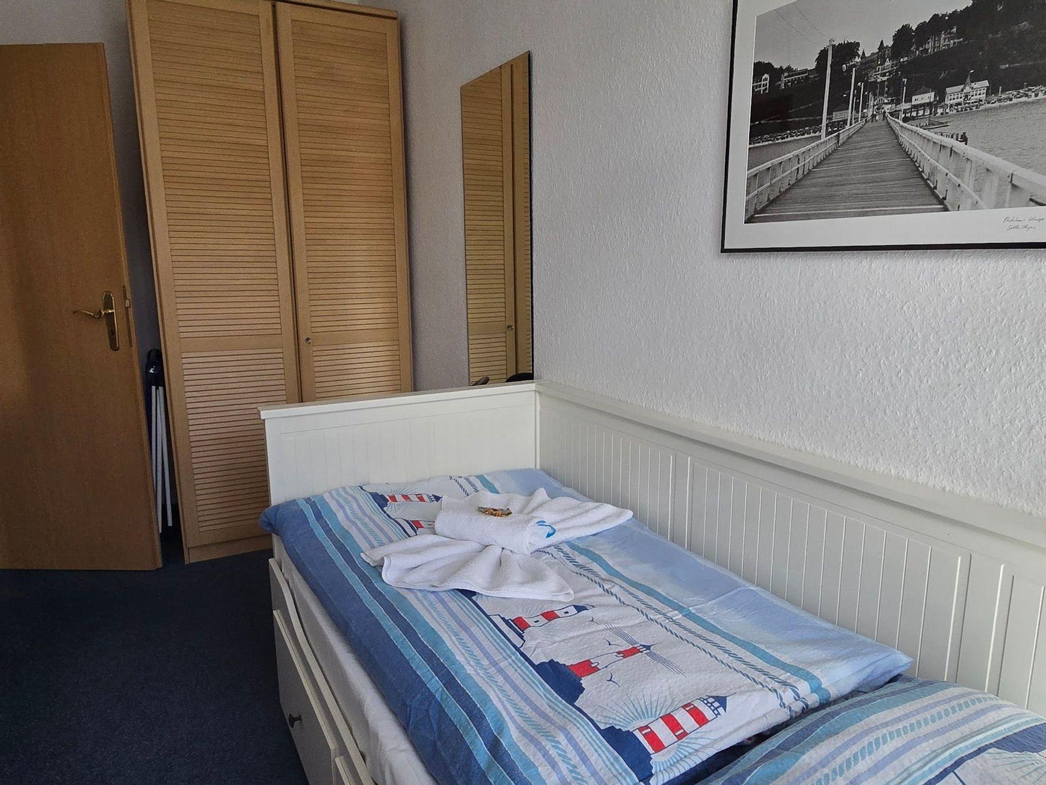 Das 2 Raumapartment in der 4. Etage besteht aus einem Wohnschlafraum mit Doppelbett. Und einem zweiten Zimmer mit Schlafcouch und 2. Fernseher. Möbilierter Balkon auf der Ostseite. Die Küche ist getrennt vom Wohnraum und großzügig ausgestattet. Dusche und WC.Vom Balkon hat man einen schönen Blick auf die Ostsee.