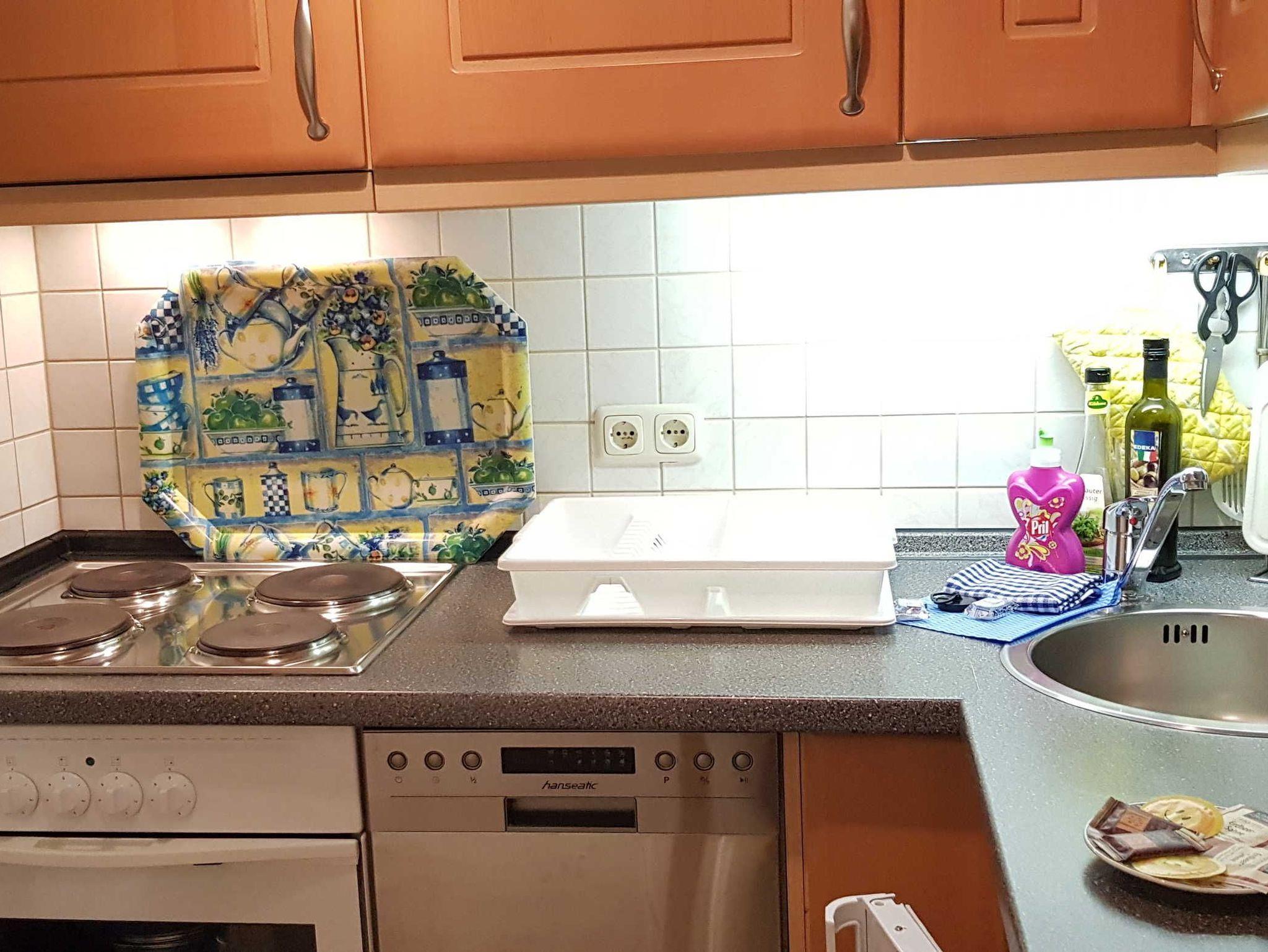 • gut ausgestatte Küche mit Geschirrspüer, Kaffemaschine, Backofen,Toaster, Wasserkocher etc