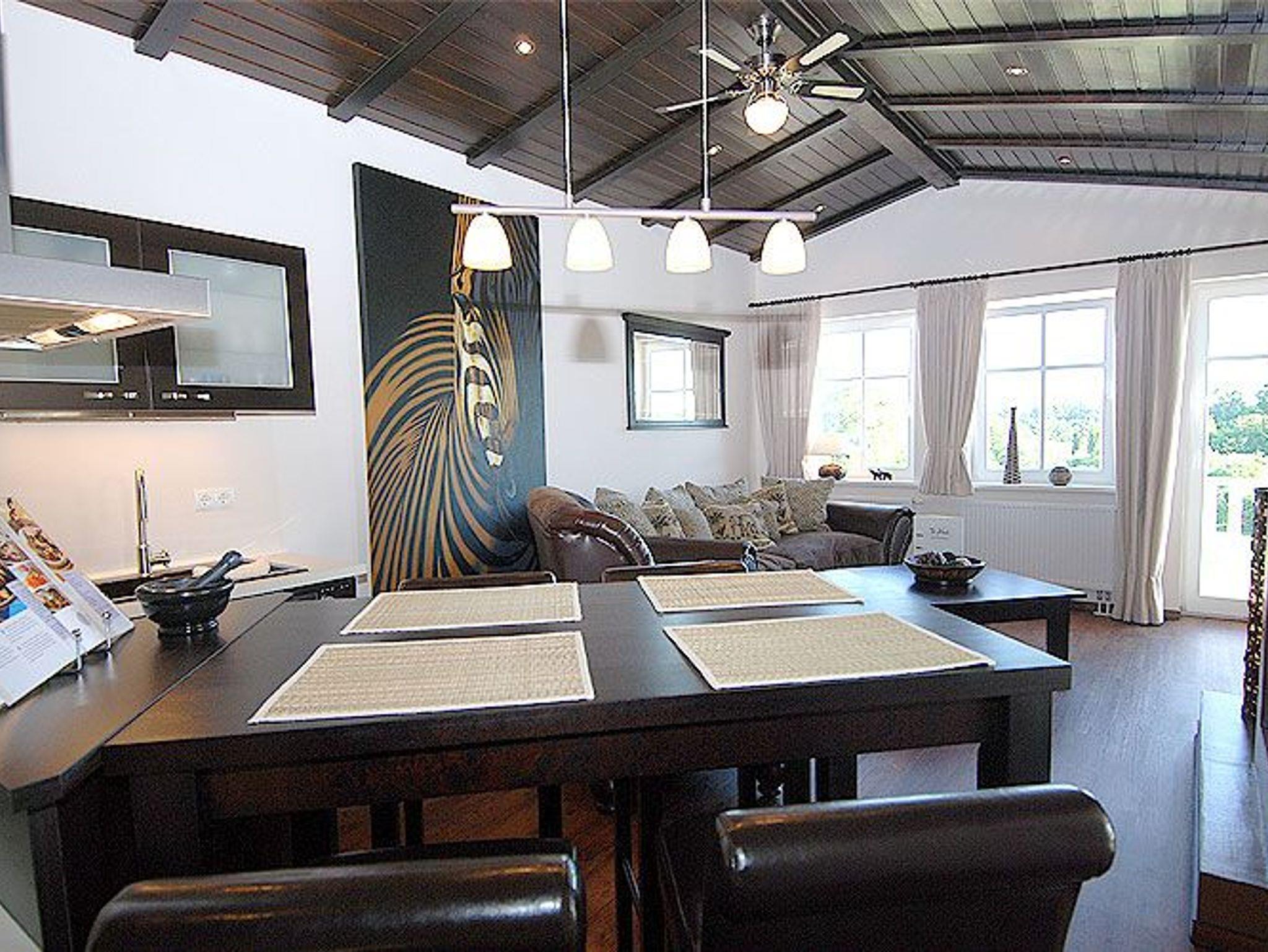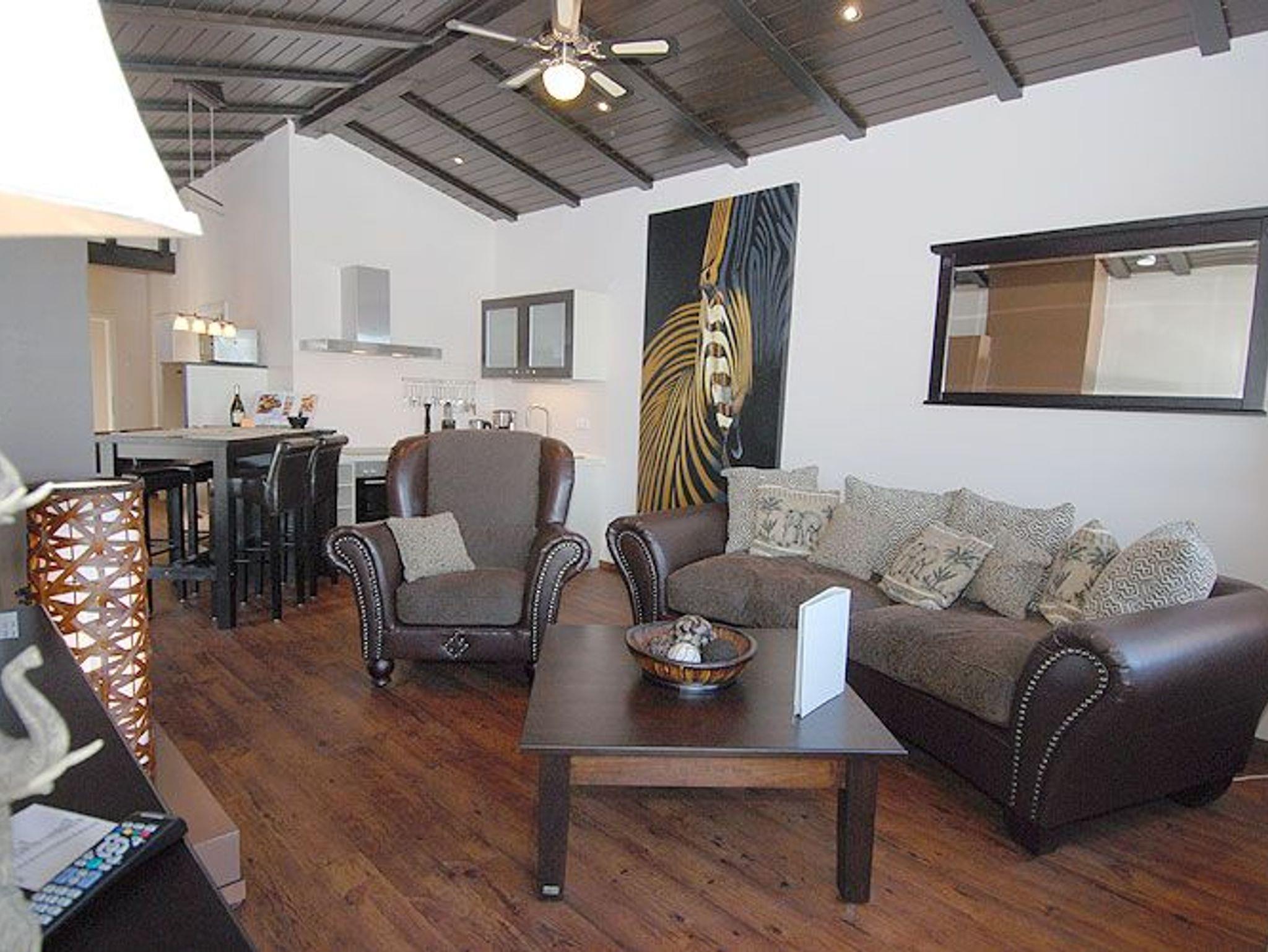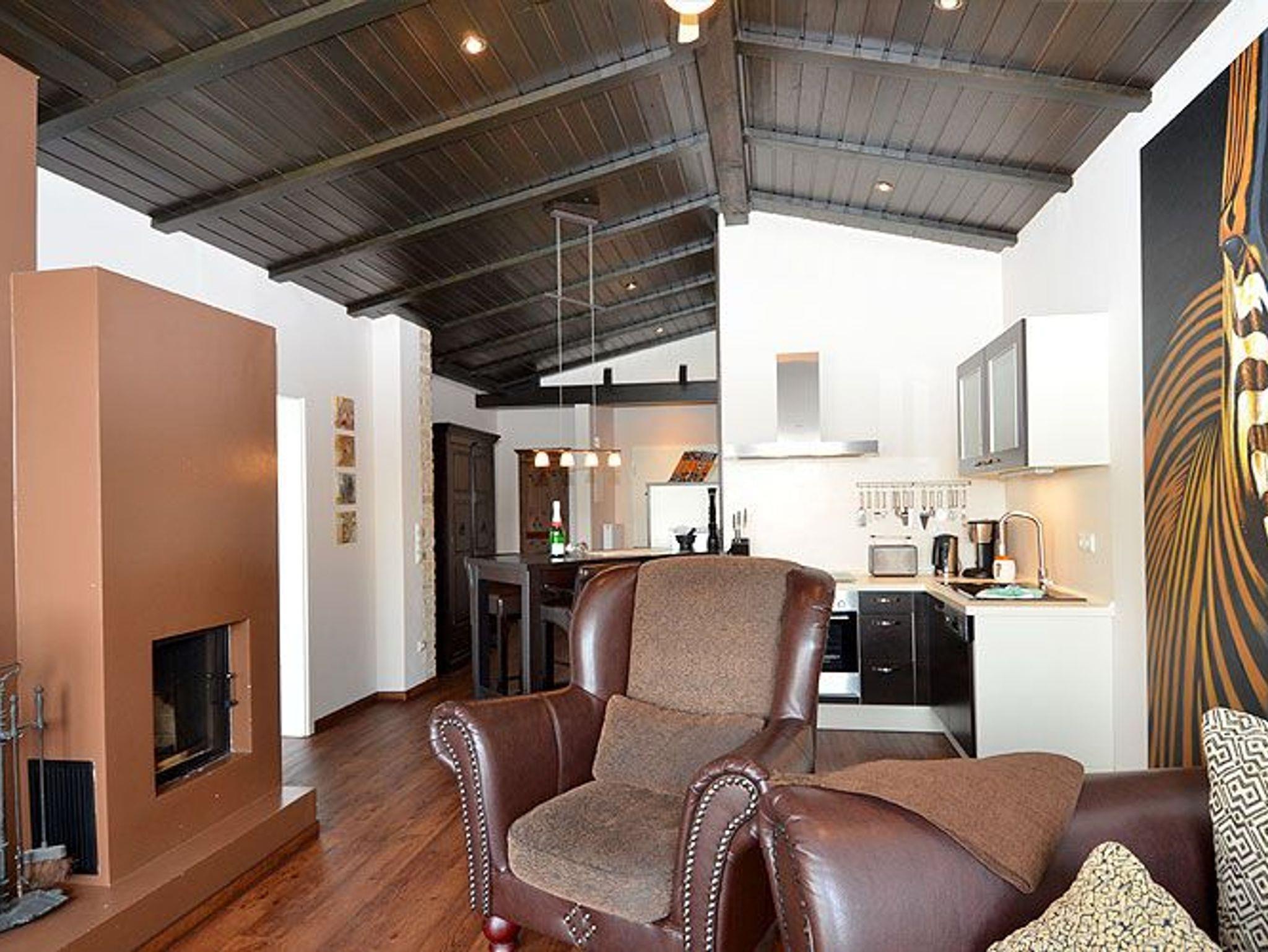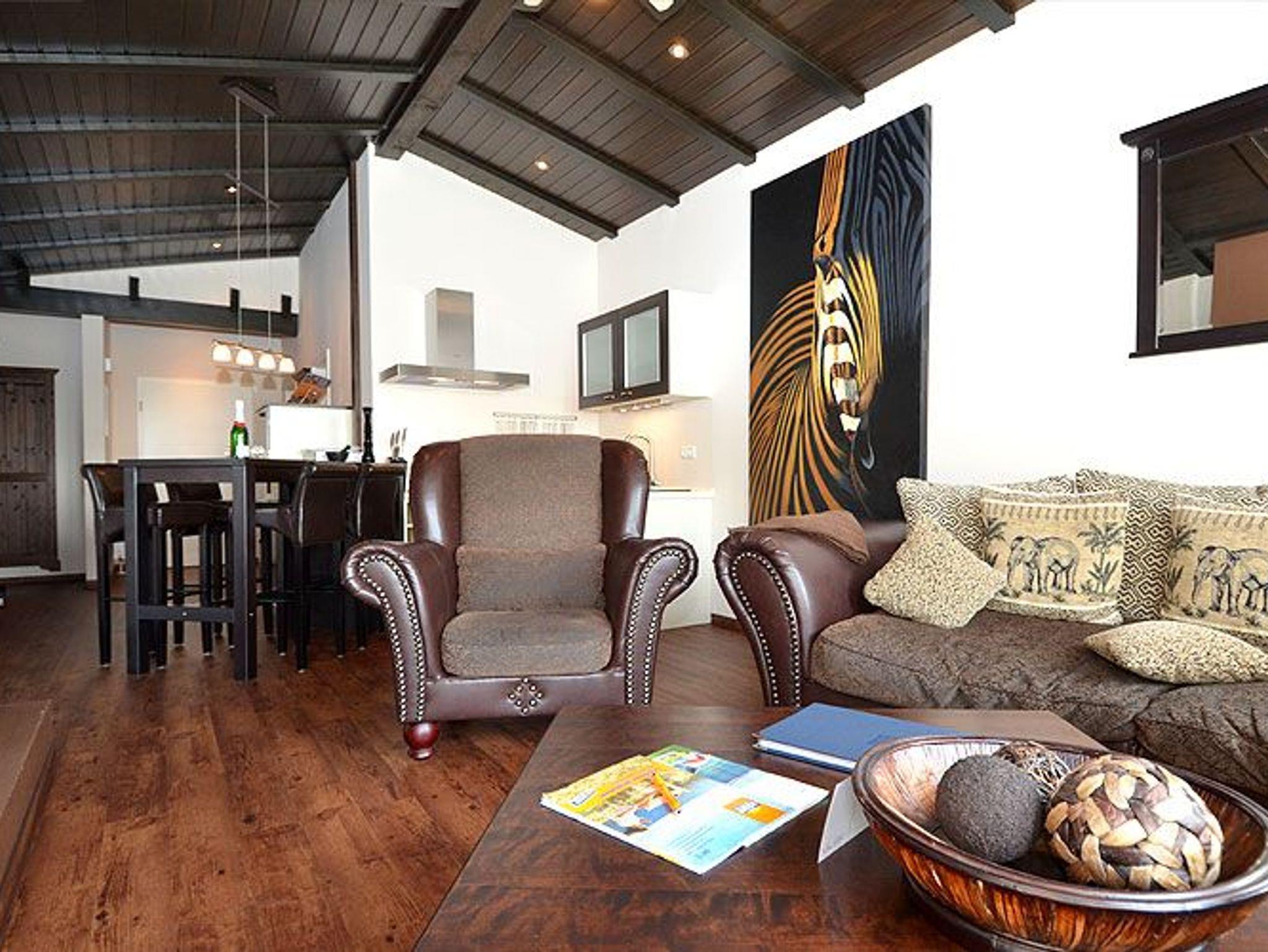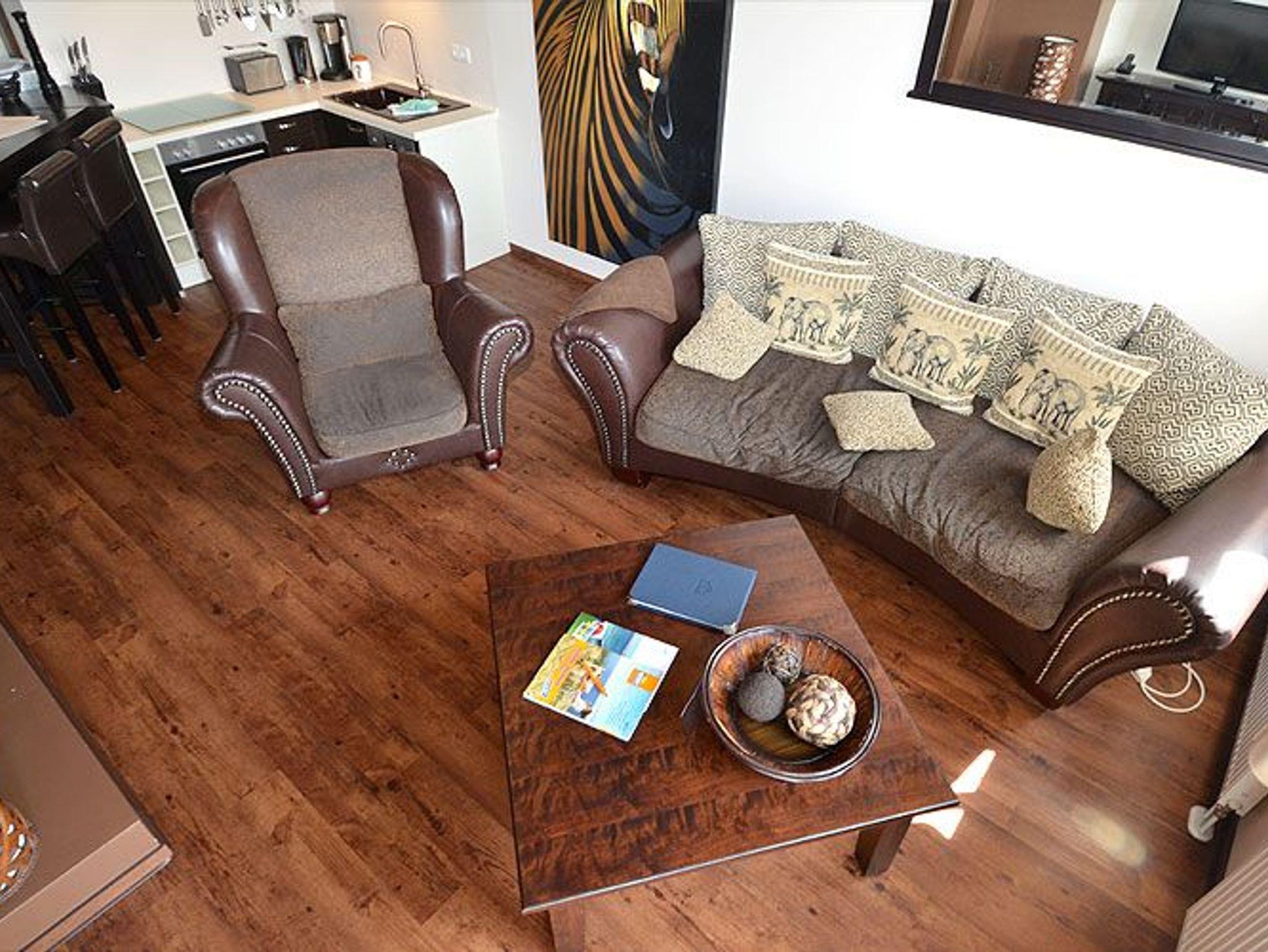 Über einen Flur gelangen Sie in den lichtdurchfluteten, großzügigen Wohn- und Essbereich mit sichtbaren Deckenbalken. Die Fewo ist im Kolonialstil eingerichtet und bietet u.a. einen Kamin für erholsame Stunden, einen LCD-Fernseher, eine BOSE Bluetooth-Soundanlage sowie ein schnurloses Telefon. Ein besonderes Highlight dieser Wohnung ist das Relax-Sofa im Afrikalook, welches zum Entspannen einlädt. Kostenloser Internetzugang (per Datenkabel oder per WLan) steht selbstverständlich ebenfalls zu Ihrer Verfügung.