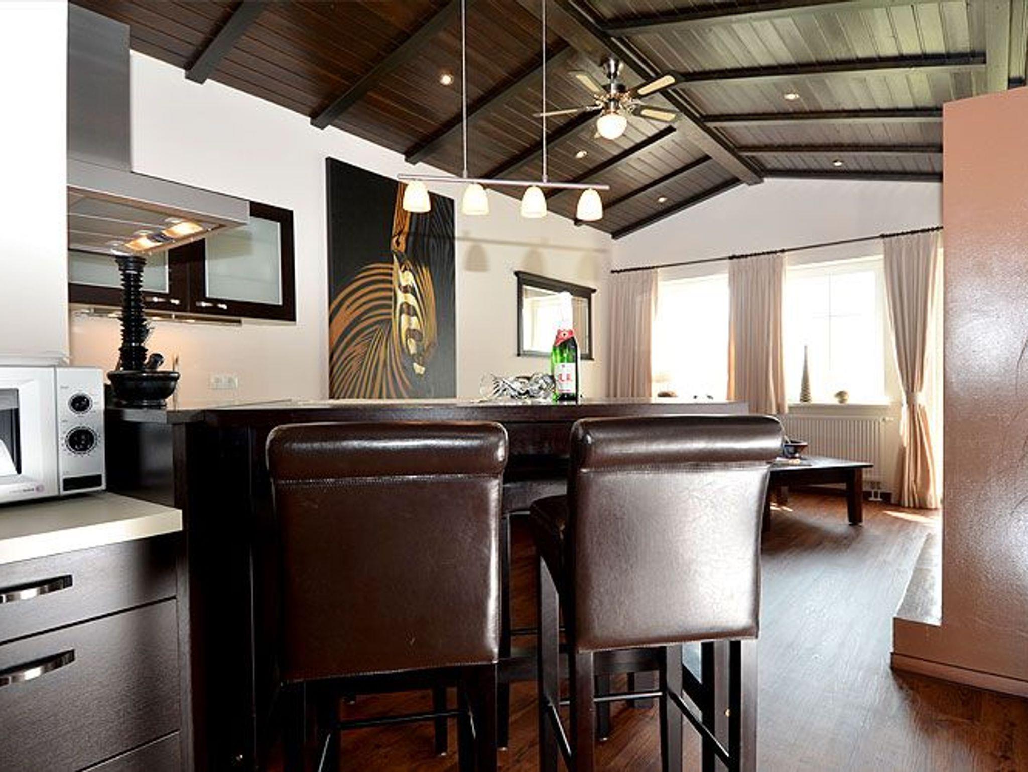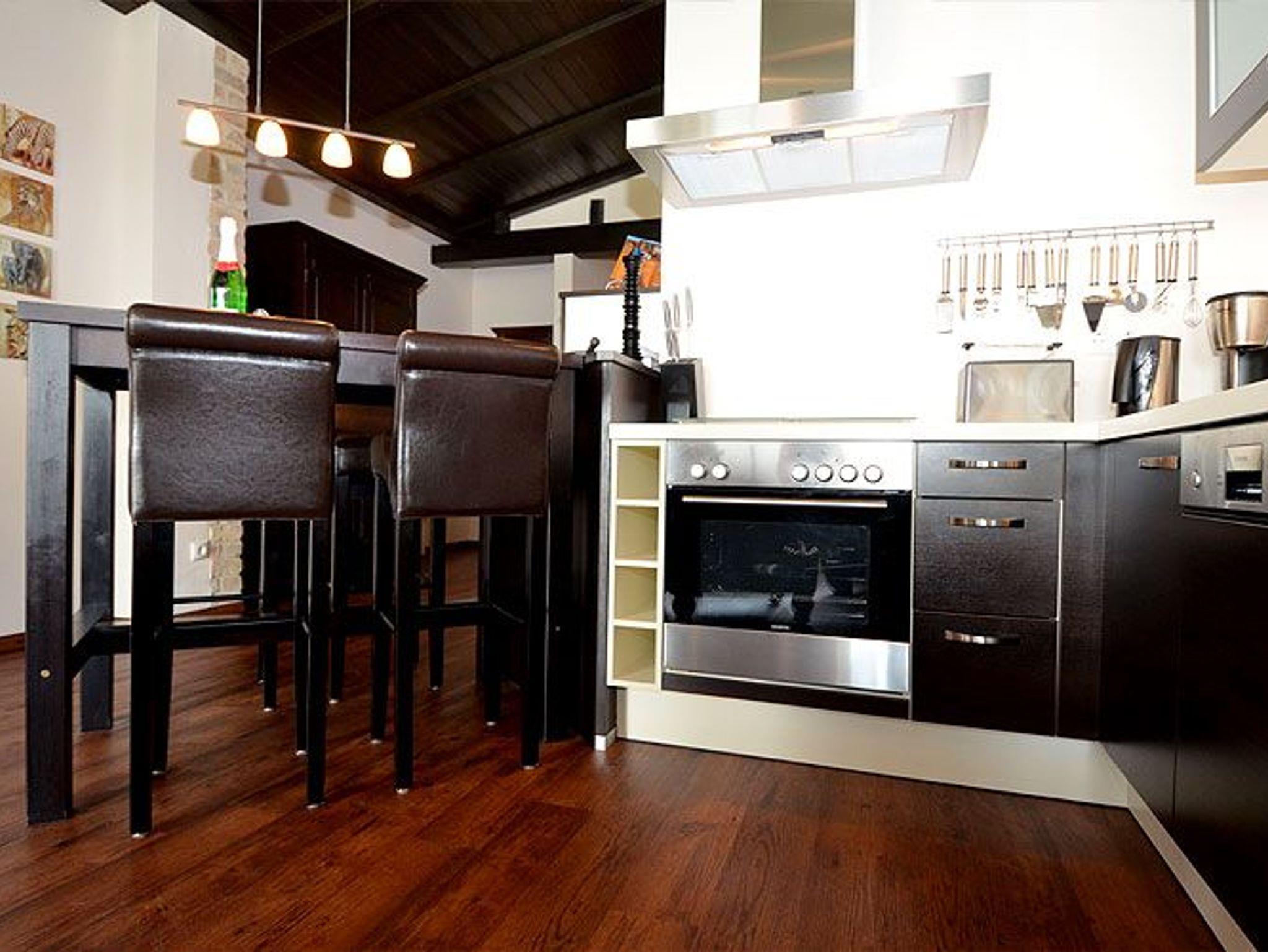 Angrenzend befindet sich die offene Küche mit einem Esstresen. Ein Kühlschrank mit Gefrierfach, ein Backofen, ein 4 Platten- Ceranfeld, eine Spülmaschine sowie eine Mikrowelle, Toaster, Mixer, Eierkocher und diverses Kleininventar lassen keine Wünsche offen. Ein JURA-Kaffeeautomat sorgt für Kaffee satt.