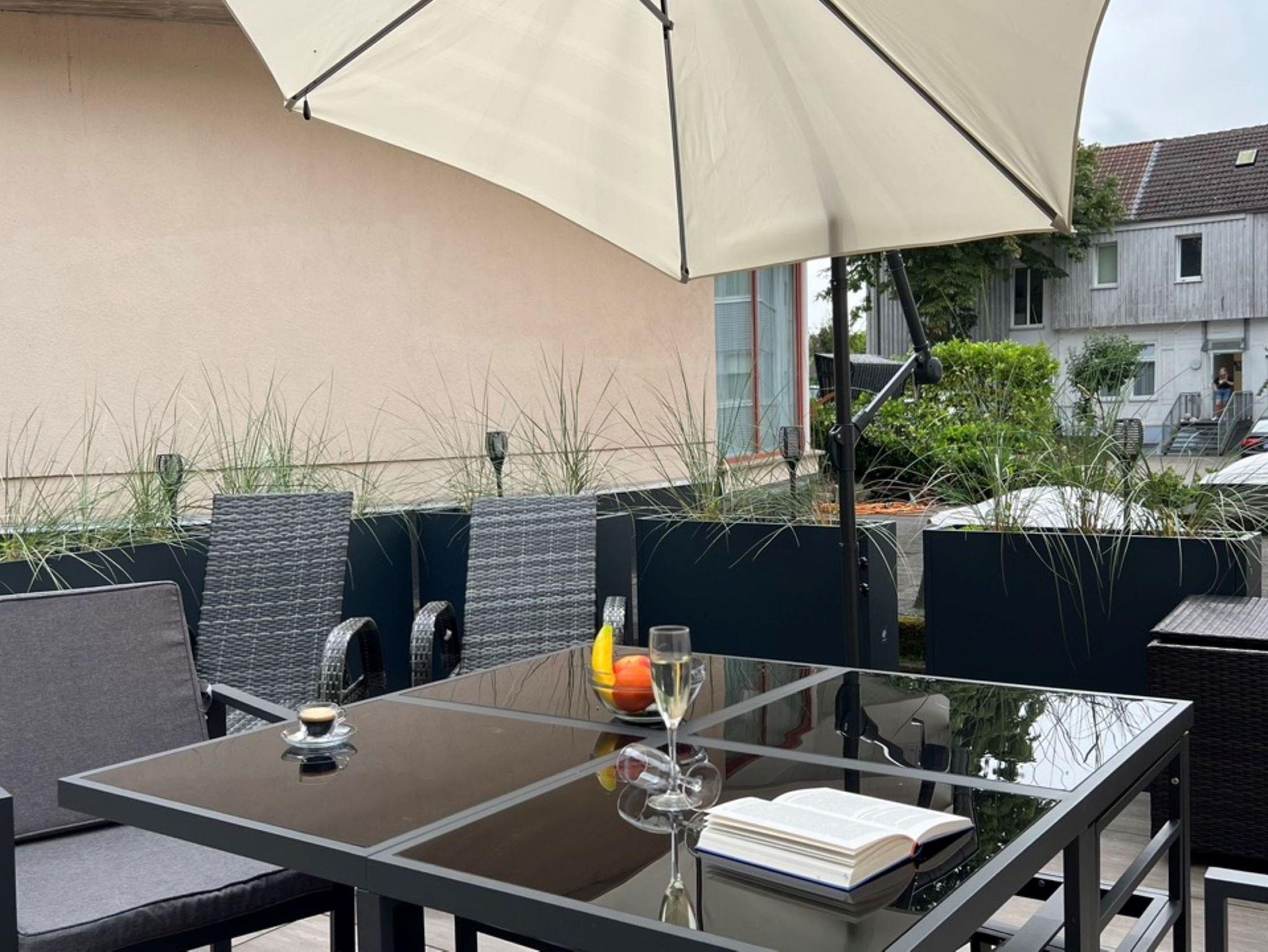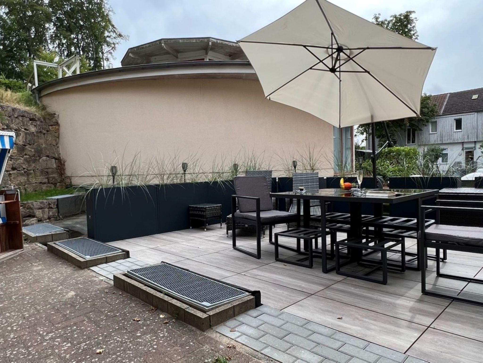 Moderne Ferienwohnung mit Terrasse, Sauna und Strandkorb im Ostseebad Sellin, ideal für Familien und Haustiere.