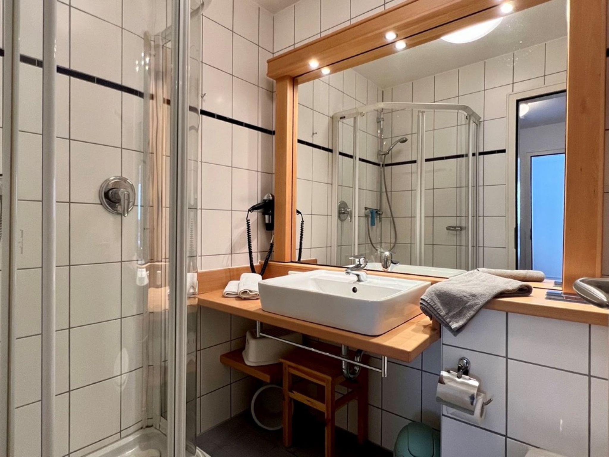 Das hell erleuchtete Bad bieten Ihnen eine Dusche, ein WC und einen Waschtisch mit Waschbecken und Spiegel.