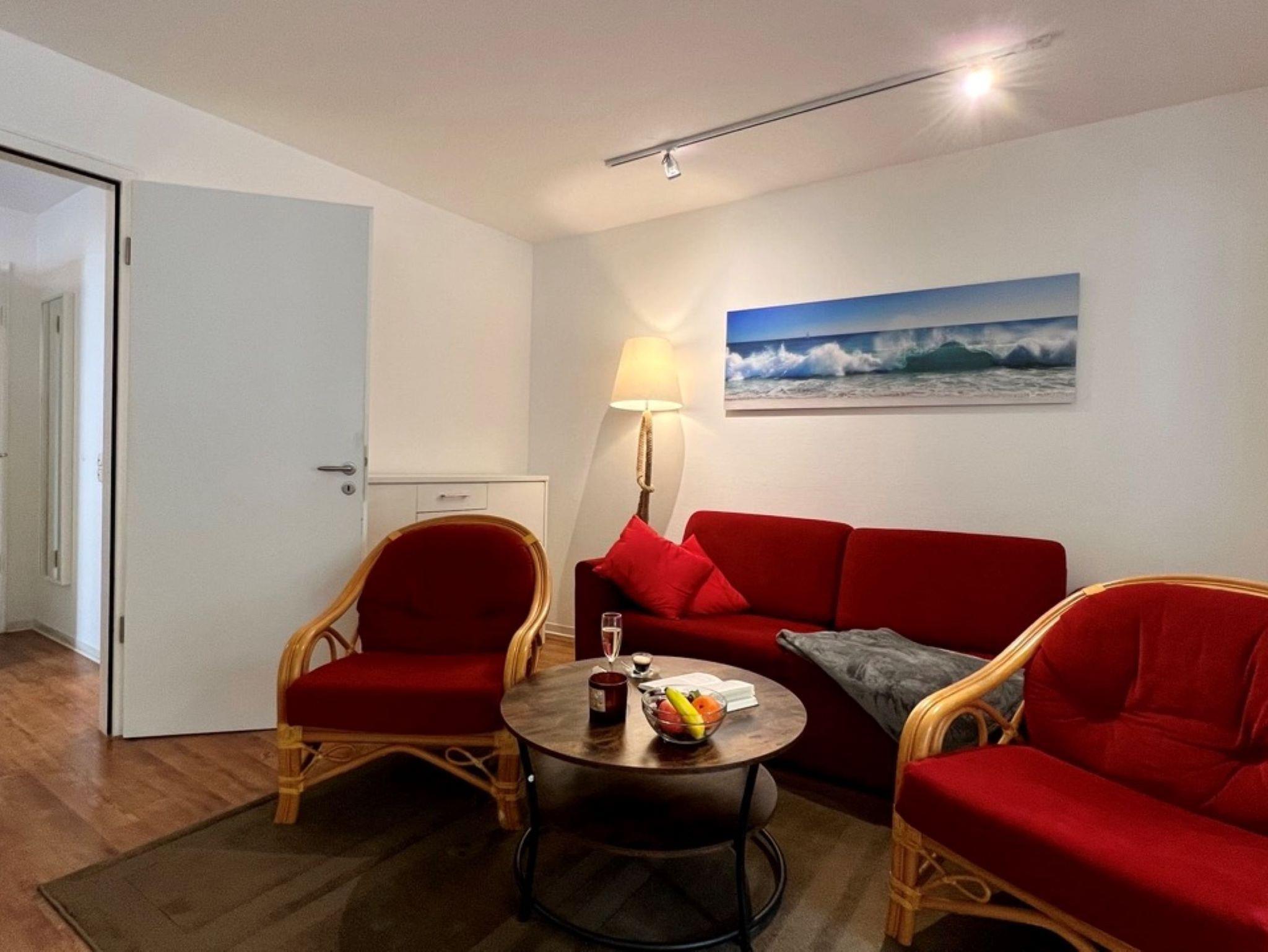 Über den freundlichen Flurbereich erreichen Sie das helle Wohnzimmer - hier erwartet Sie neben dem Flachbild-TV und den beiden bequemen Sesseln eine komfortable Couchgarnitur, welche ebenso als Aufbettungsmöglichkeit für 2 weitere Personen genutzt werden kann. Von hier aus erreichen Sie die sonnige Terrasse mit Gartenmöbeln (inkl. Auflagen) und einem eigenen Strandkorb. Direkt um die Ecke finden Sie eine weitere, gerade neu angelegte Sonnenterrasse!