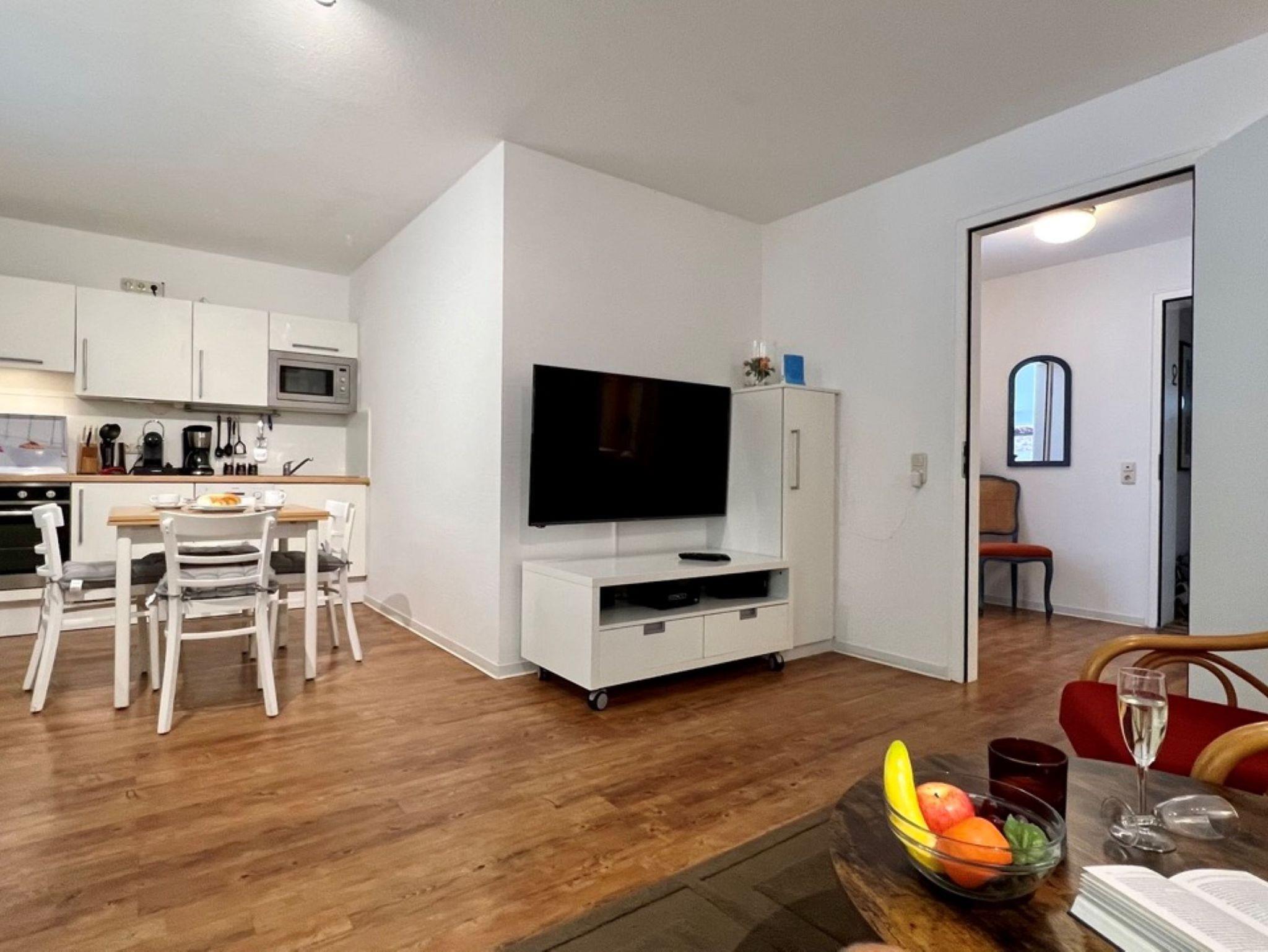 Die moderne Küche ist mit allem ausgestattet, was es für einen kulinarischen Kochabend benötigt: ein Ceranfeld, ein Backofen inkl. Abzugshaube, Mikrowelle, Geschirrspülmaschine und allerlei Küchenkleingeräte (Wasserkocher, Kaffeekapselmaschine...). Besteck, Geschirr und andere Küchenutensilien sind selbstverständlich ebenso vorhanden. Direkt anschließend finden Sie im kleinen Essbereich die Möglichkeit, bei einem gemütlichen Abendessen den Urlaubstag ausklingen zu lassen.