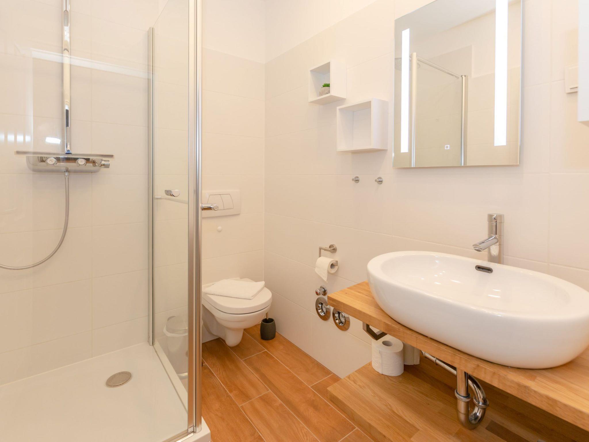 Das hell erleuchtete Badezimmer überzeugt mit einer Dusche, einem WC und einem Waschbecken.