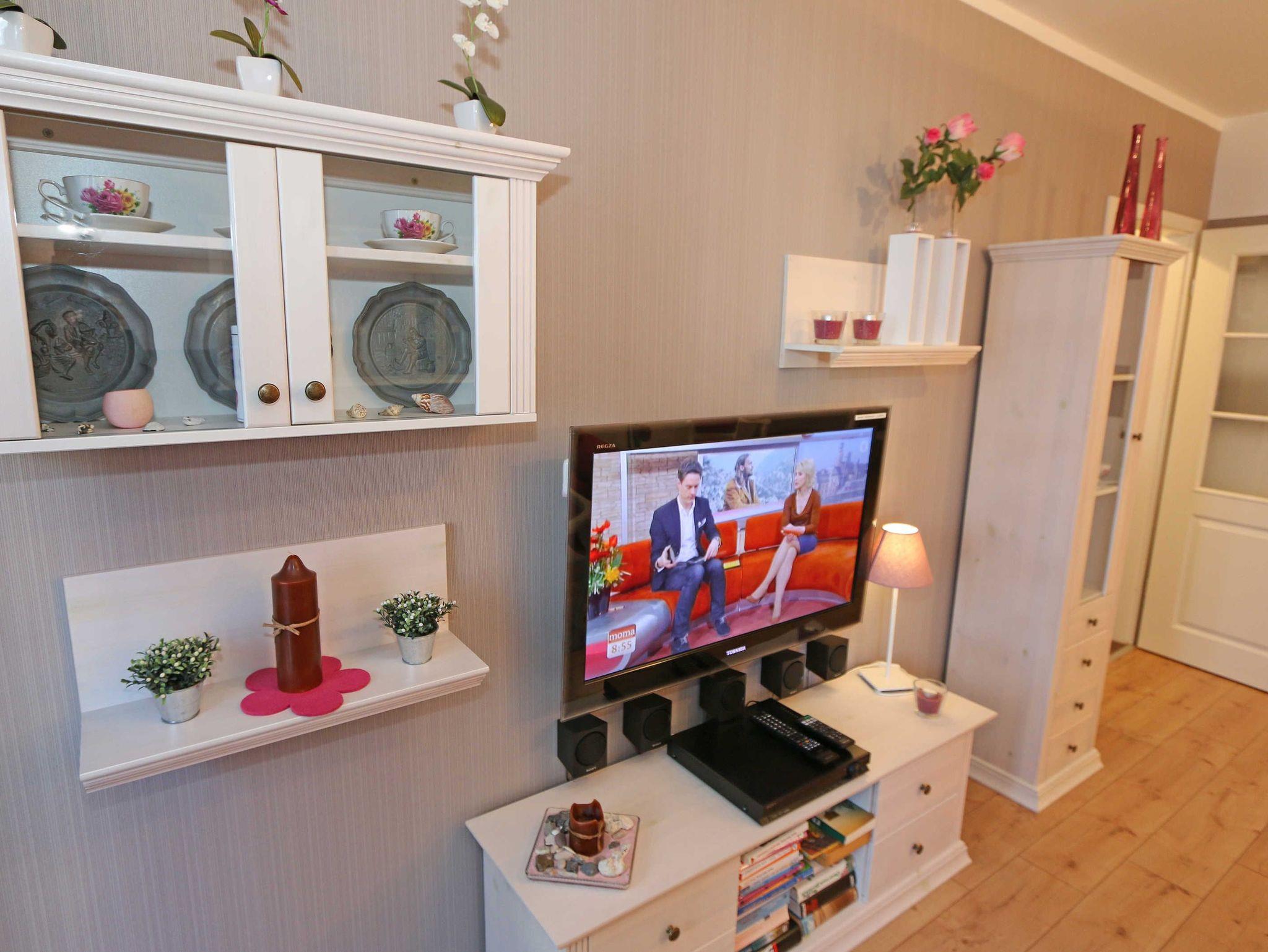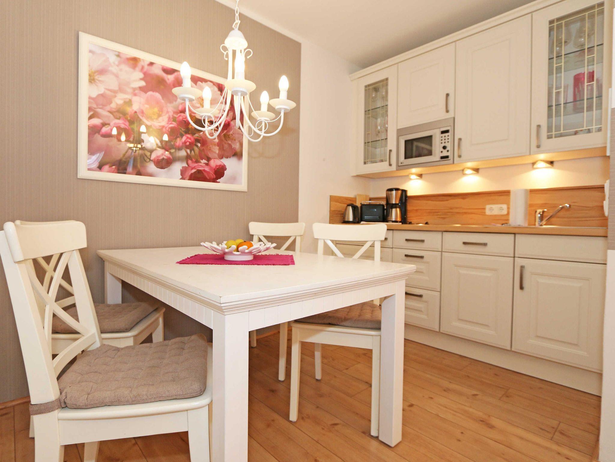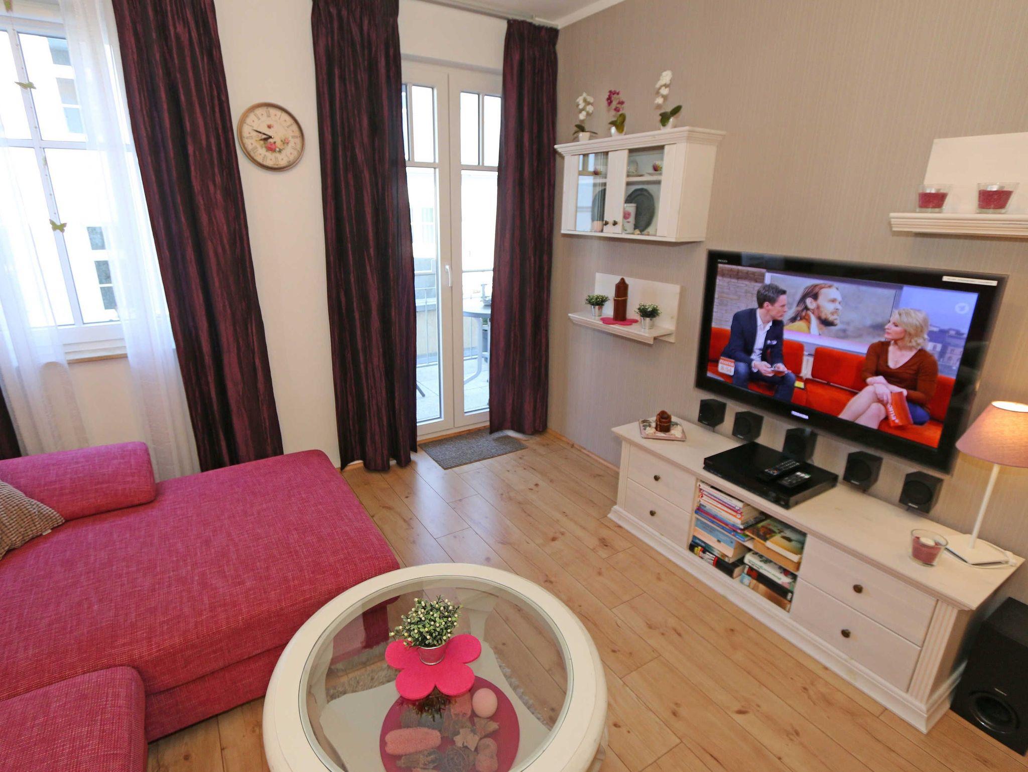 Die Nichtraucherwohnung umfasst ca. 49 m² und befindet sich in der ersten Etage des Hauses. Diese können Sie bequem mit dem Aufzug erreichen. Der geräumige Wohnbereich verfügt über ein Ecksofa (1,60 m x 2,00 m), welches als Aufbettungsmöglichkeit für zwei Personen genutzt werden kann, einen Couchtisch sowie einer Anrichte und Vitrine. Abgerundet wird der Wohnbereich durch einen LED-TV, einer Mini-Stereo-Anlage mit CD- und Blue-Ray-Player, sowie einer Spielesammlung und DVD's. Auch auf einen Internetanschluss (WLAN) brauchen Sie nicht verzichten. Dieser ist für Sie inklusive. Ein Plätzchen mit einem bequemen Sessel und einer Leselampe finden Sie zusätzlich mit einer kleinen Auswahl an Büchern für Groß und Klein. Angrenzend befindet sich die kleine Küchenzeile mit einen 2 Zonenceranfeld, einen Kühlschrank mit Gefrierfach, einen Geschirrspüler, eine Mikrowelle, eine Kaffeemaschine, einen Wasserkocher, einen Toaster sowie diverse Küchenutensilien. Gemütlich und bequem können Sie Ihre Mahlzeiten am Esstisch genießen. Vom Wohn- und Schlafbereich können Sie den bestuhlten Balkon (Ost) erreichen. Das Schlafzimmer, welches auch mit einem LED-TV ausgestattet ist, verfügt über ein Doppelbett (1,80 m x 2,00 m), verstellbaren Lattenroste, 2 Nachttischablagen und ein Kleiderschrank. Im Bad finden Sie neben einer ebenerdigen Glasdusche auch ein WC, einen Waschplatz, Handtuchheizkörper und einen Fön. Alle Räumlichkeiten verfügen über Fußbodenheizung, die für angenehme Wärme sorgt. Für einen glatt ablaufenden Urlaubstag stehen Ihnen ein Bügelbrett und ein Bügeleisen zur Verfügung. 2 kleine Haustiere sind mit Ihrem eigenen Schlafplatz gegen eine Gebühr gern gesehene Gäste. Empfehlenswert ist der stilvoll ausgebaute Wellnessbereich, der von allen Hausgästen gegen eine Gebühr genutzt werden kann. Die Wertmarken können Sie auf Nachfrage während Ihres Urlaubes erwerben. Hier im Erdgeschoß finden Sie in der Sauna, im Dampfbad und im Ruheraum vor allem in den kalten Jahreszeiten, Entspannung und pure Ruhe. Von Ihrem Tiefgaragenstellplatz (Nr.04, Einfahrtshöhe 2,00 m) Doppelparker Höhe 1,80 m und Länge 5,00, können Sie bequem durch den Aufzug Ihre Wohnung erreichen. Ein abschließbarer Fahrradraum steht Ihnen in der Tiefgarage zur Verfügung. Die Erstausstattung eines Wäschepaketes (komplette Bettwäsche, 1 Duschhandtuch, 1 kleines Handtuch) können Sie bis 14 Tage vor Anreise gegen einen Aufpreis dazu buchen oder durch eigene ergänzen. Ab 2 gebuchten Paketen erhalten Sie einmalig 1 Geschirrhandtuch und 1 Duschvorleger hinzu.