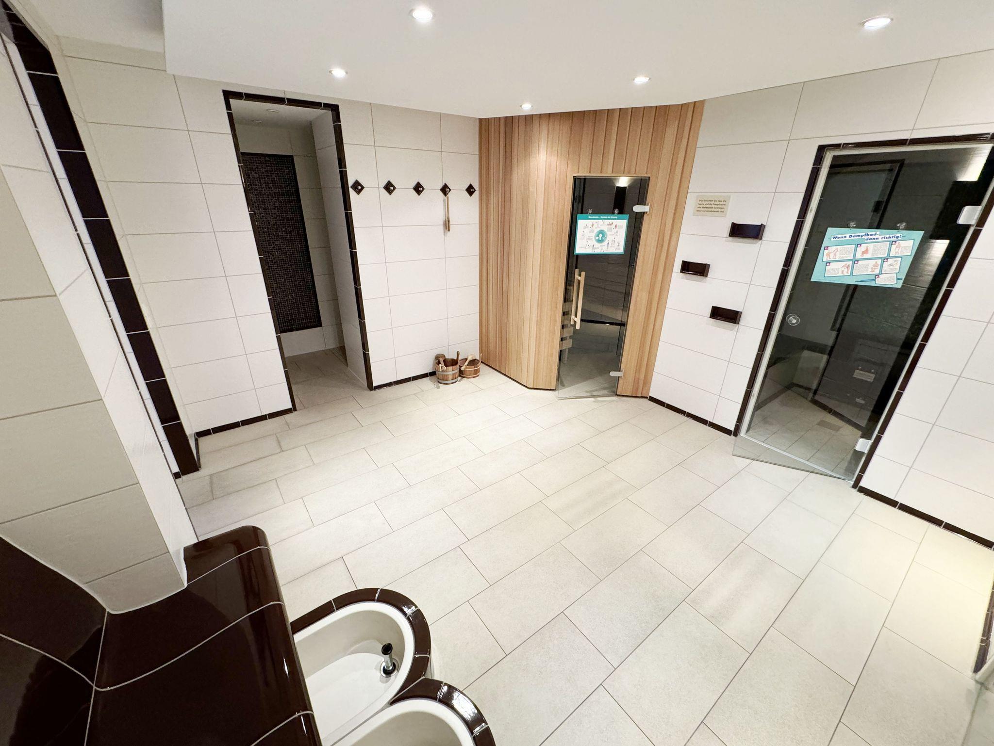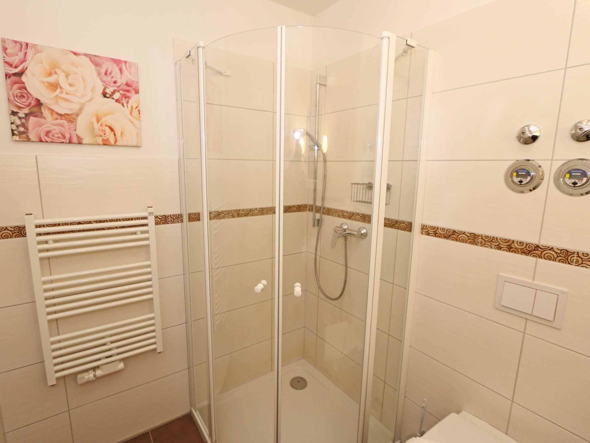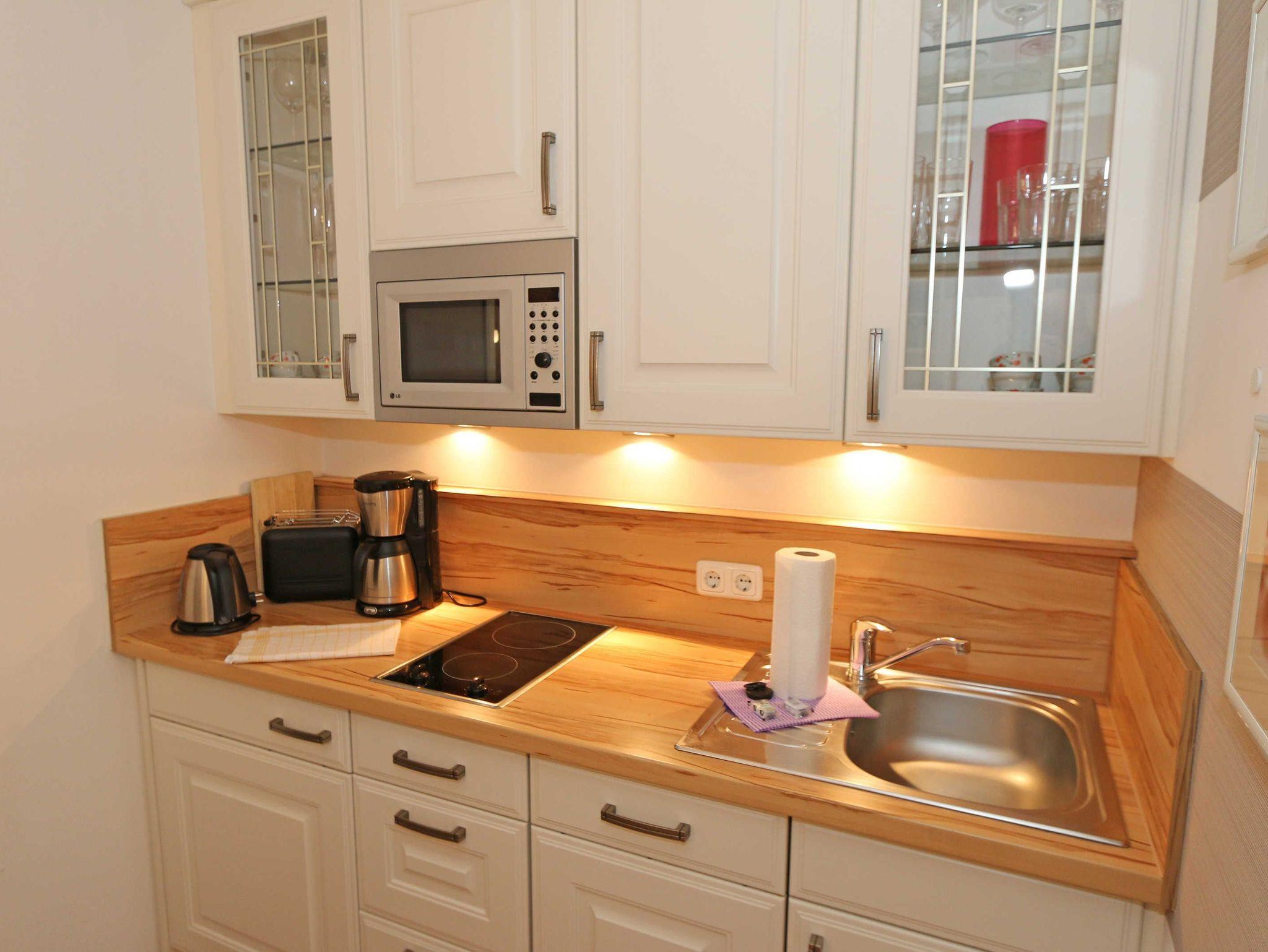 Die Nichtraucherwohnung umfasst ca. 49 m² und befindet sich in der ersten Etage des Hauses. Diese können Sie bequem mit dem Aufzug erreichen. Der geräumige Wohnbereich verfügt über ein Ecksofa (1,60 m x 2,00 m), welches als Aufbettungsmöglichkeit für zwei Personen genutzt werden kann, einen Couchtisch sowie einer Anrichte und Vitrine. Abgerundet wird der Wohnbereich durch einen LED-TV, einer Mini-Stereo-Anlage mit CD- und Blue-Ray-Player, sowie einer Spielesammlung und DVD's. Auch auf einen Internetanschluss (WLAN) brauchen Sie nicht verzichten. Dieser ist für Sie inklusive. Ein Plätzchen mit einem bequemen Sessel und einer Leselampe finden Sie zusätzlich mit einer kleinen Auswahl an Büchern für Groß und Klein. Angrenzend befindet sich die kleine Küchenzeile mit einen 2 Zonenceranfeld, einen Kühlschrank mit Gefrierfach, einen Geschirrspüler, eine Mikrowelle, eine Kaffeemaschine, einen Wasserkocher, einen Toaster sowie diverse Küchenutensilien. Gemütlich und bequem können Sie Ihre Mahlzeiten am Esstisch genießen. Vom Wohn- und Schlafbereich können Sie den bestuhlten Balkon (Ost) erreichen. Das Schlafzimmer, welches auch mit einem LED-TV ausgestattet ist, verfügt über ein Doppelbett (1,80 m x 2,00 m), verstellbaren Lattenroste, 2 Nachttischablagen und ein Kleiderschrank. Im Bad finden Sie neben einer ebenerdigen Glasdusche auch ein WC, einen Waschplatz, Handtuchheizkörper und einen Fön. Alle Räumlichkeiten verfügen über Fußbodenheizung, die für angenehme Wärme sorgt. Für einen glatt ablaufenden Urlaubstag stehen Ihnen ein Bügelbrett und ein Bügeleisen zur Verfügung. 2 kleine Haustiere sind mit Ihrem eigenen Schlafplatz gegen eine Gebühr gern gesehene Gäste. Empfehlenswert ist der stilvoll ausgebaute Wellnessbereich, der von allen Hausgästen gegen eine Gebühr genutzt werden kann. Die Wertmarken können Sie auf Nachfrage während Ihres Urlaubes erwerben. Hier im Erdgeschoß finden Sie in der Sauna, im Dampfbad und im Ruheraum vor allem in den kalten Jahreszeiten, Entspannung und pure Ruhe. Von Ihrem Tiefgaragenstellplatz (Nr.04, Einfahrtshöhe 2,00 m) Doppelparker Höhe 1,80 m und Länge 5,00, können Sie bequem durch den Aufzug Ihre Wohnung erreichen. Ein abschließbarer Fahrradraum steht Ihnen in der Tiefgarage zur Verfügung. Die Erstausstattung eines Wäschepaketes (komplette Bettwäsche, 1 Duschhandtuch, 1 kleines Handtuch) können Sie bis 14 Tage vor Anreise gegen einen Aufpreis dazu buchen oder durch eigene ergänzen. Ab 2 gebuchten Paketen erhalten Sie einmalig 1 Geschirrhandtuch und 1 Duschvorleger hinzu.