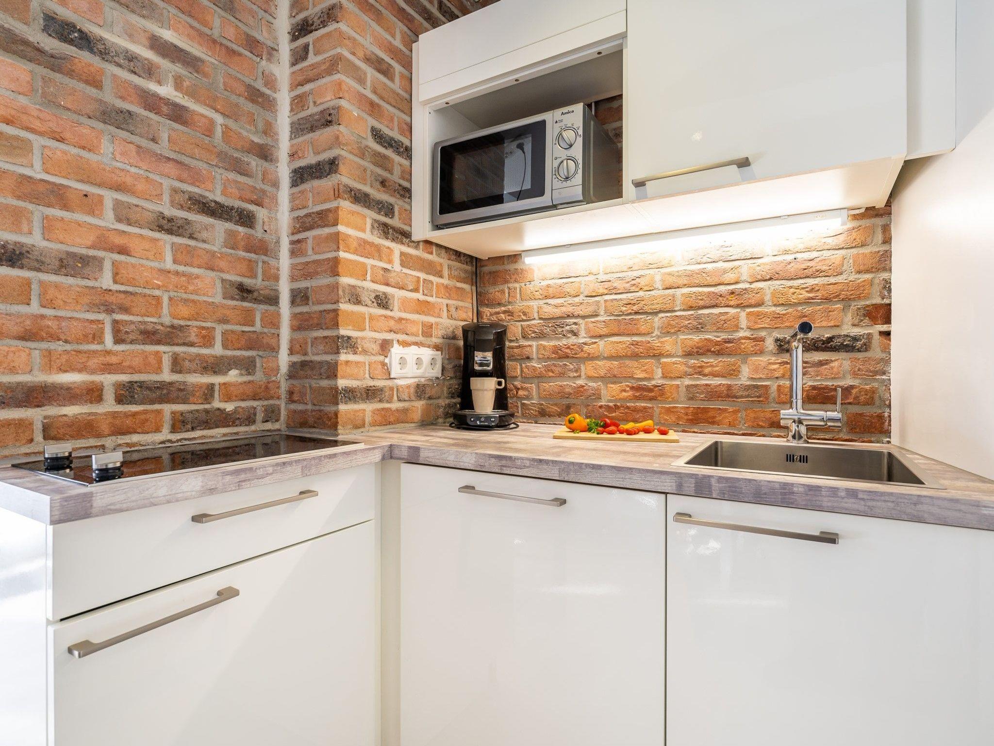• komplett eingerichtete Miniküche mit Mikrowelle und Essplatz