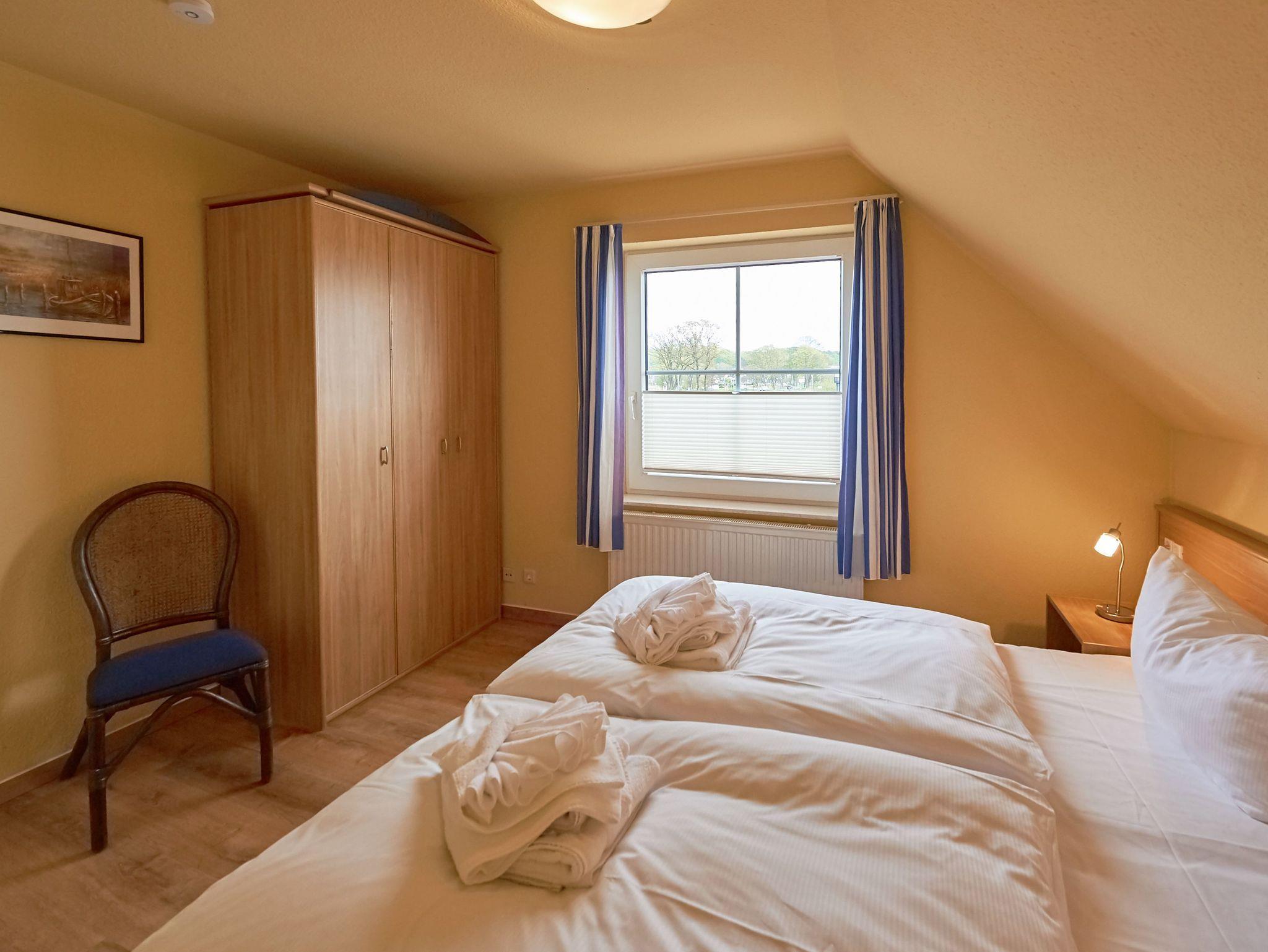 Eines der beiden Schlafzimmer verfügt über ein Doppelbett, das andere über zwei Einzelbetten. Im Badezimmer mit Dusche gibt es auch eine Waschmaschine.