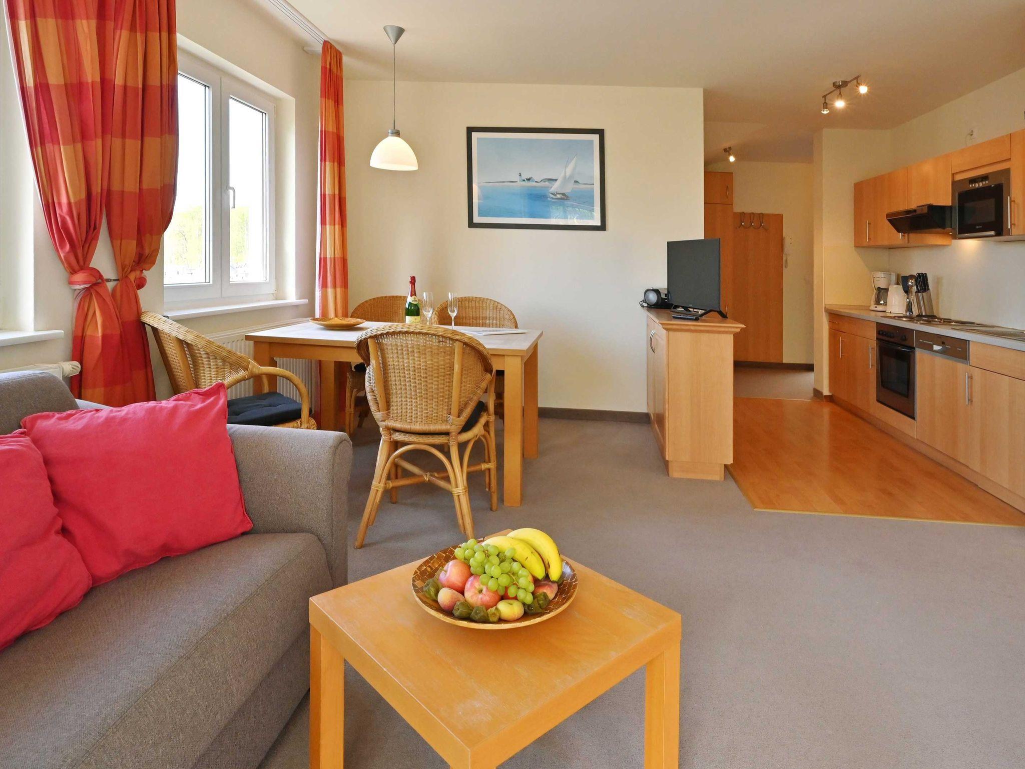 Ein Doppelbett, zwei Einzelbetten, eine Doppelschlafcouch, ein Balkon, voll ausgestattete Küchenzeile (mit Geschirrspüler, Mikrowelle, Backofen, Tiefkühlfach), Bad (Badewanne mit Dusche, WC), Fahrstuhl in das 3. Obergeschoss, kostenlose Sauna-Nutzung, Kinderbett und Kinderstuhl auf Anfrage kostenlos stellbar, kostenlose W-LAN-Nutzung, Münzwaschmaschine und Trockner, Parkplatz (entgeltlich), Rauchen im gesamten Haus nicht erlaubt (aber auf dem Balkon möglich).
