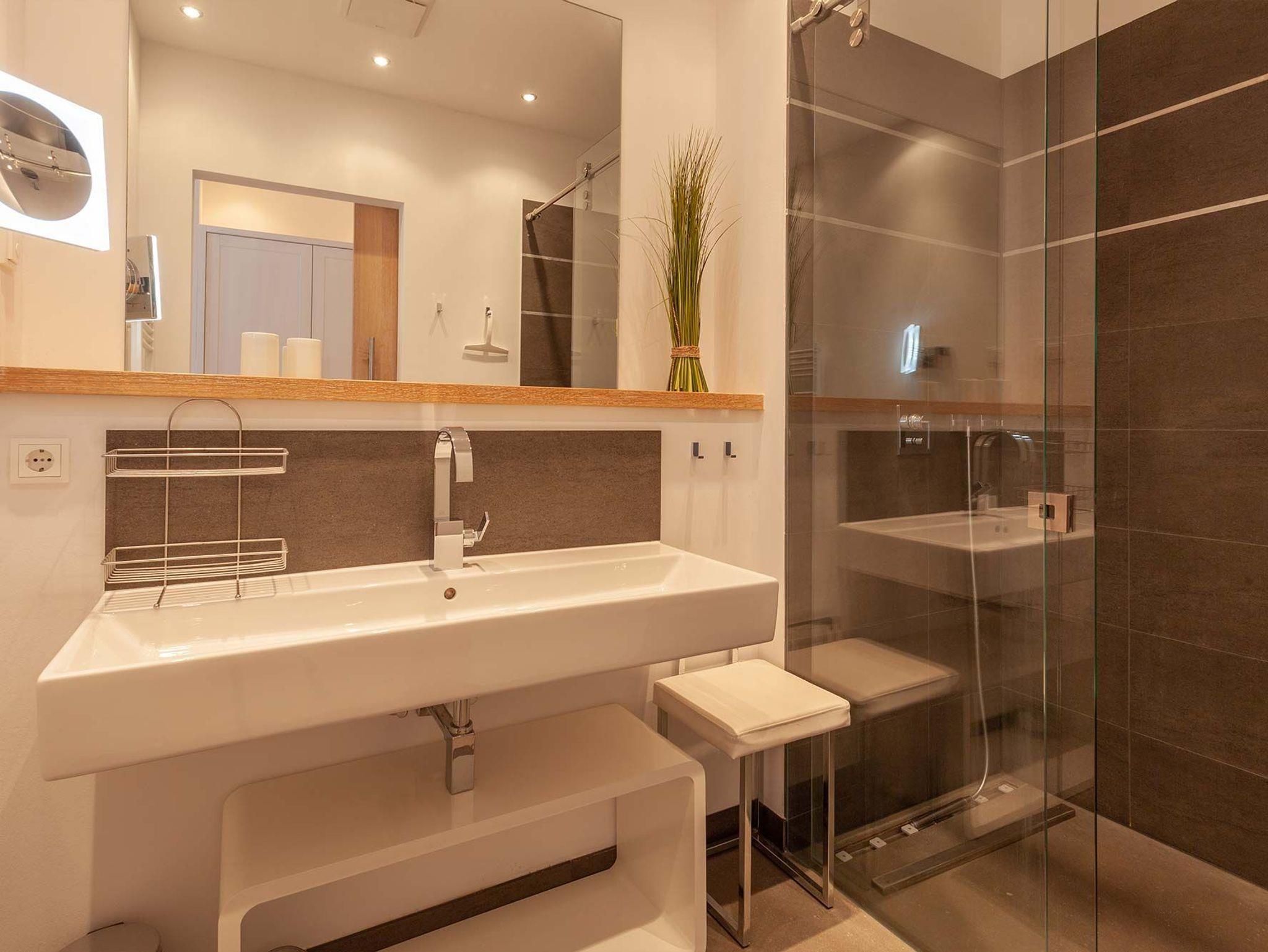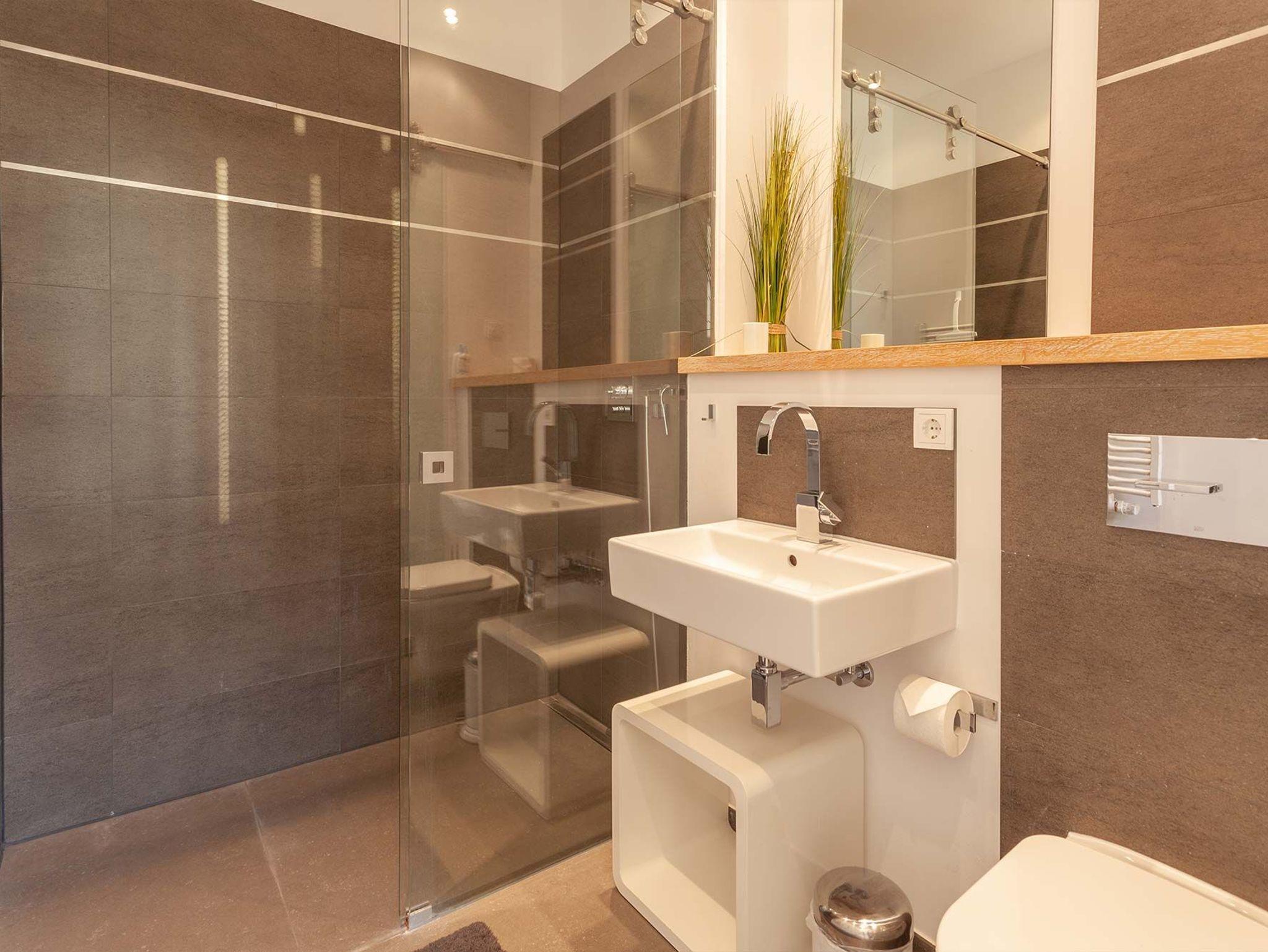 Dank der vielen bodentiefen Fenster, erwartet Sie eine rundum lichtdurchflutete Unterkunft, welche hohen Ansprüchen genügt. Die Wohnung selbst verfügt über einen hochwertigen Wohnbereich mit Fußbodenheizung und Kaminofen, gemütlichen Sofa, Essbereich und offener Küche. Die beiden Schlafzimmer verfügen jeweils über ein eigenes Ensuite-Bad. Zusätzlich dazu, gibt es noch ein weiteres Gäste-WC.