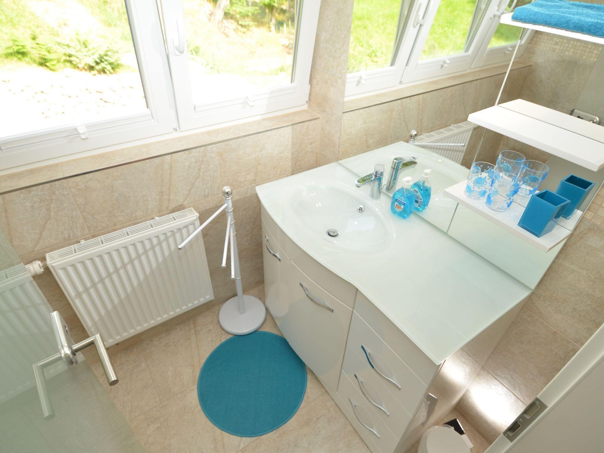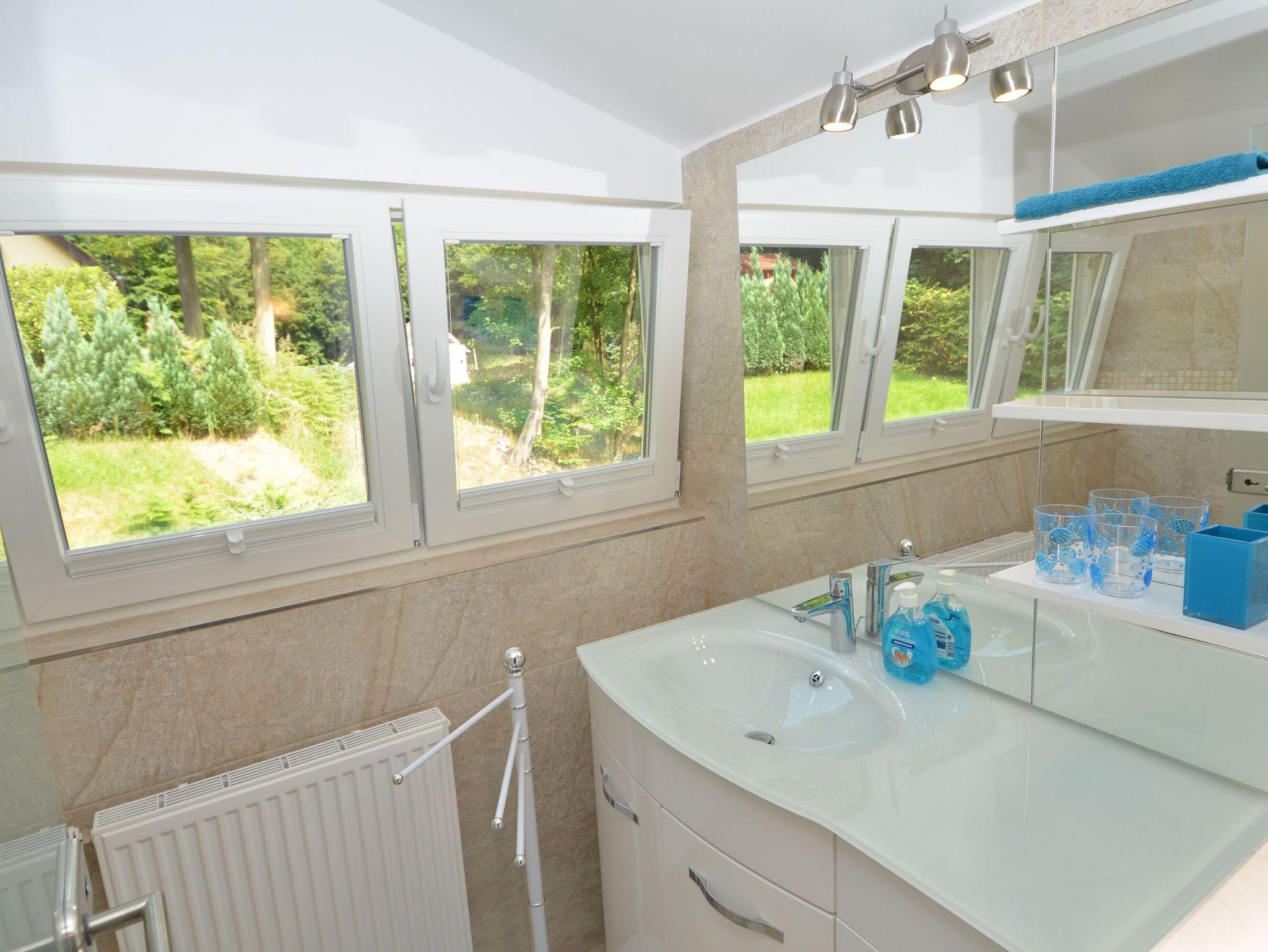 Ein großzügiges Duschbad mit WC, Waschtisch und Tageslicht sowie ein Hauswirtschaftsraum mit Waschmaschine befinden sich ebenfalls auf dieser Ebene.