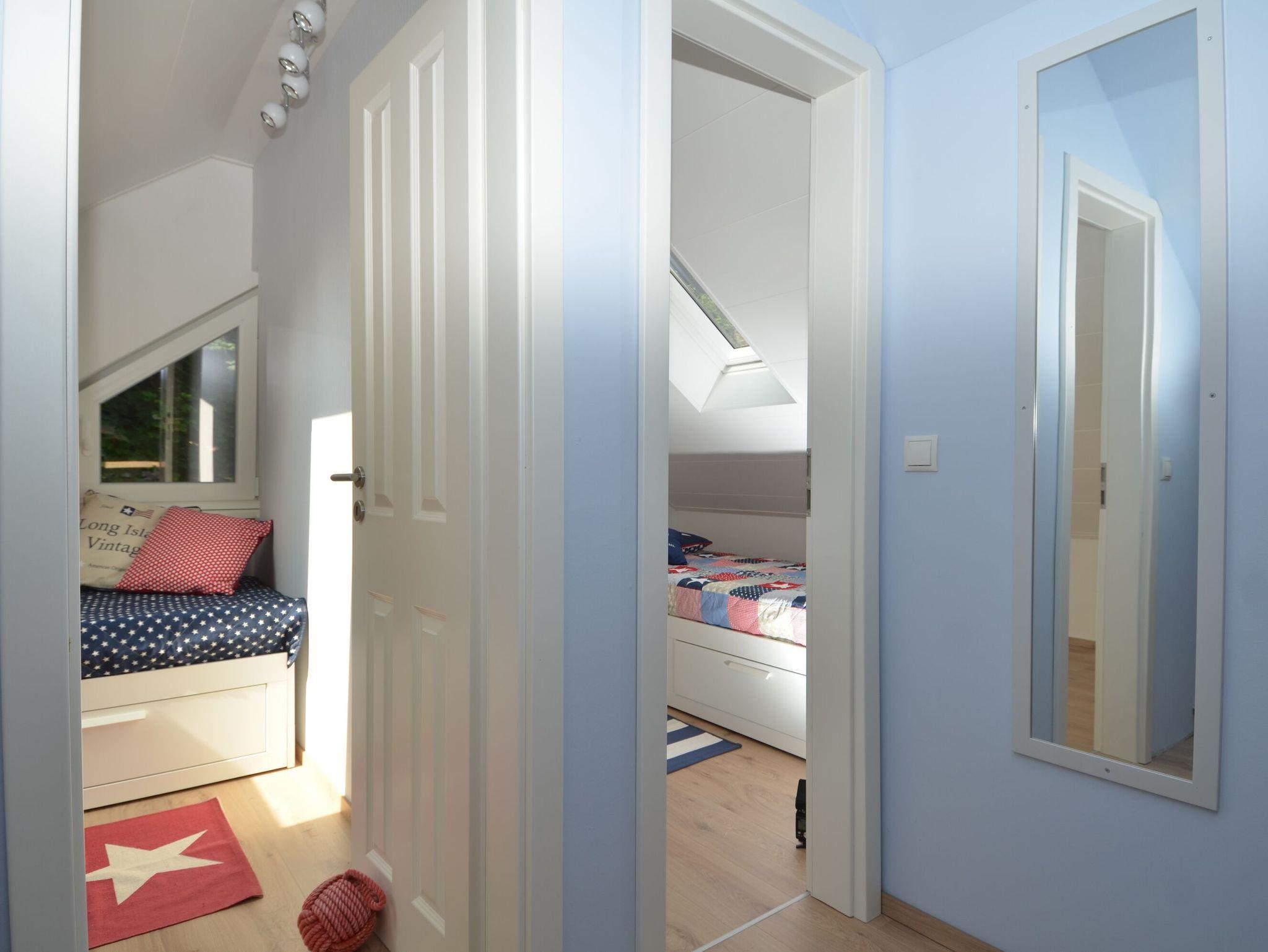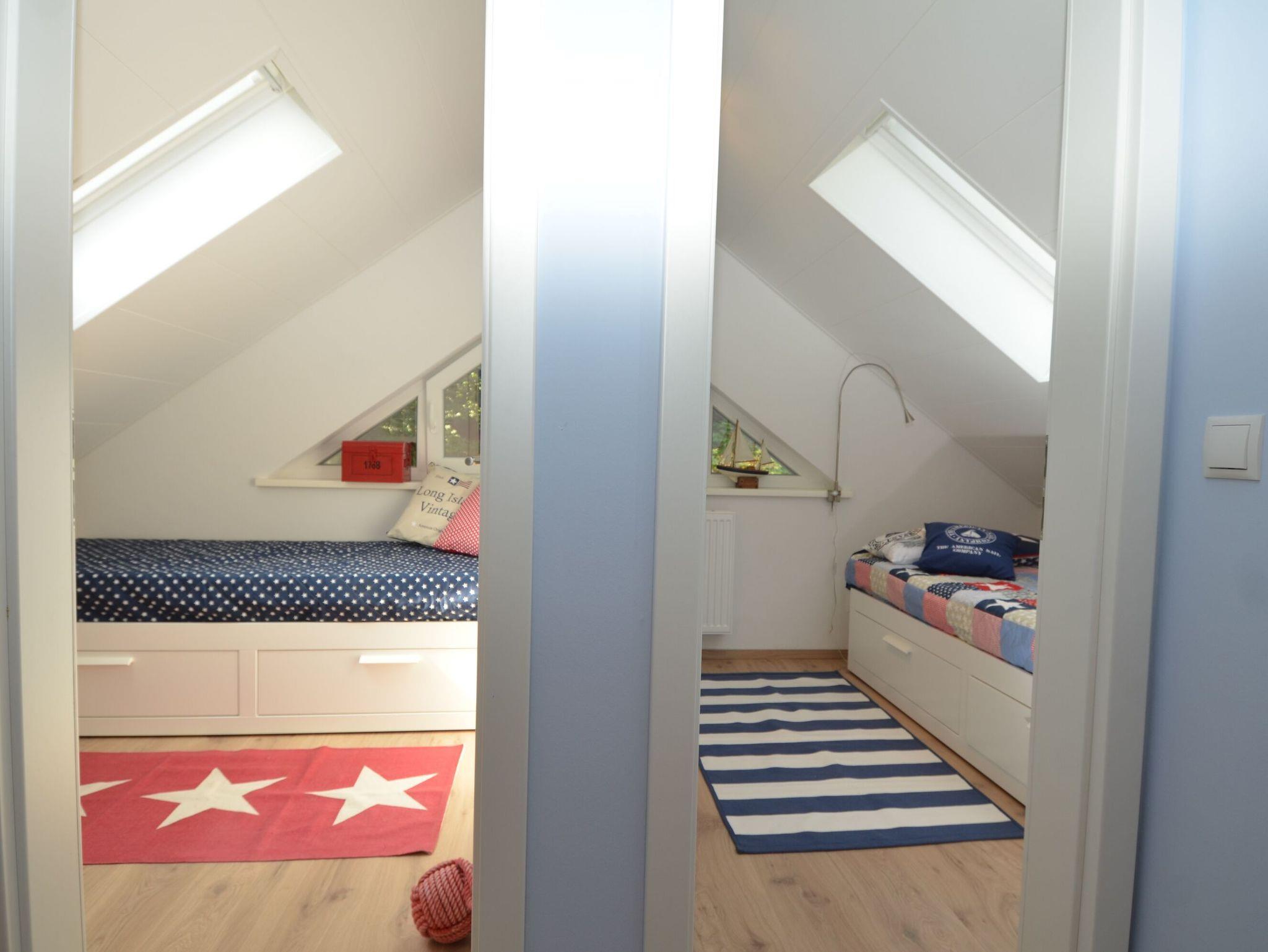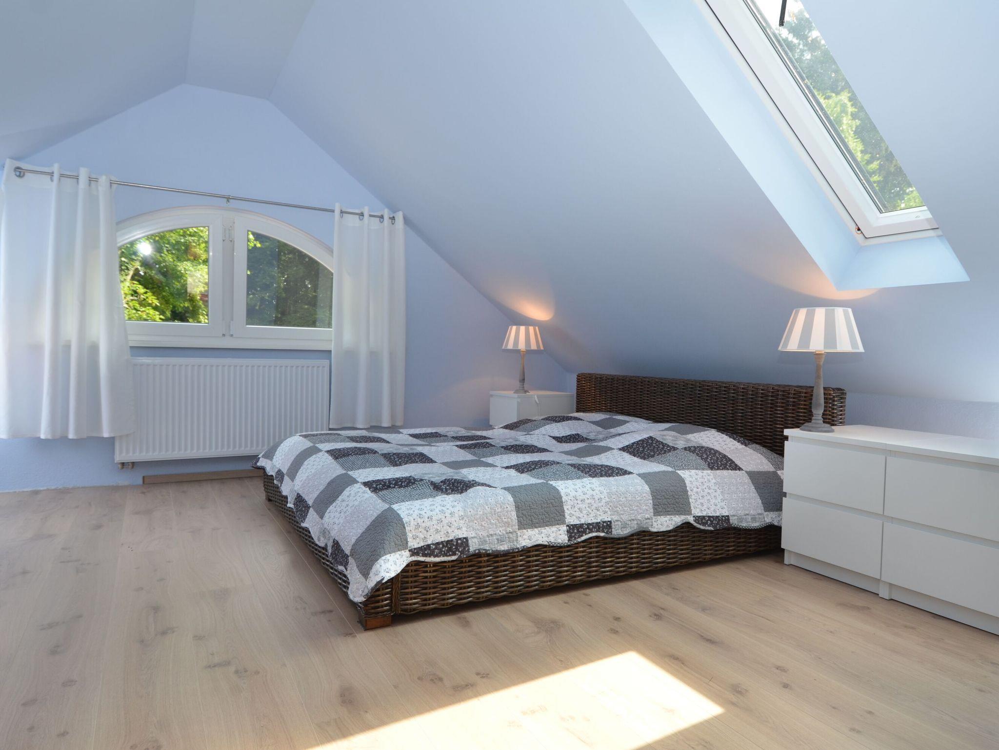 Im Dachgeschoss des Hauses gibt es ein großes Schlafzimmer mit einem Doppelbett (1,80 x 2,00 m) und zwei kleine Schlafzimmer (je ca. 6 qm) mit je einem Einzelbett (0,80 x 2,00 m), welche ausziehbar sind und dadurch eine Liegefläche von 1,60 x 2,00 m auf einer Ebene ermöglichen. Im Dachgeschoss gibt es auch ein zweites WC mit Waschtisch.