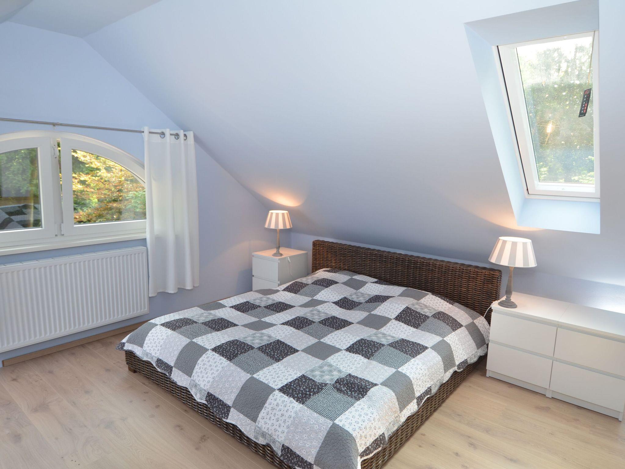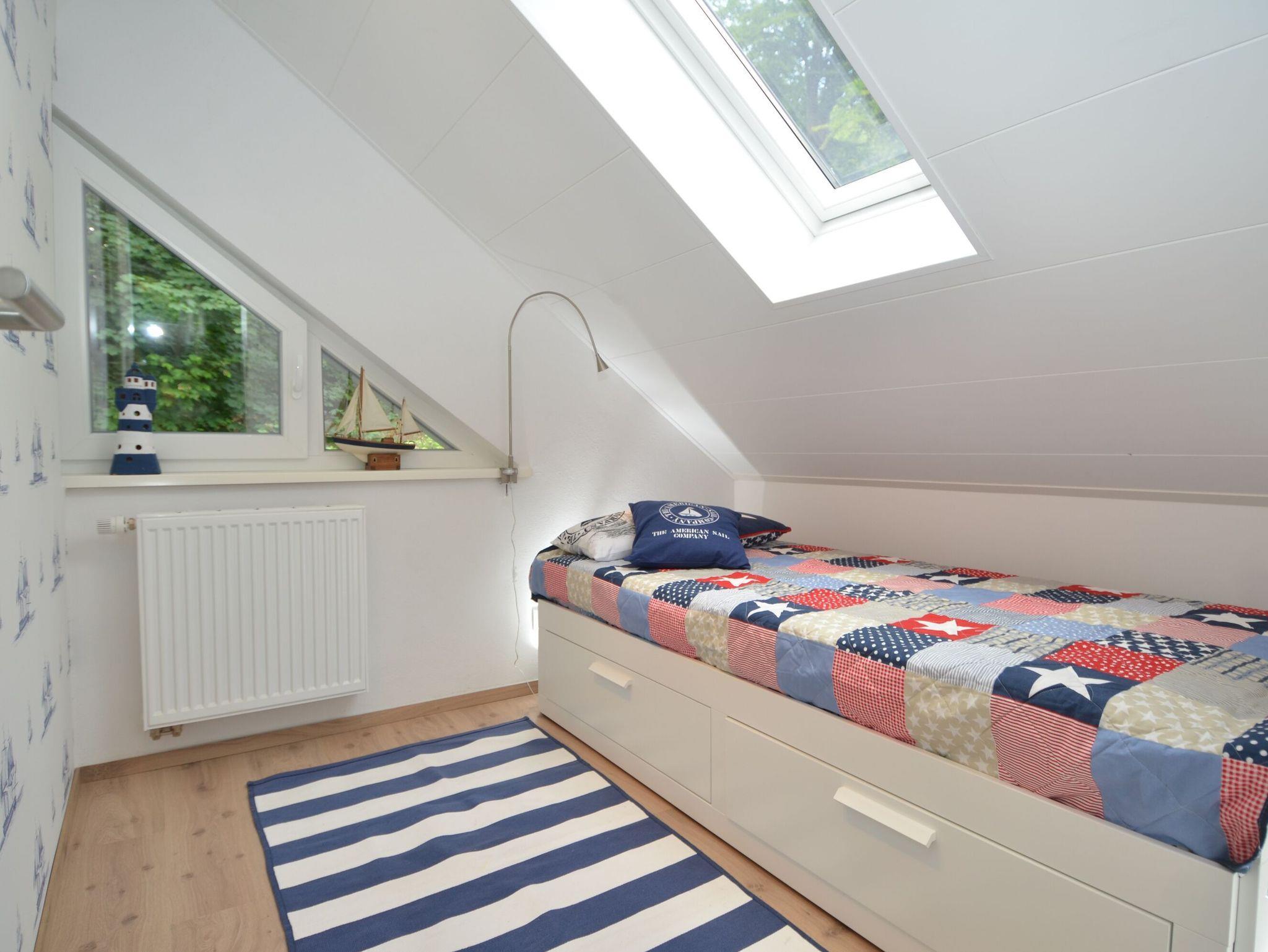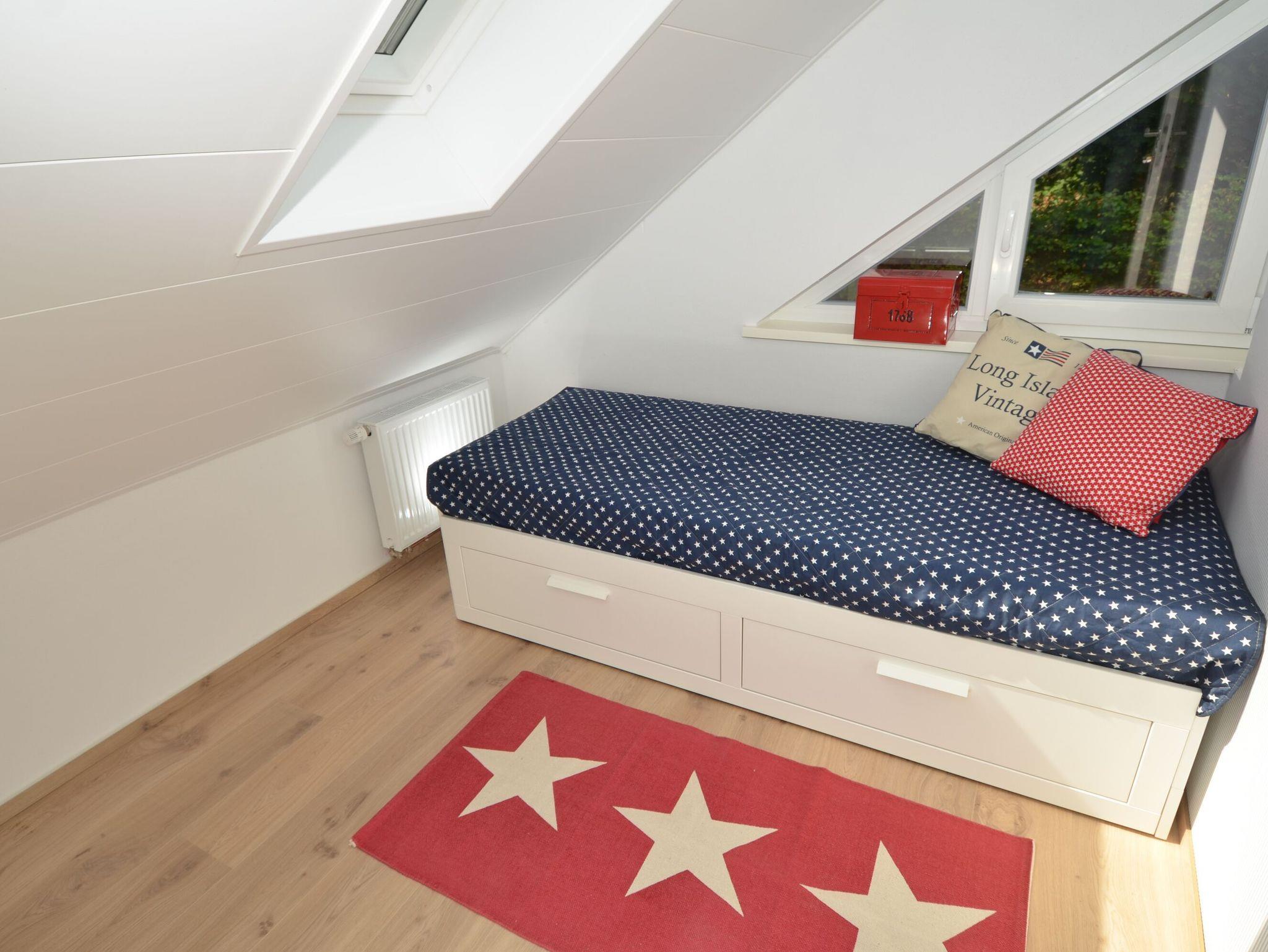Im Dachgeschoss des Hauses gibt es ein großes Schlafzimmer mit einem Doppelbett (1,80 x 2,00 m) und zwei kleine Schlafzimmer (je ca. 6 qm) mit je einem Einzelbett (0,80 x 2,00 m), welche ausziehbar sind und dadurch eine Liegefläche von 1,60 x 2,00 m auf einer Ebene ermöglichen. Im Dachgeschoss gibt es auch ein zweites WC mit Waschtisch.
