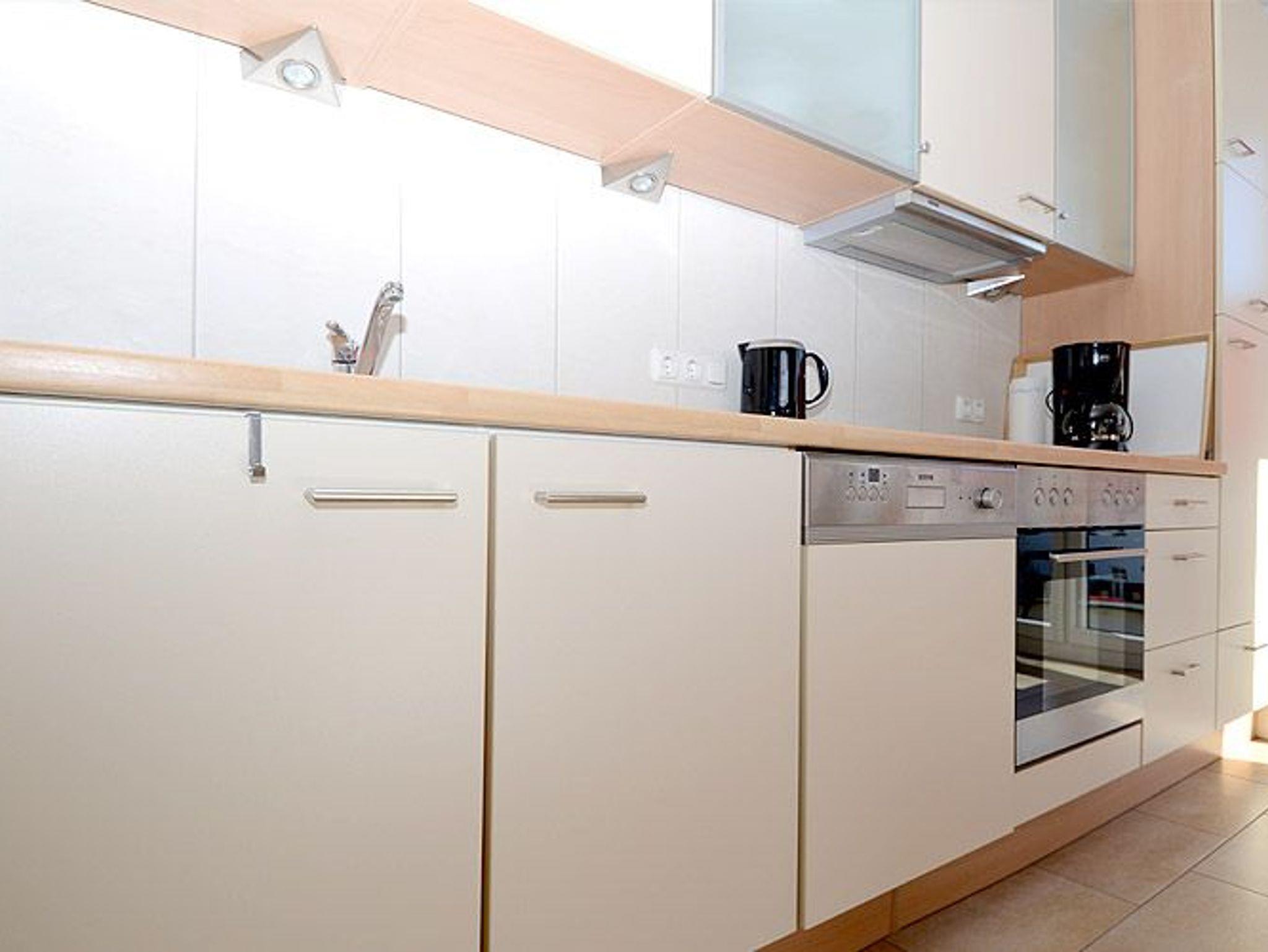 Angrenzend befindet sich die gemütliche Essecke mit offener Küche. In dieser finden Sie einen Kühlschrank mit Gefrierfach, einen Backofen, ein 4-Platten-Ceranfeld, eine Spülmaschine sowie eine Mikrowelle, Toaster, Mixer, einen Eierkocher für das morgendliche Frühstücksei und diverses Kleininventar, das die Küchenausstattung komplettiert. Bis zum nächsten Bäcker für die frischen Frühstücksbrötchen sind es nur wenige Gehminuten.