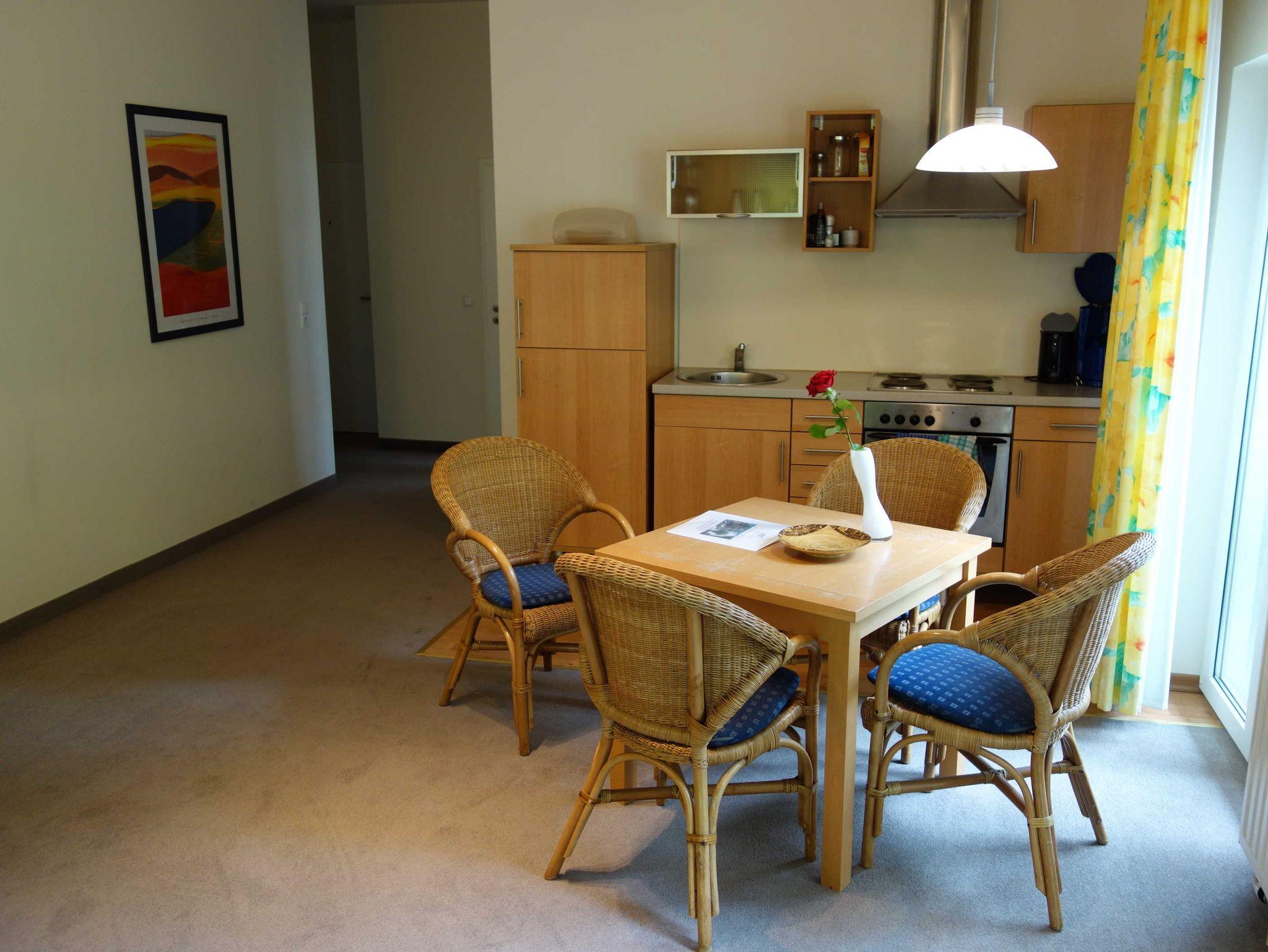 Ein Doppelbett, eine Doppelschlafcouch, ein Balkon, Küchenzeile mit Mikrowelle, Backofen und Tiefkühlfach, Bad (Dusche, WC), kostenlose Sauna-Nutzung, Kinderbett und Kinderstuhl auf Anfrage kostenlos stellbar, kostenlose W-LAN-Nutzung, Münzwaschmaschine und Trockner, Parkplatz (entgeltlich), Hunde und Haustiere auf Anfrage (entgeltlich) möglich, Rauchen im gesamten Haus nicht erlaubt (aber auf dem Balkon möglich).