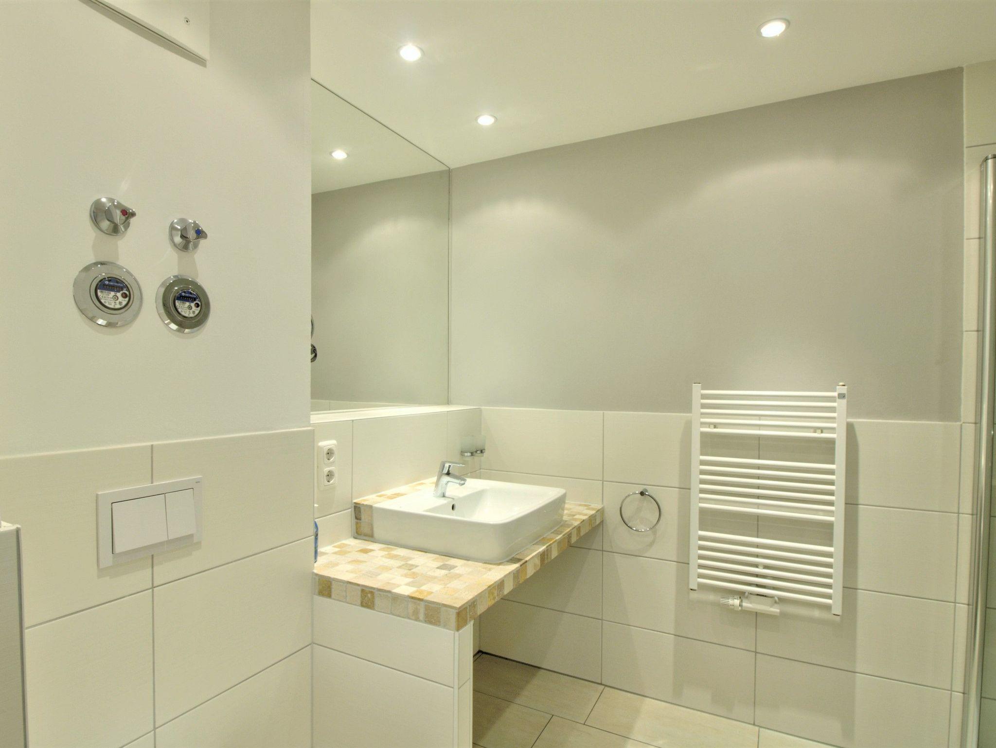 Im hell erleuchteten Badezimmer befinden sich neben einer Toilette und einem Waschbecken eine schöne Glasdusche. Zudem steht Ihnen in der Wohnung 1 noch ein zusätzliches Gäste-WC zur Verfügung.