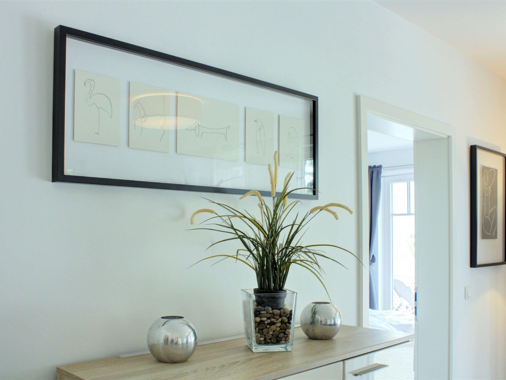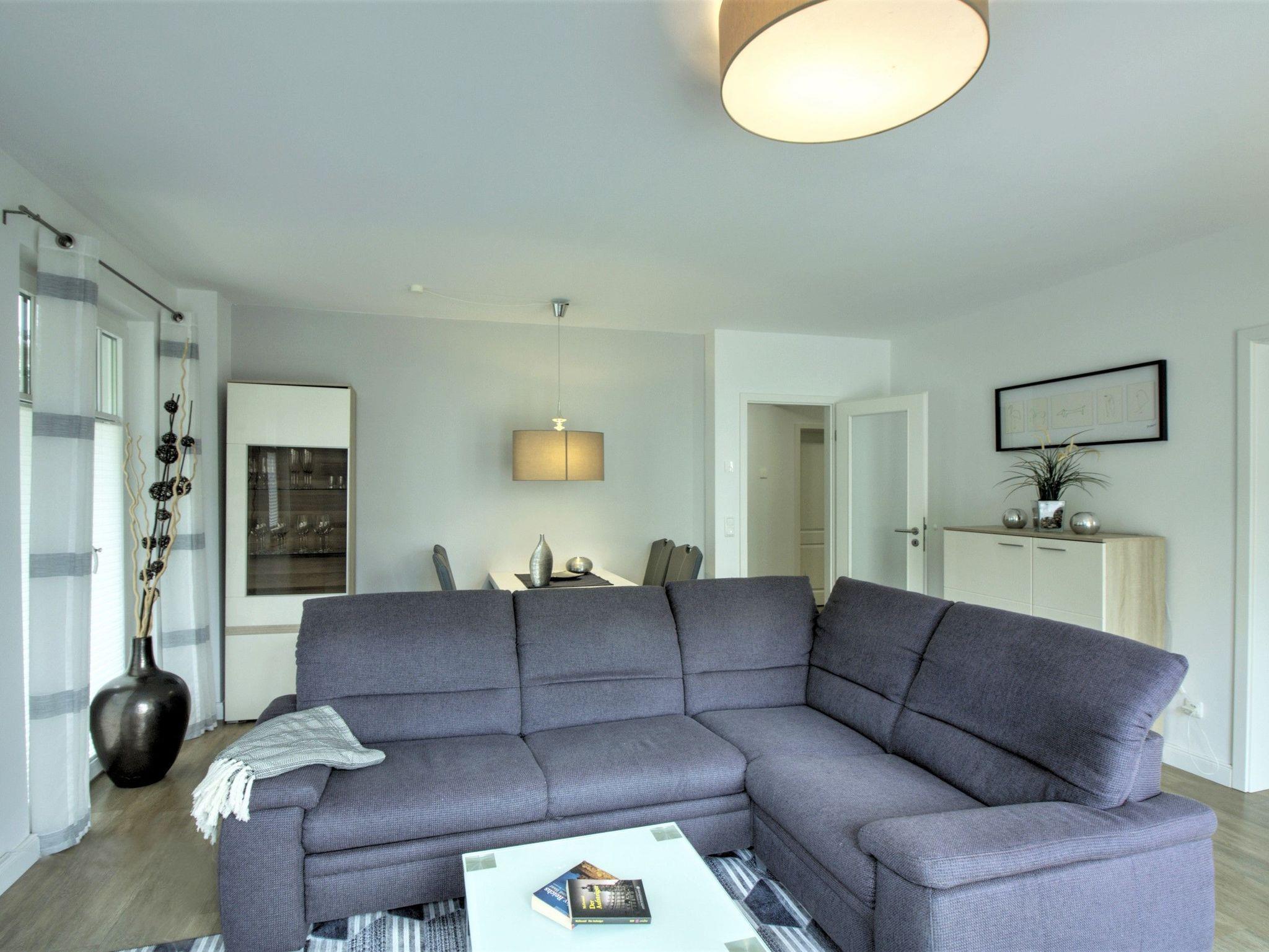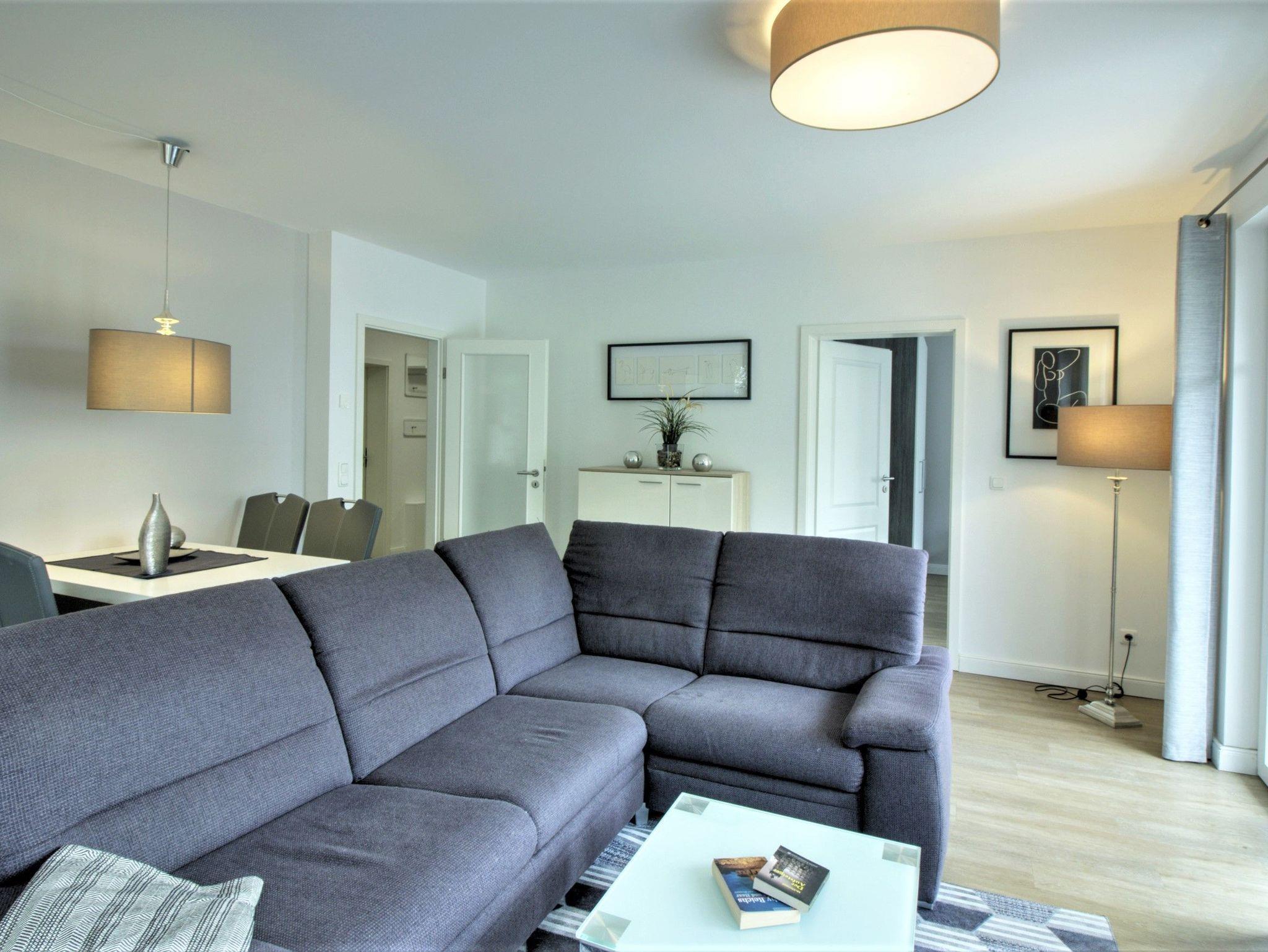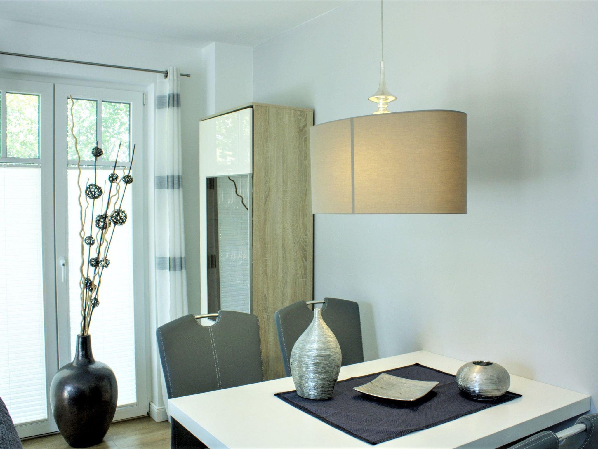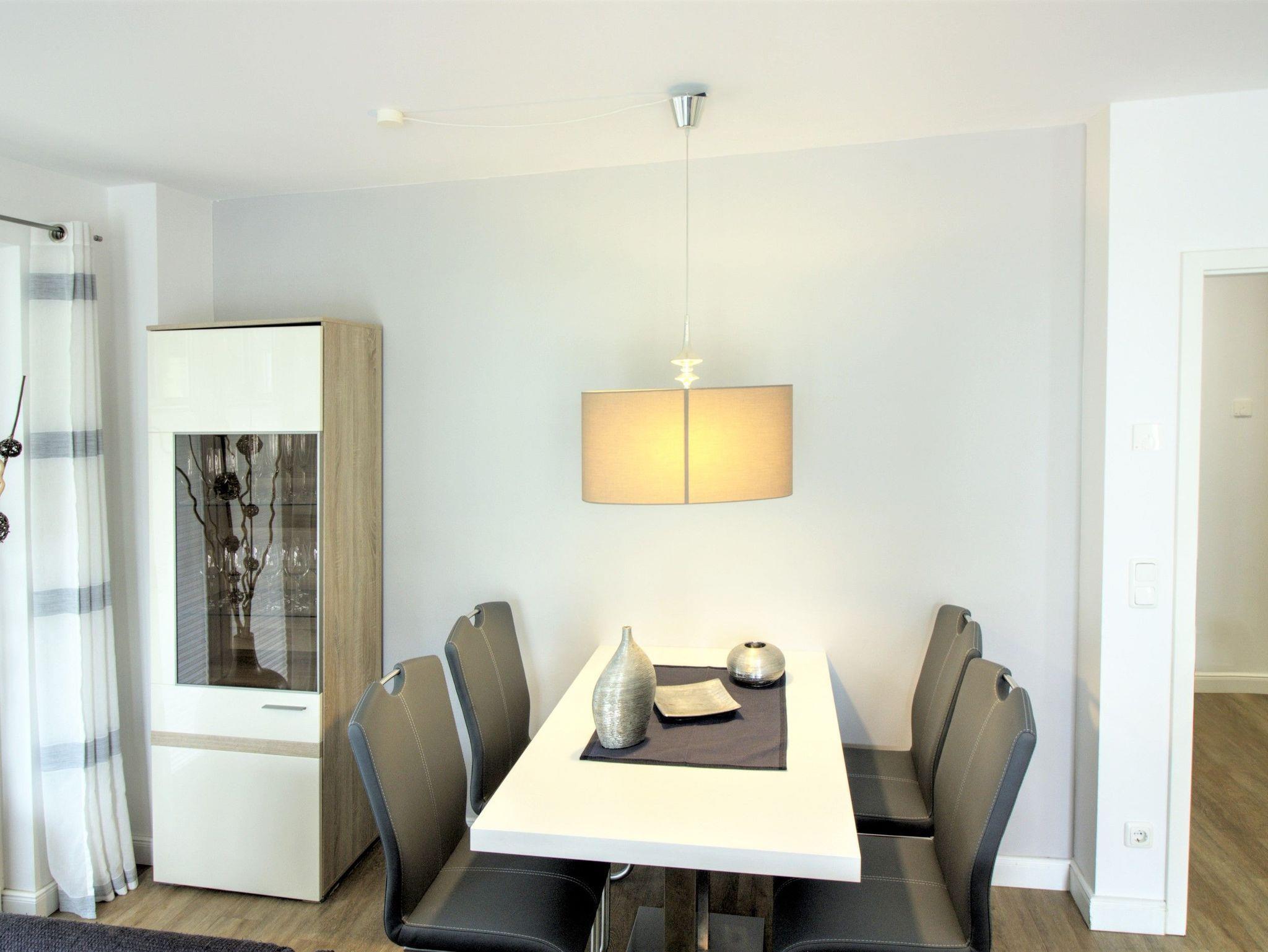 Betreten Sie den hell erleuchteten Wohnungsflur, der Sie in alle weiteren Räume begleitet. Der Wohnbereich verfügt nicht nur über eine moderne Couchgarnitur und einen Flachbild-TV, sondern auch über einen freundlichen Essbereich für bis zu 4 Personen.