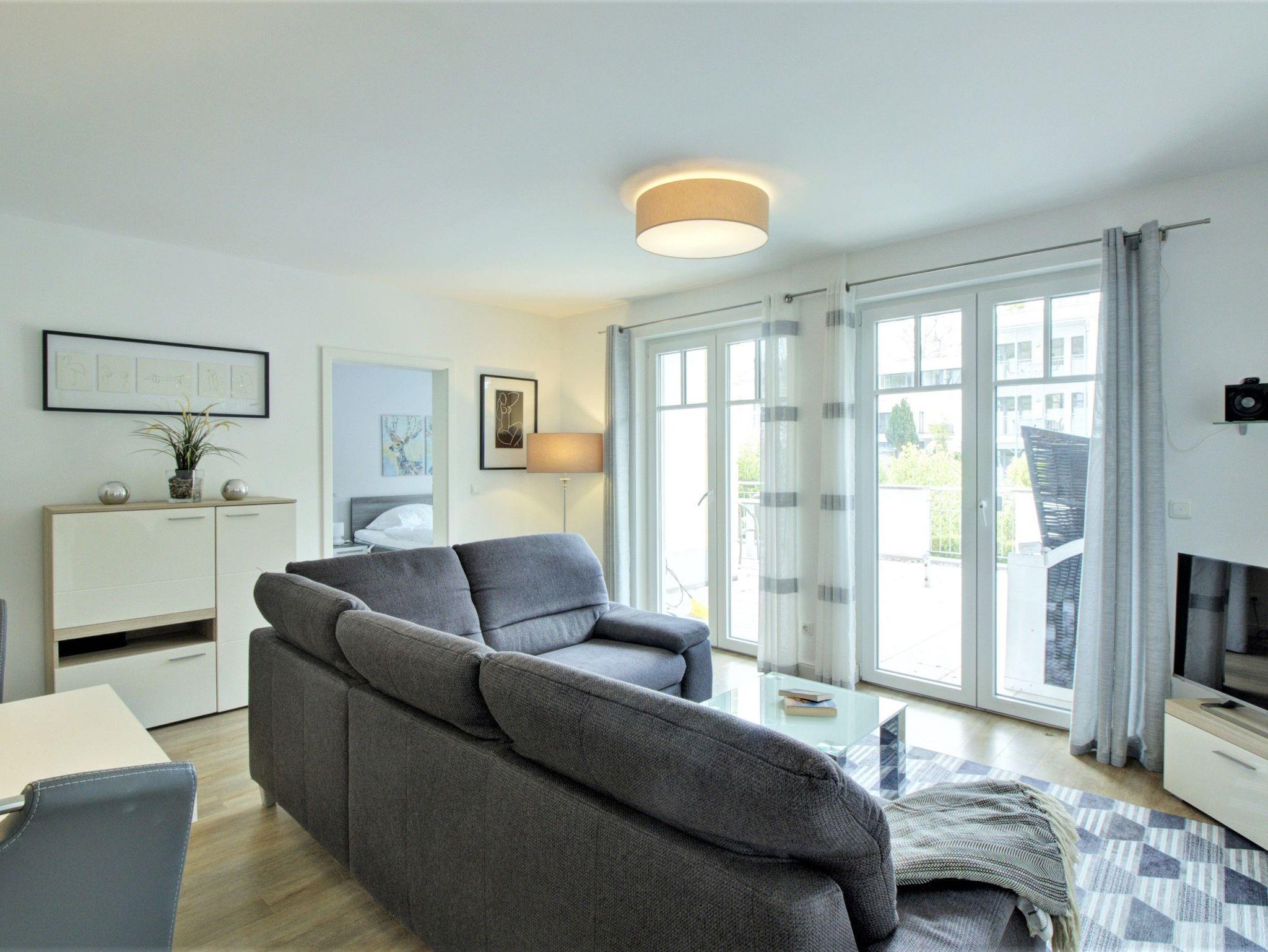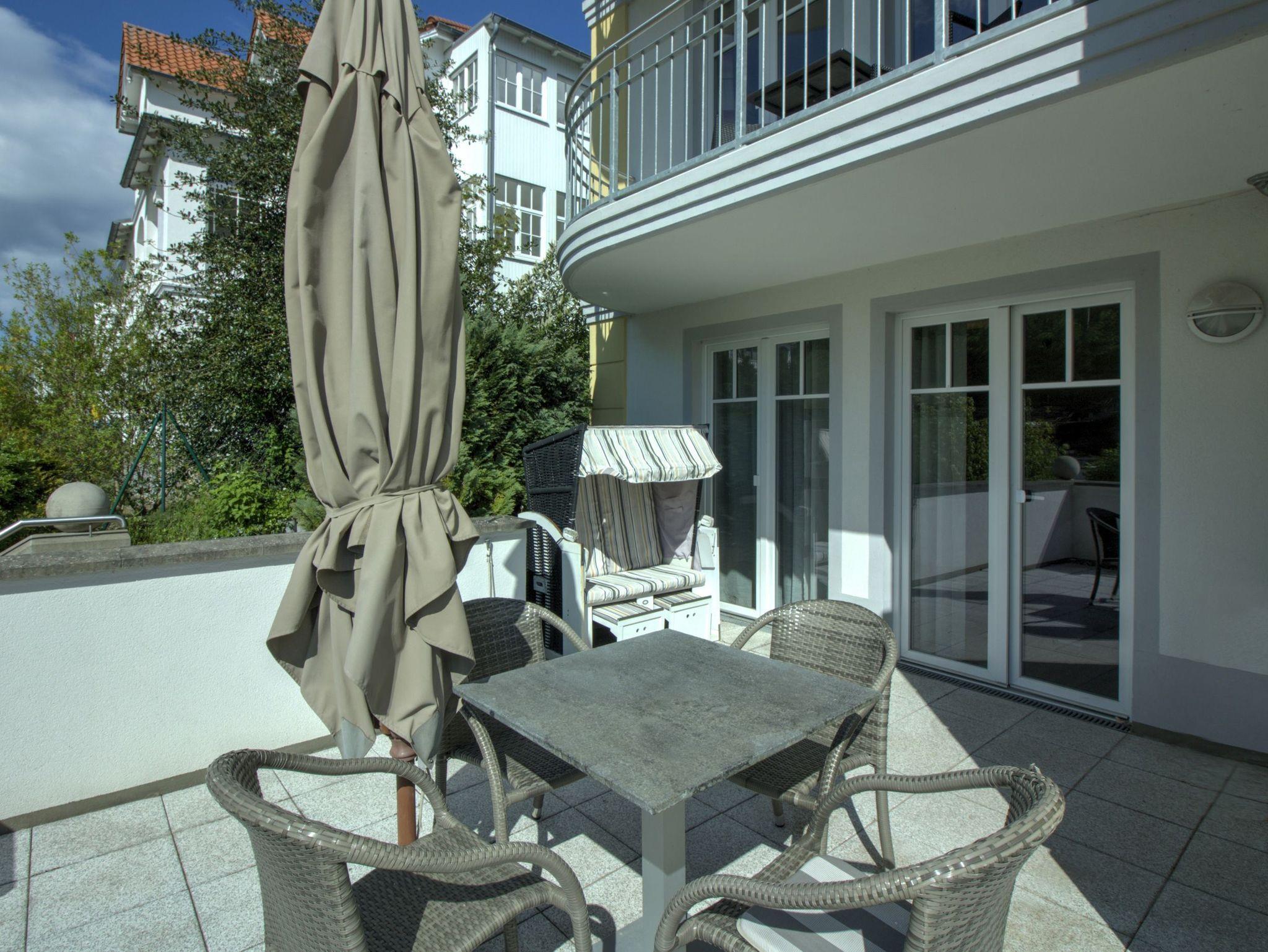 Moderne Ferienwohnung nahe Selliner Hauptstrand mit Terrasse und Strandkorb auf Rügen.
