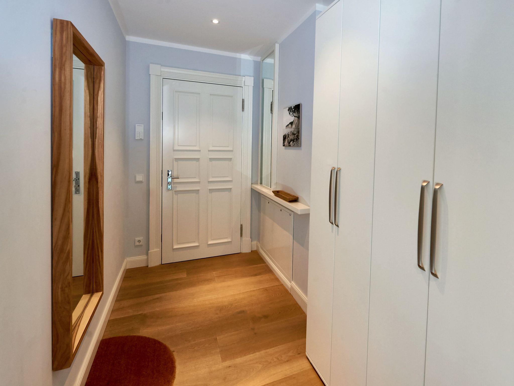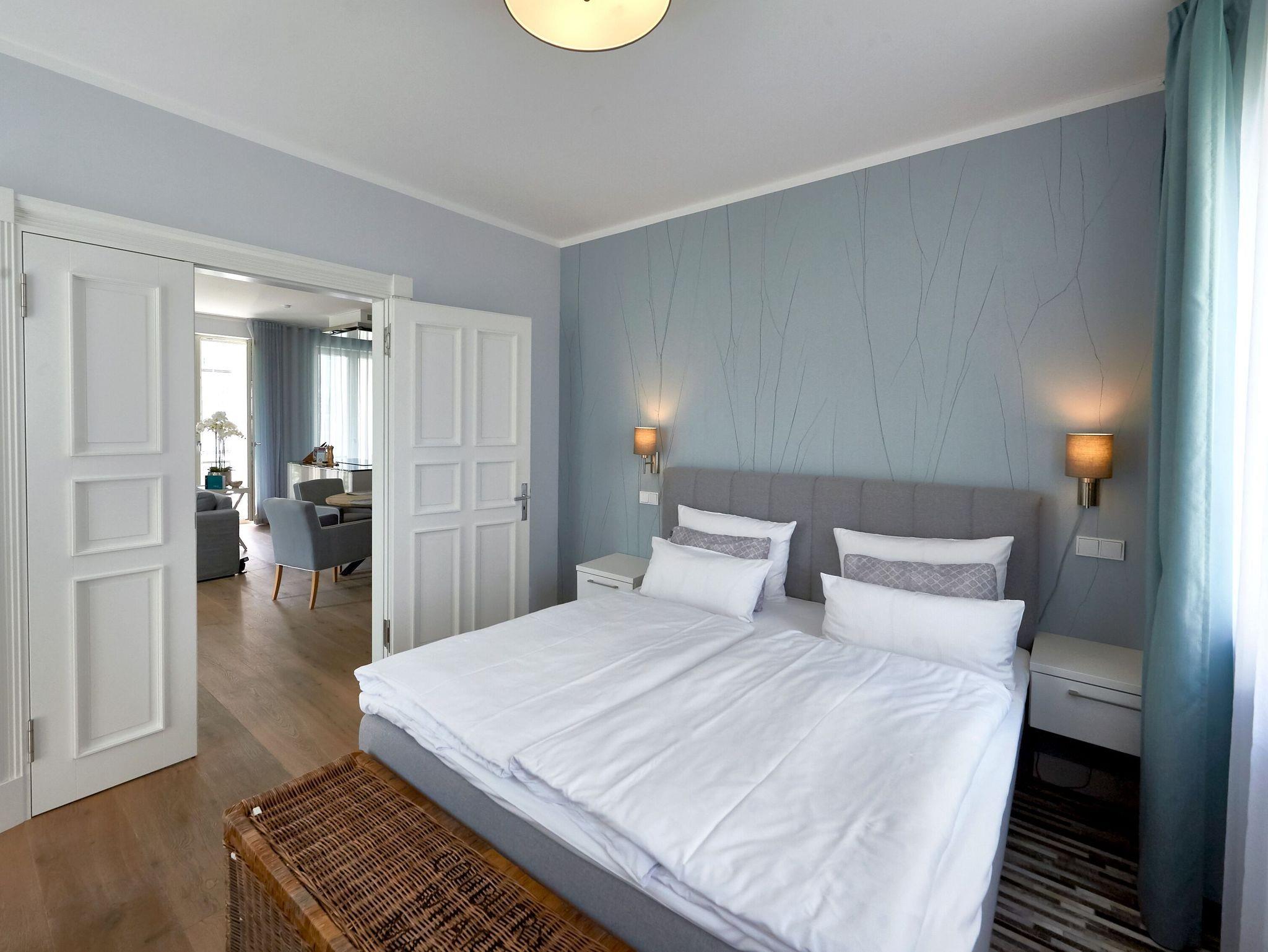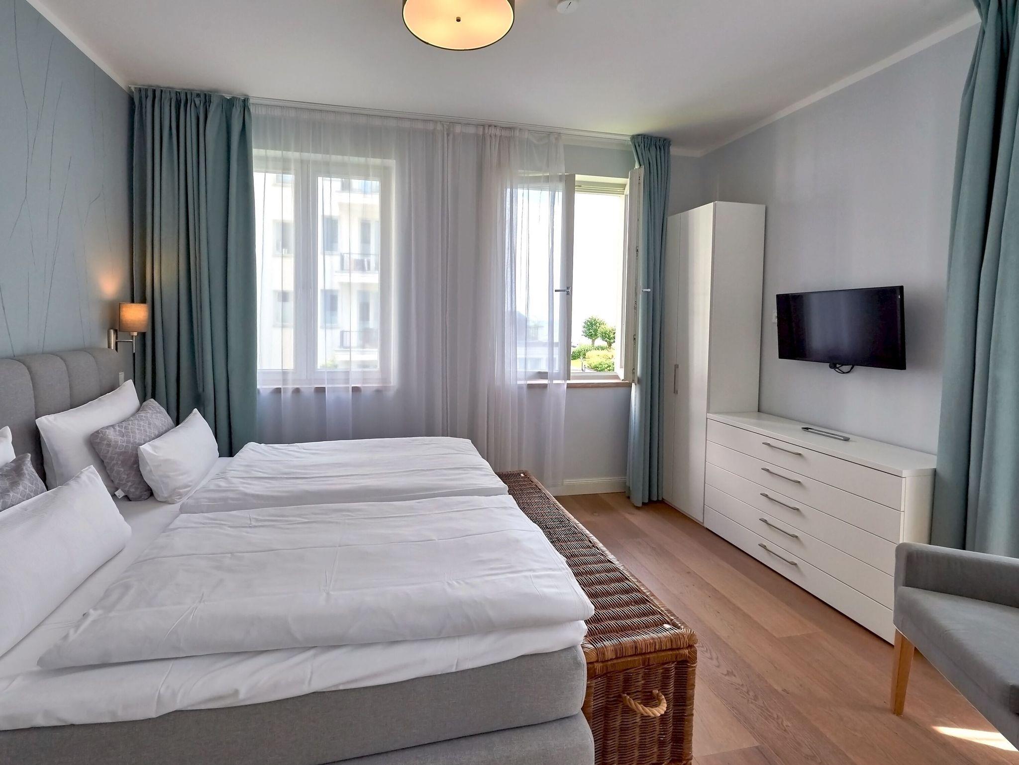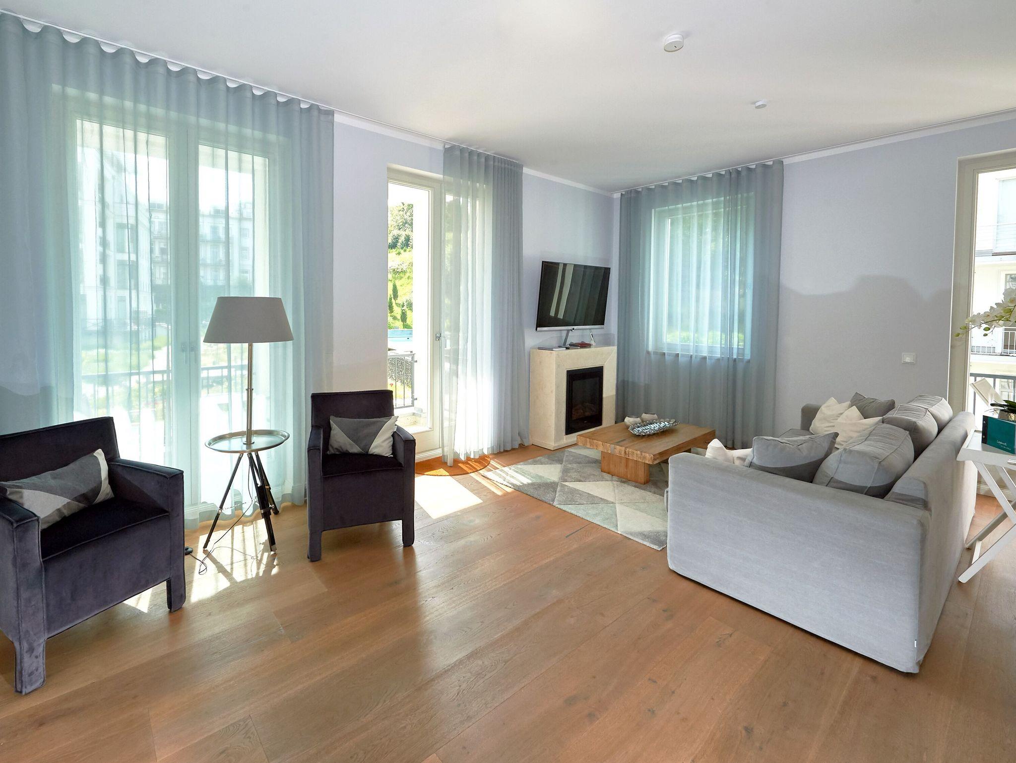 An den geräumigen Flurbereich mit Garderobe und Kleiderschrank grenzen das Wohnzimmer, das Badezimmer und eines der beiden Schlafzimmer an. Wohin man auch schaut, überall sieht und spürt man den erlesenen Geschmack und die Liebe, die die Eigentümer der Baltic Sea in die Einrichtung gelegt haben. Das kombinierte Wohn- und Esszimmer begeistert mit raumhohen Fensterfronten, einer offenen Küche, einem repräsentativen Elektrokamin, einem großen Flachbild-TV sowie eleganten Sitz- und Polstermöbeln. Auf den beiden überdachten Balkonen genießen Sie im Tagesverlauf die Sonne und haben neben einem seitlichen Meerblick auch den Blick auf den Poolbereich auf der windgeschützten Hofseite.