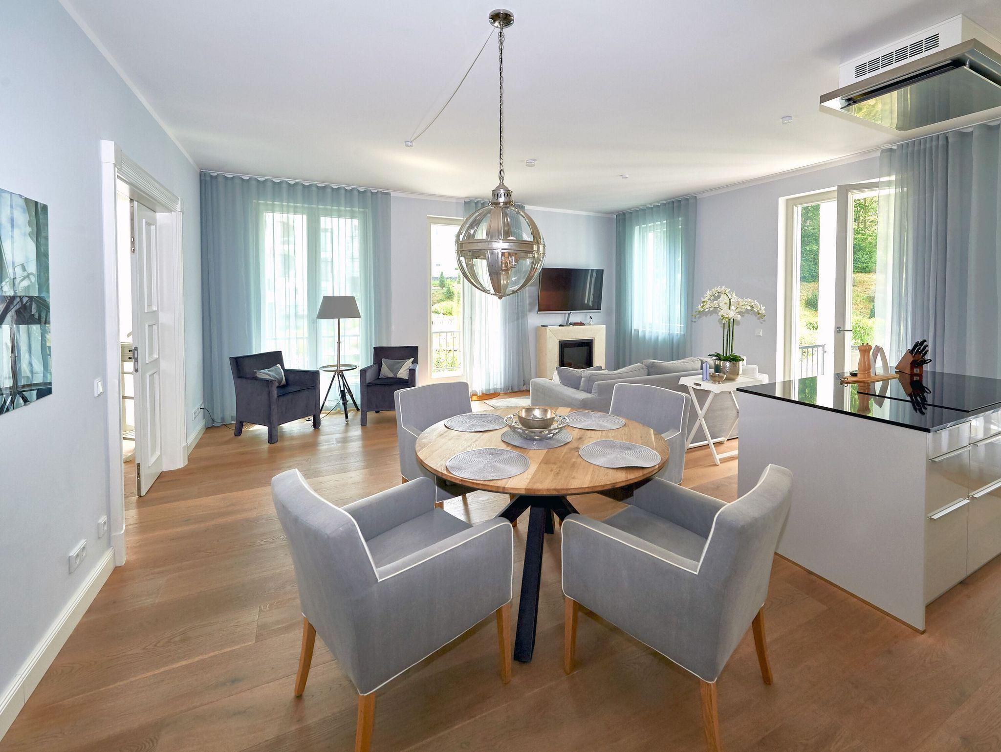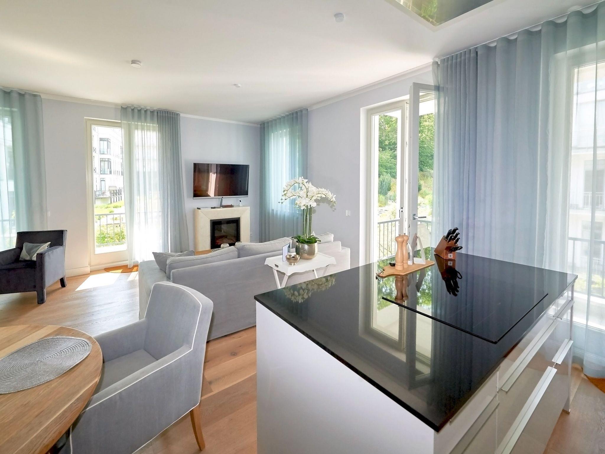 An den geräumigen Flurbereich mit Garderobe und Kleiderschrank grenzen das Wohnzimmer, das Badezimmer und eines der beiden Schlafzimmer an. Wohin man auch schaut, überall sieht und spürt man den erlesenen Geschmack und die Liebe, die die Eigentümer der „Baltic Sea“ in die Einrichtung gelegt haben. Das kombinierte Wohn- und Esszimmer begeistert mit raumhohen Fensterfronten, einer offenen Küche, einem repräsentativen Elektrokamin, einem großen Flachbild-TV sowie eleganten Sitz- und Polstermöbeln. Auf den beiden überdachten Balkonen genießen Sie im Tagesverlauf die Sonne und haben neben einem seitlichen Meerblick auch den Blick auf den Poolbereich auf der windgeschützten Hofseite.