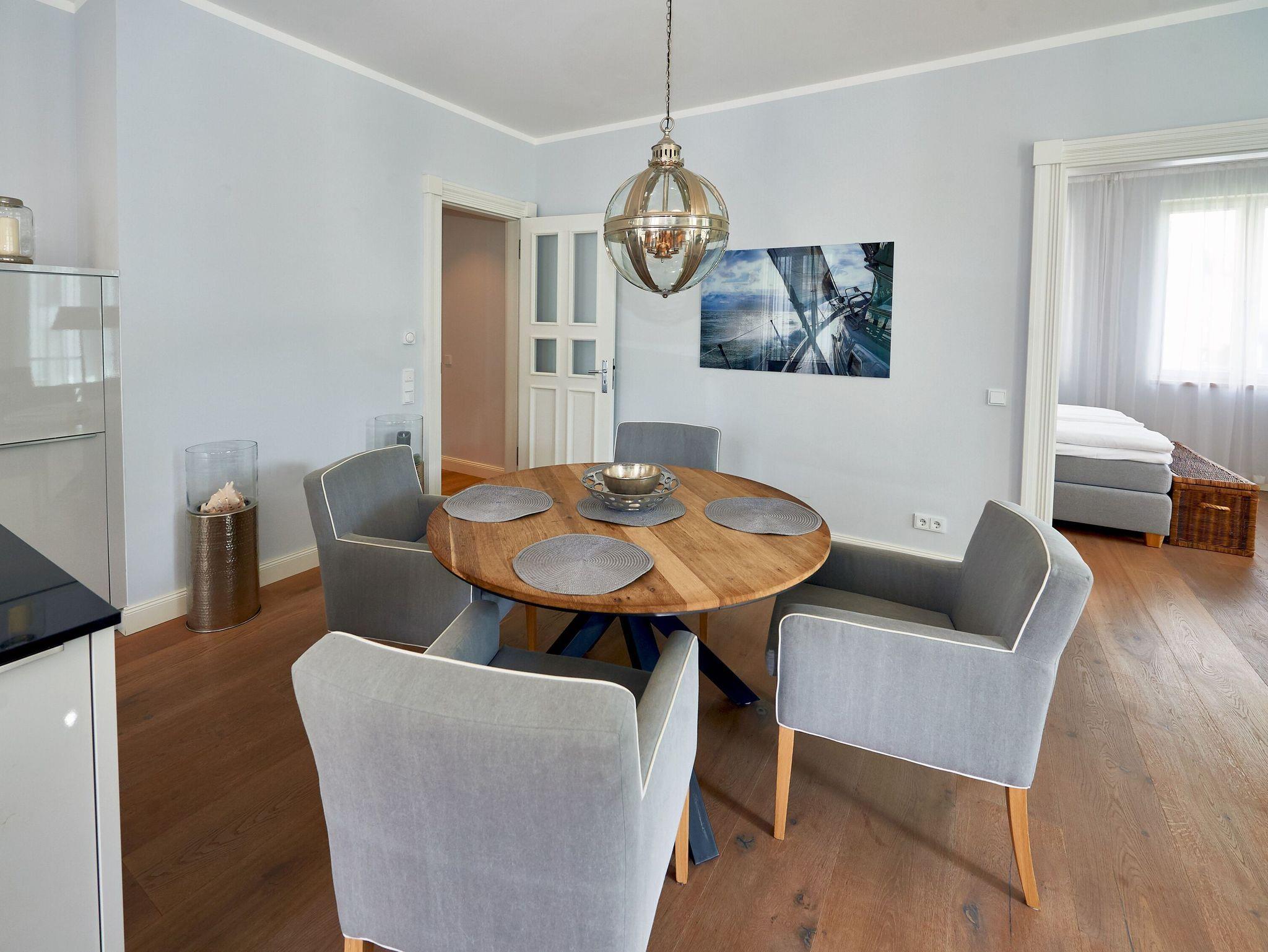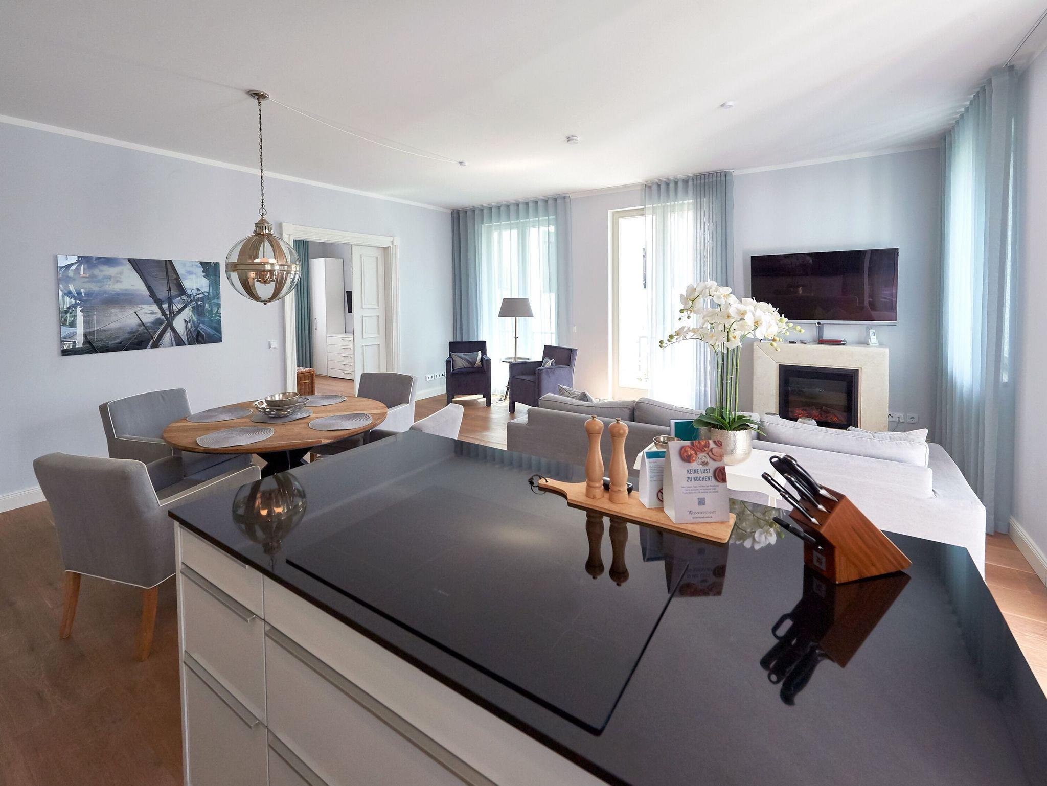 Die Küche mit freistehender Kochinsel, Backofen, Mikrowelle, Kühlschrank, Gefriermöglichkeit, Wasserkocher, Toaster, Kaffeemaschine und allen sonstigen benötigten Utensilien verlockt dazu, doch mal wieder den eigenen Kochkünsten freien Lauf zu lassen. Speisen können Sie dann wahlweise am großen Esstisch im Wohnzimmer oder auf einem der Balkone in der frischen Ostseeluft. Mit einer täglich frischen Küche wartet darüber hinaus direkt im FIRST ein Restaurant auf Ihren Besuch.