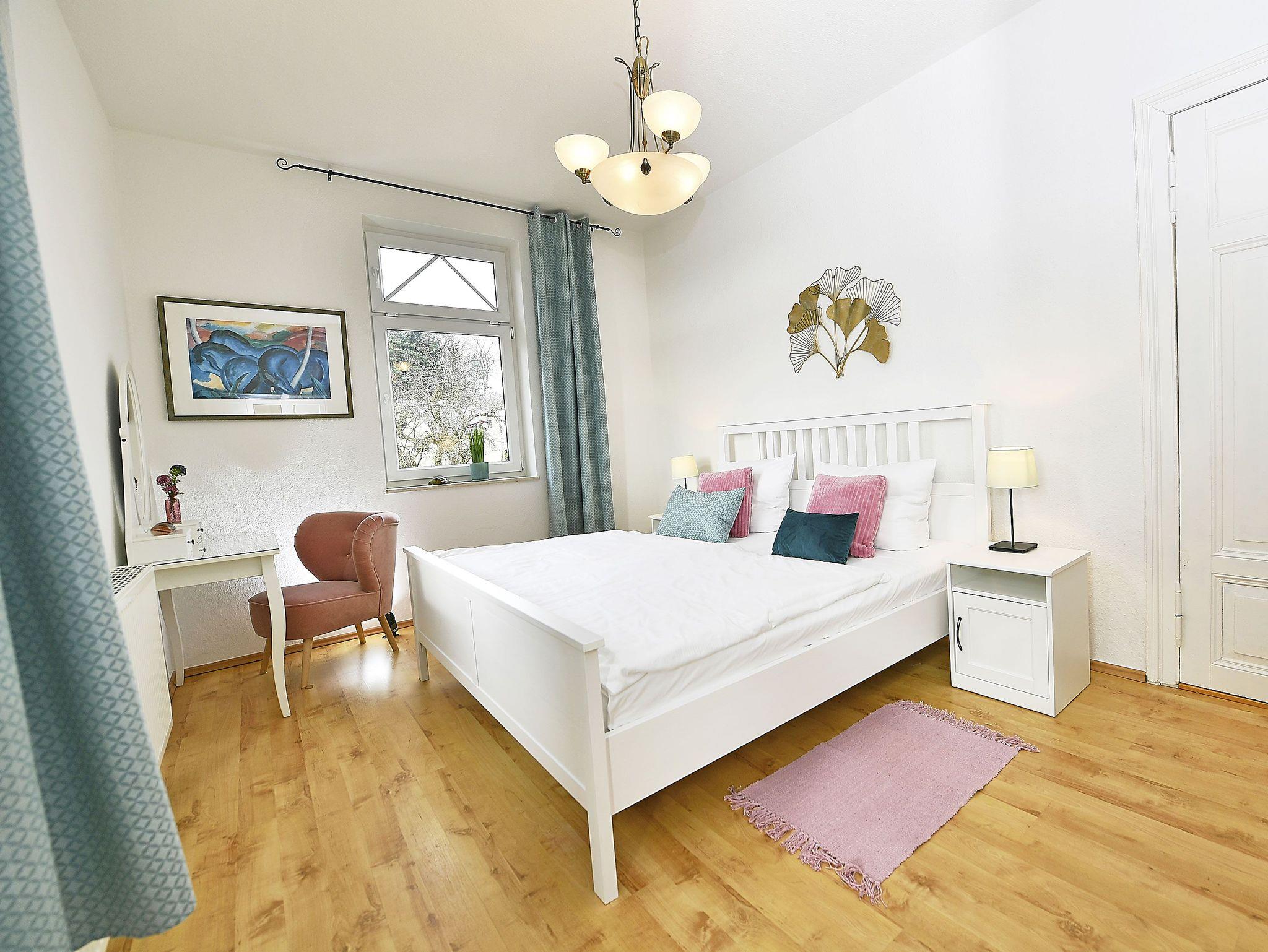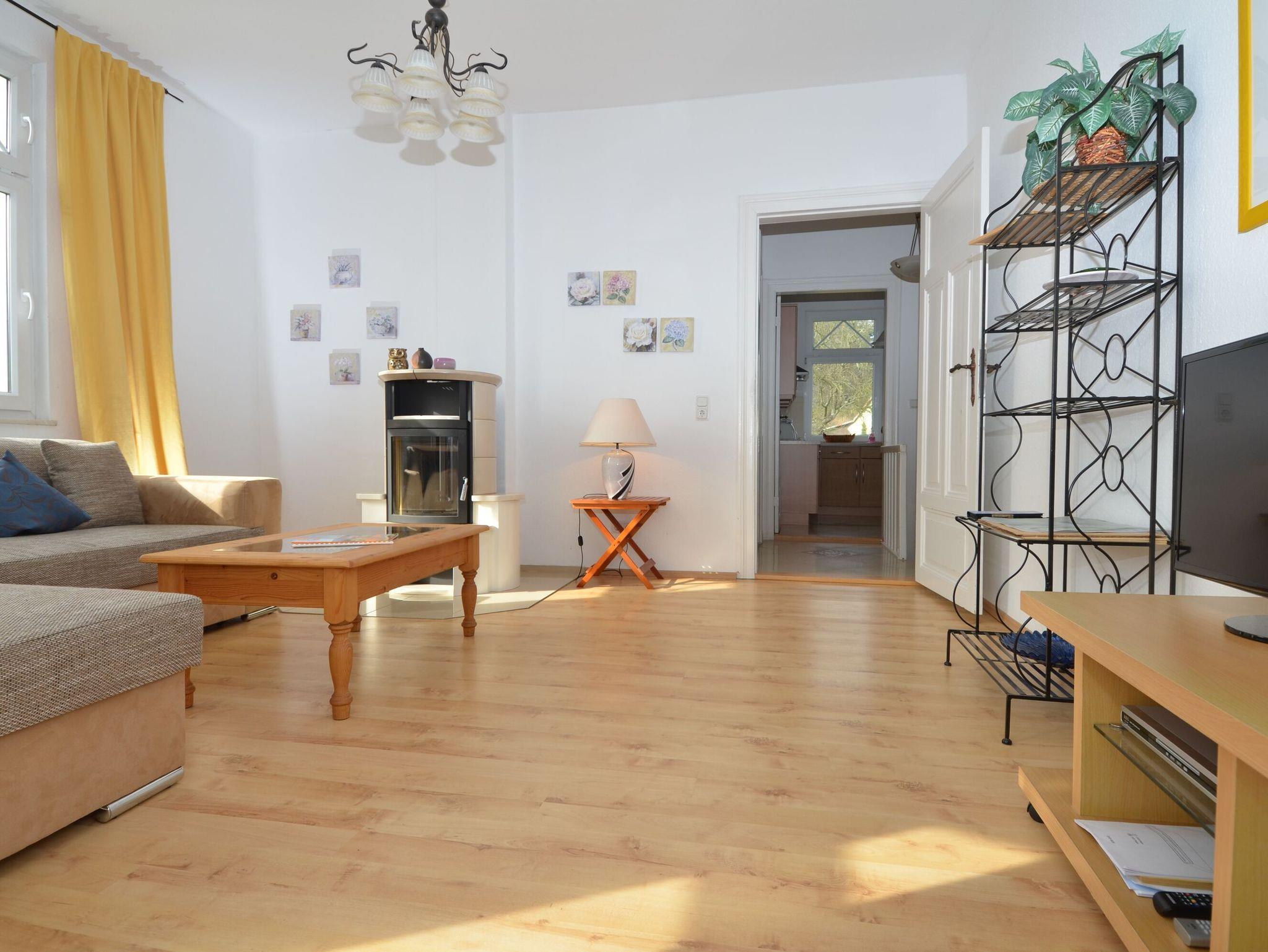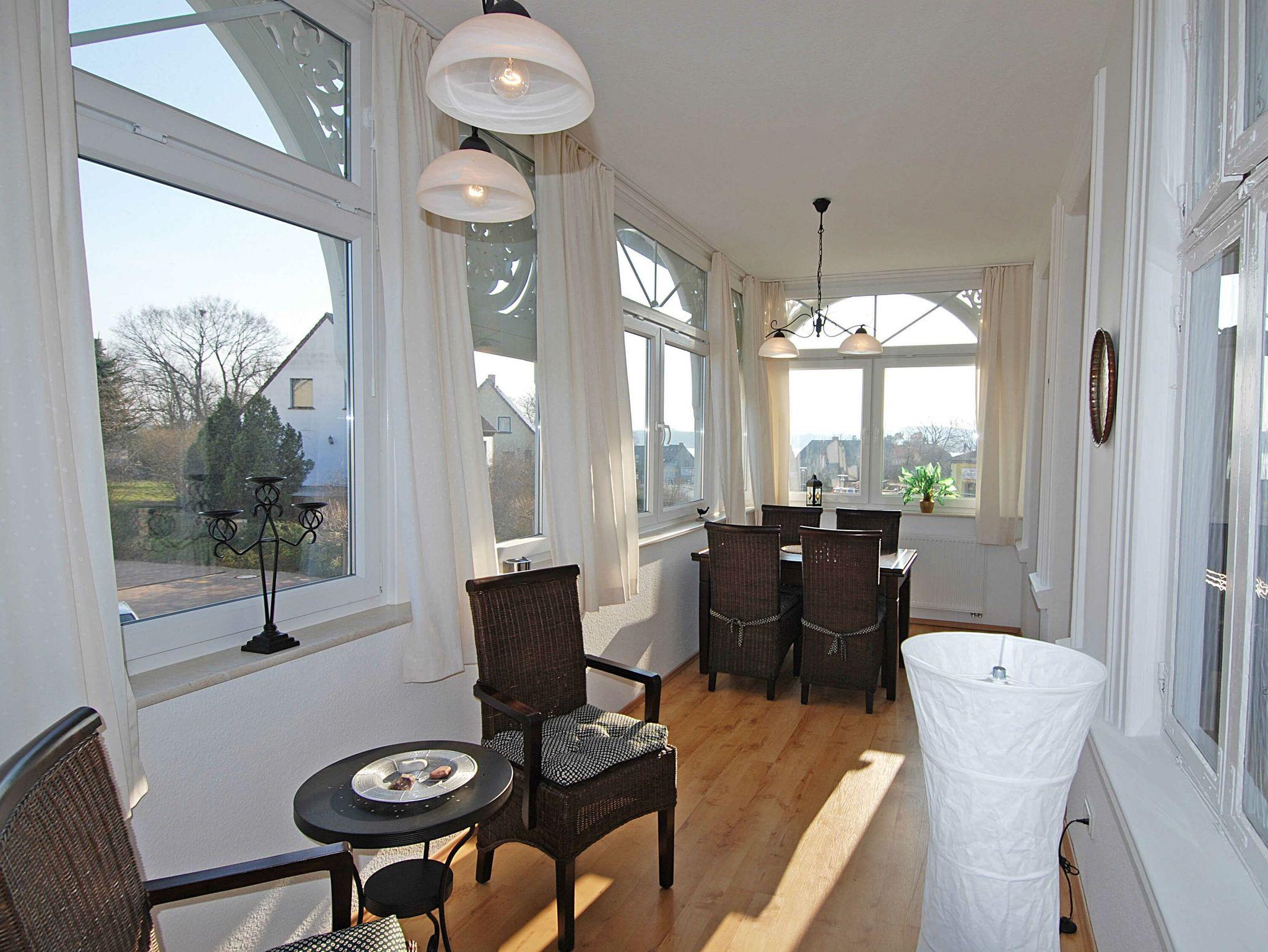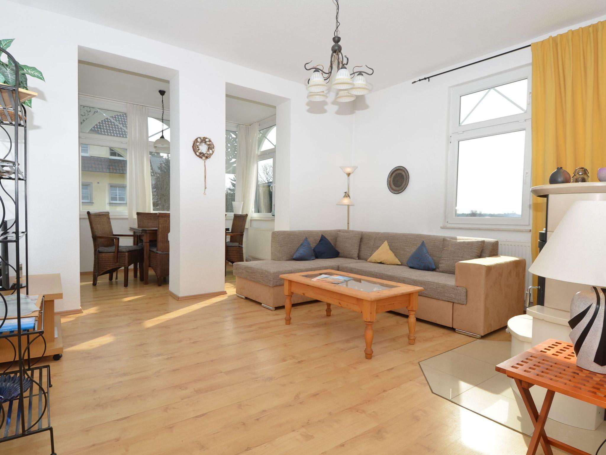 Dieses sehr gemütliche 3-Raum-Appartement verfügt über ca. 95 m² Wohnfläche und befindet sich im Obergeschoss der historischen Bädervilla. Es verfügt über ein großes, helles Wohnzimmer in freundlichen Farben mit einer gemütlichen Sitzecke vor dem Kamin, einem TV und dem Durchgang zur verglasten Loggia im Bäderstil. In der Loggia befinden sich eine kleine Sitzecke und der große Esstisch mit Stühlen für bis 5 Personen.