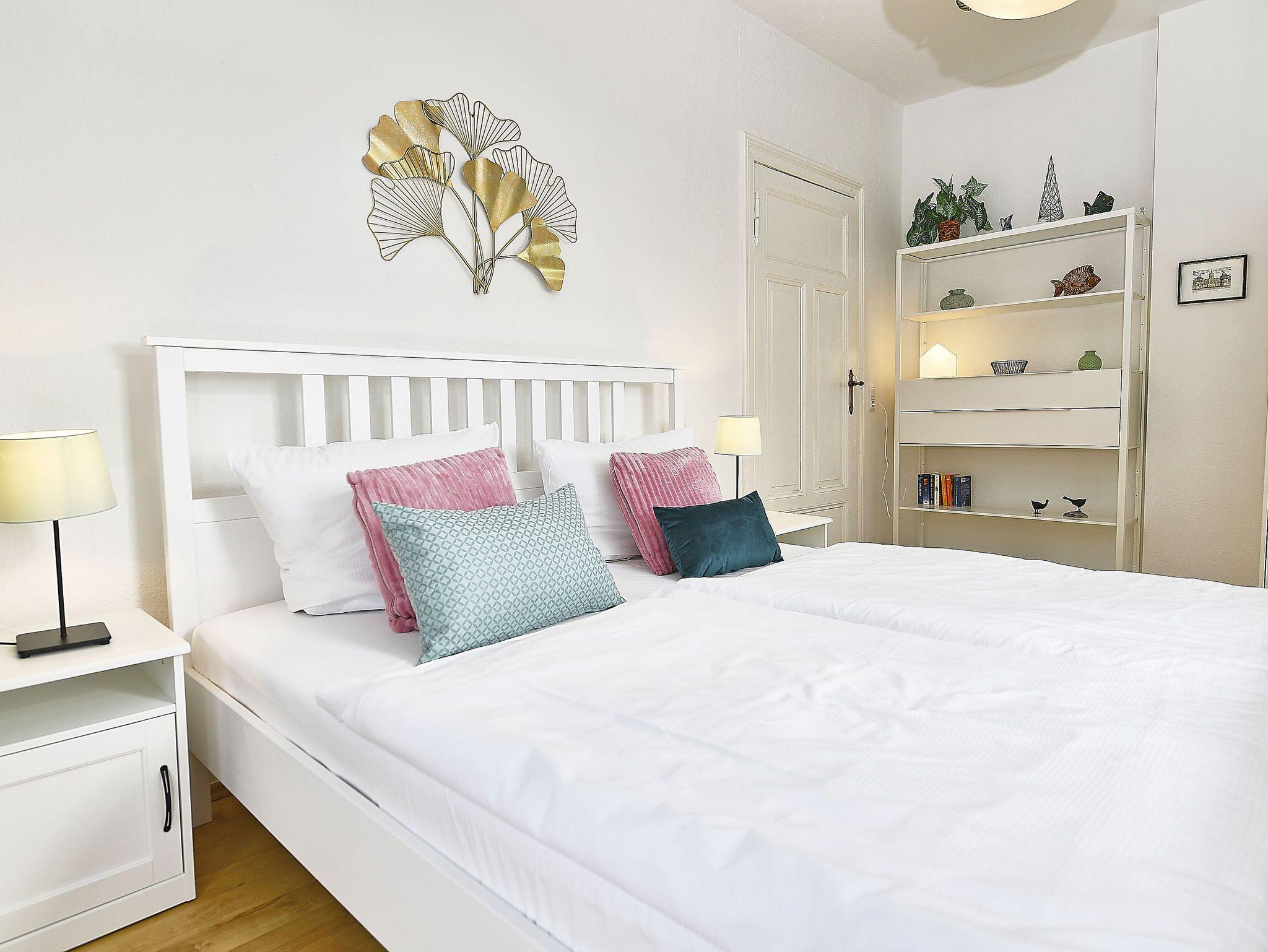 Eines der Schlafzimmer verfügt über ein Doppelbett, ausreichend Platz für Ihre Urlaubsgarderobe und ebenfalls einen Durchgang zur verglasten Loggia. Das zweite Schlafzimmer verfügt über ein Doppelbett und ist verbunden mit dem Turm des Hauses, in dem ein Einzelbett steht.