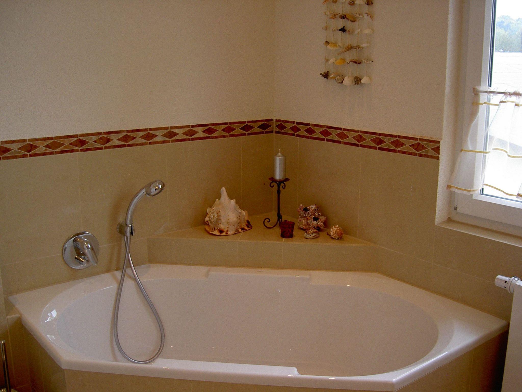 Das große Badezimmer ist mit Dusche, WC und einer formschönen Badewanne eingerichtet.
